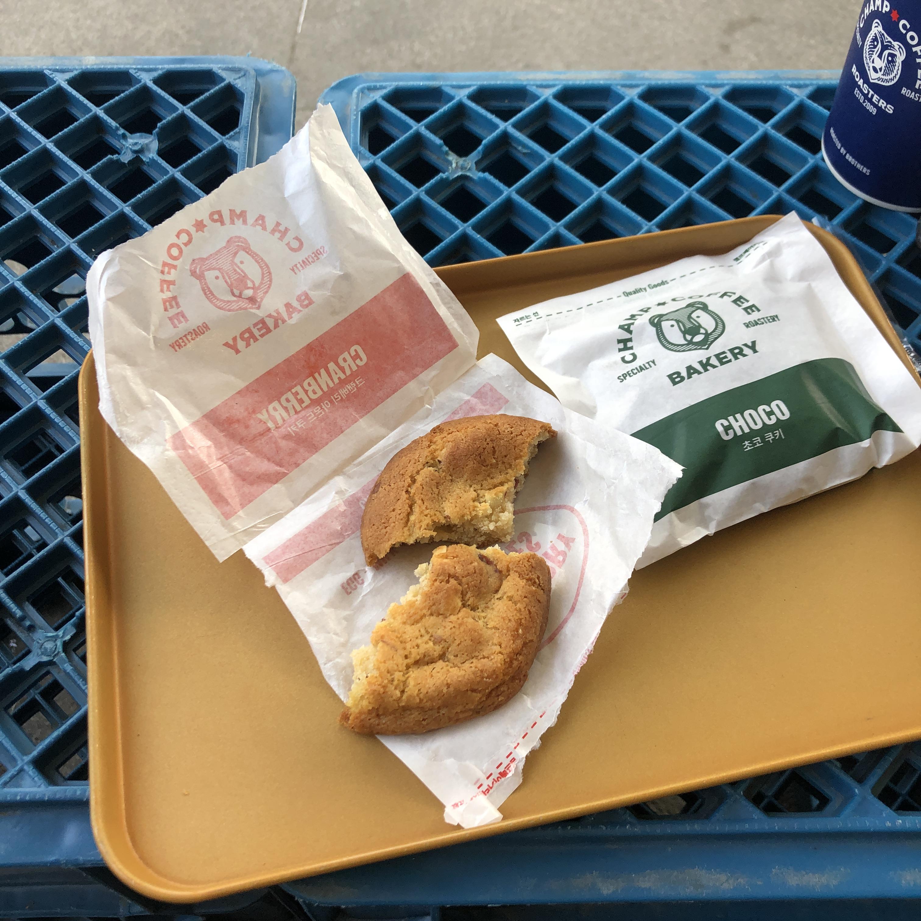 쿠키 가격은 2,500원씩입니다. 사이즈가 앙증맞고 도톰하고 꾸덕한 스타일의 쿠키입니다. 쿠키를 집어 들었을 때 차가워서 '뭐지?' 했는데 먹어보니 시원해서 더 맛있게 느껴졌습니다. 씁쓸하고 담백한 챔프커피와 참 잘 어울렸습니다. 을지로커피와는 달달 조합이라 조금 부담스럽더라고요.