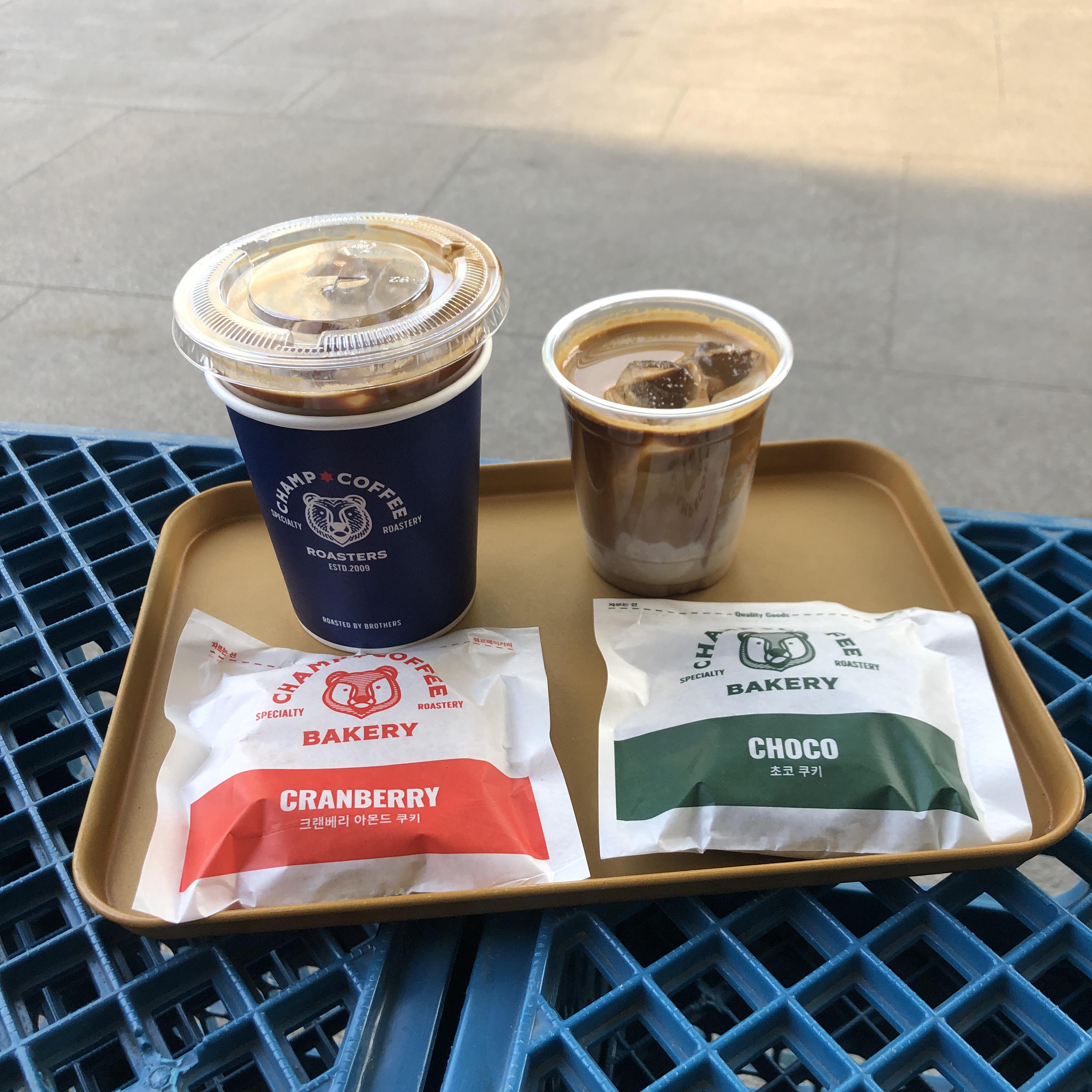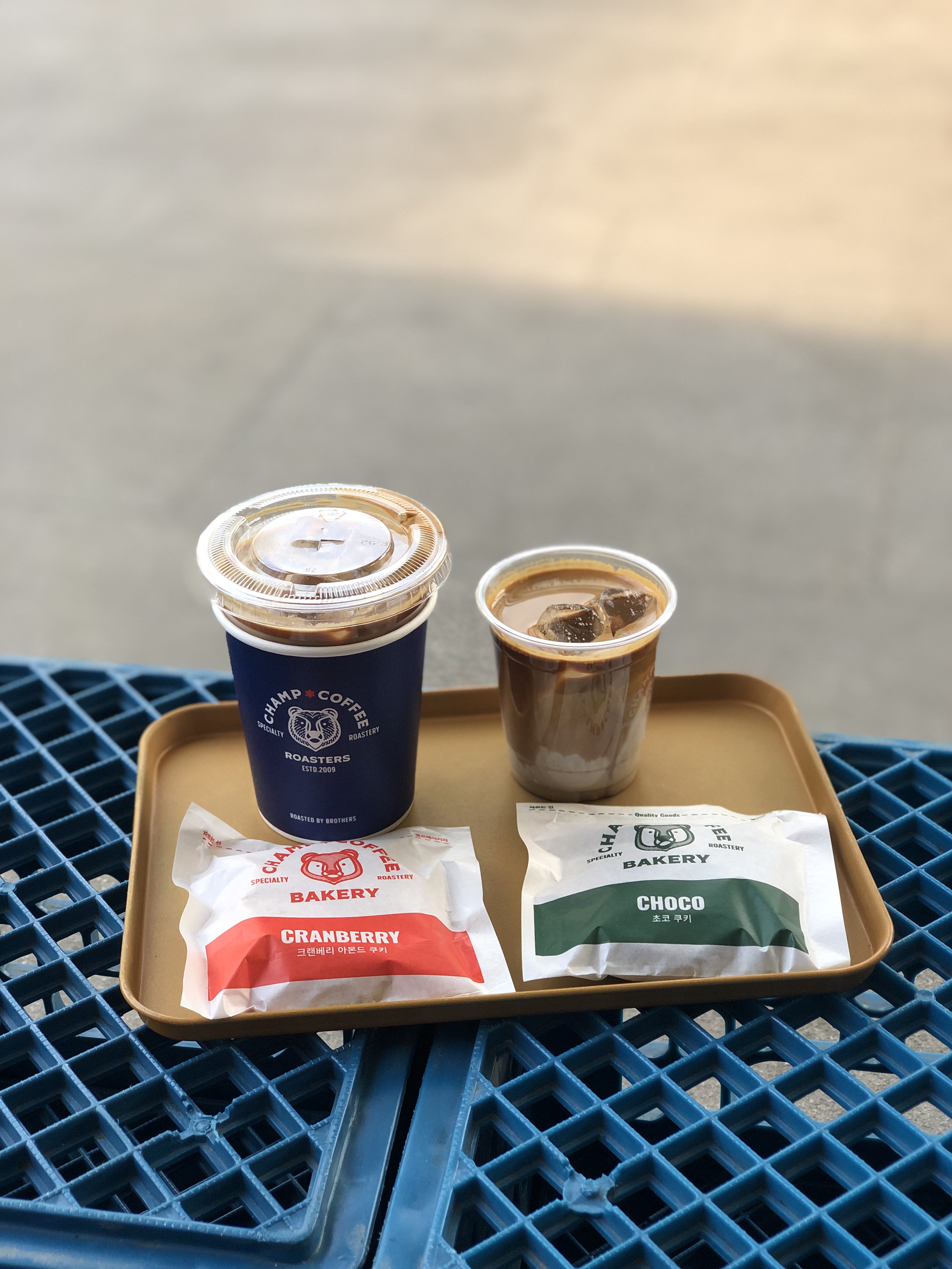 저희는 시그니처 메뉴인 챔프커피와 달달한 을지로 커피를 주문했습니다. 쿠키는 초코와 크랜베리를 한 개씩 주문했습니다.