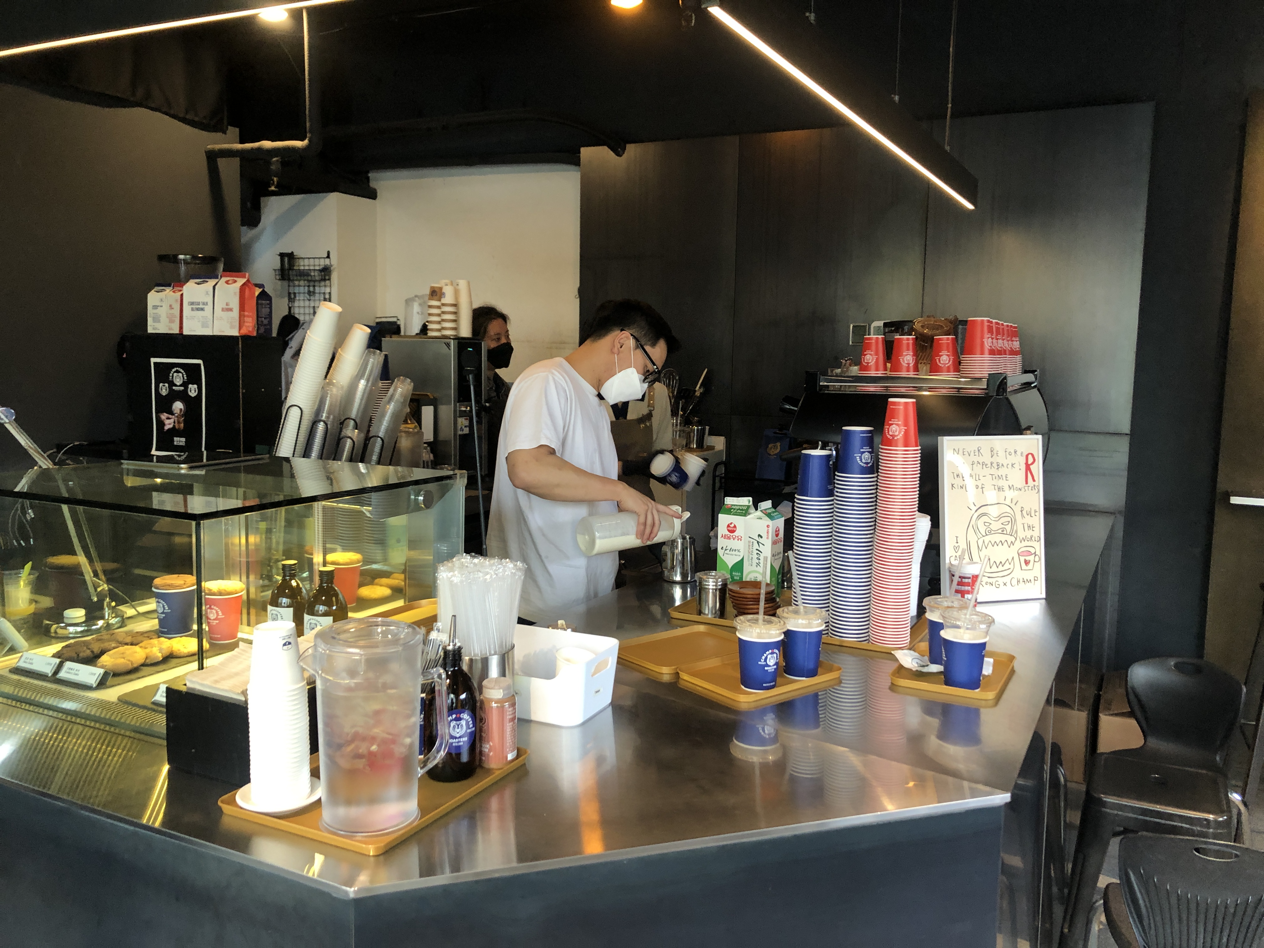 카페에 도착해서 QR체크인부터 했습니다. 평일인데도 사람이 꽤 많아서 주문 전 자리를 먼저 잡아야 했습니다. 매장 안은 넓은 편은 아니었습니다. 야외 테이블이 있어서 저희는 매장 밖에 자리를 잡고 주문을 하러 카운터로 갔습니다.