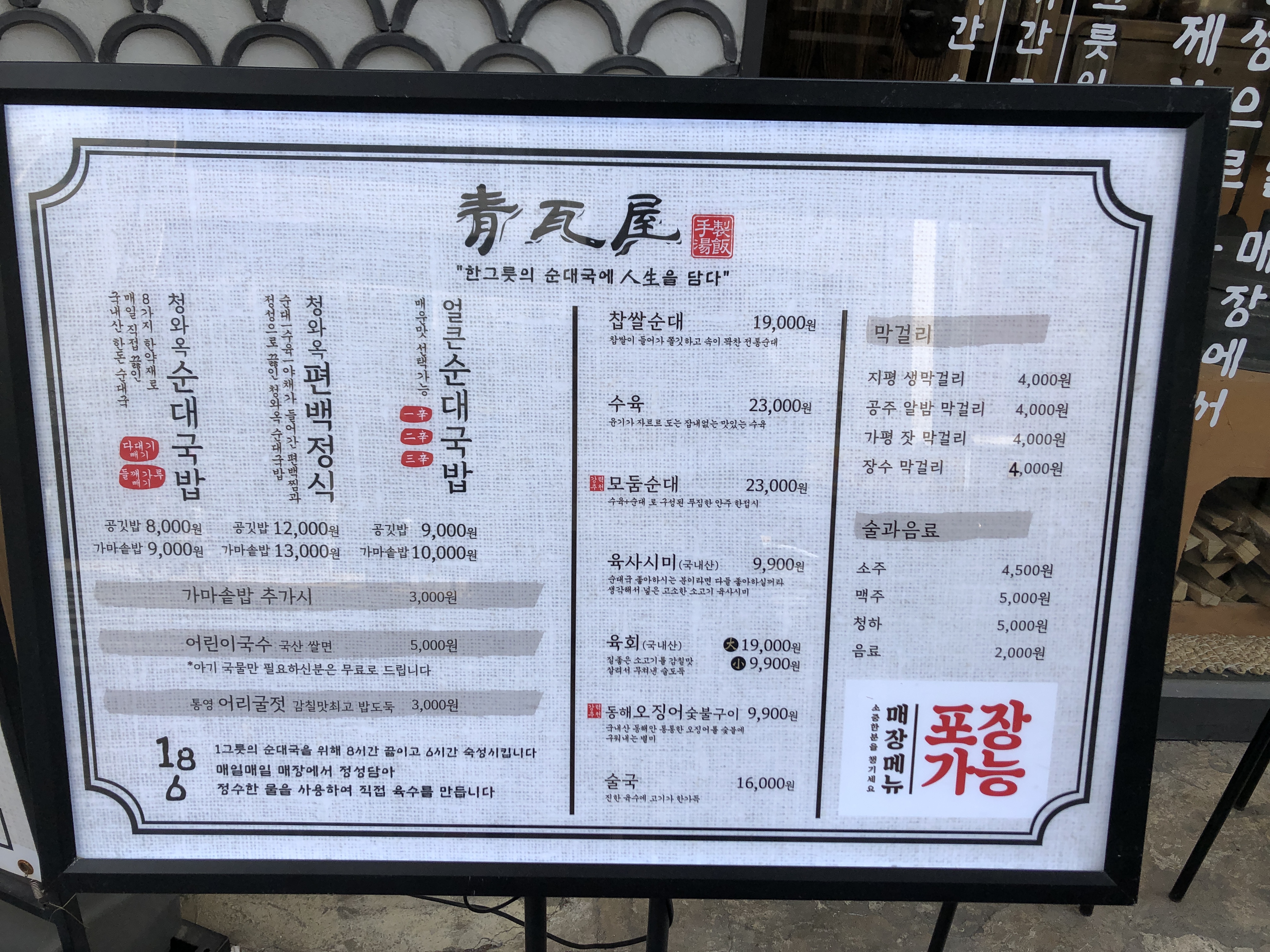 안주 메뉴로 찹쌀순대, 수육, 모둠순대, 육사시미, 육회, 오징어 숯불구이, 술국 등이 있습니다. 그리고 전 메뉴 포장이 가능하다고 합니다. #청와옥추천메뉴 #청와옥가격 #청와옥순대국