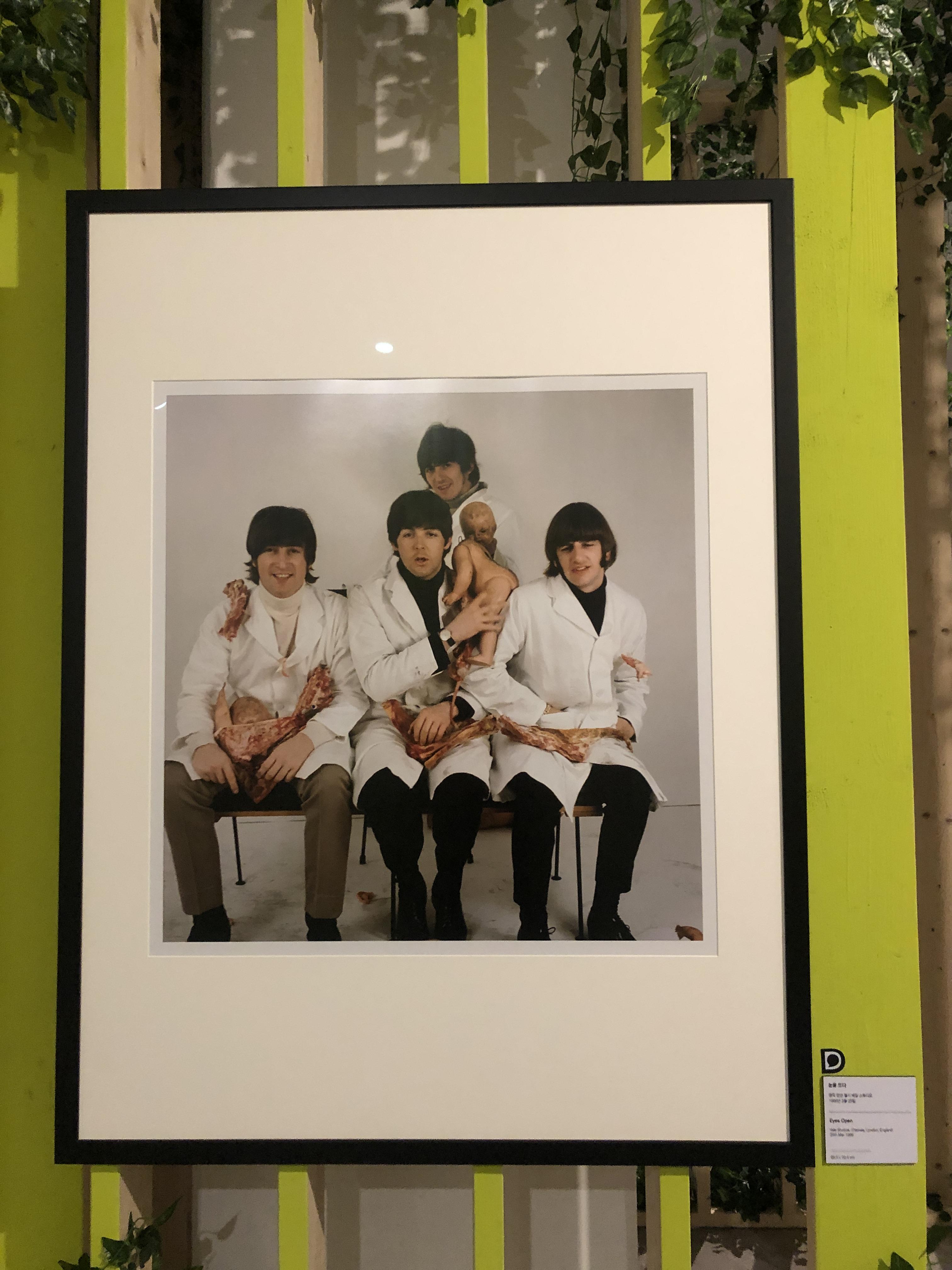 당시 논란이 됐던 사진들도 볼 수 있었습니다. 특히 정육점 컷이라고 이름 붙은 이 사진은 비틀즈가 흰 가운을 걸치고 고깃덩어리를 두르고 있는 모습이 인상적입니다. 당시 비틀즈를 신격화된 존재로 바라보는 팬들을 보고, 비틀즈도 피와 살로 이뤄진 평범한 인감임을 표현하기 위해 이런 사진을 찍었다고 합니다.