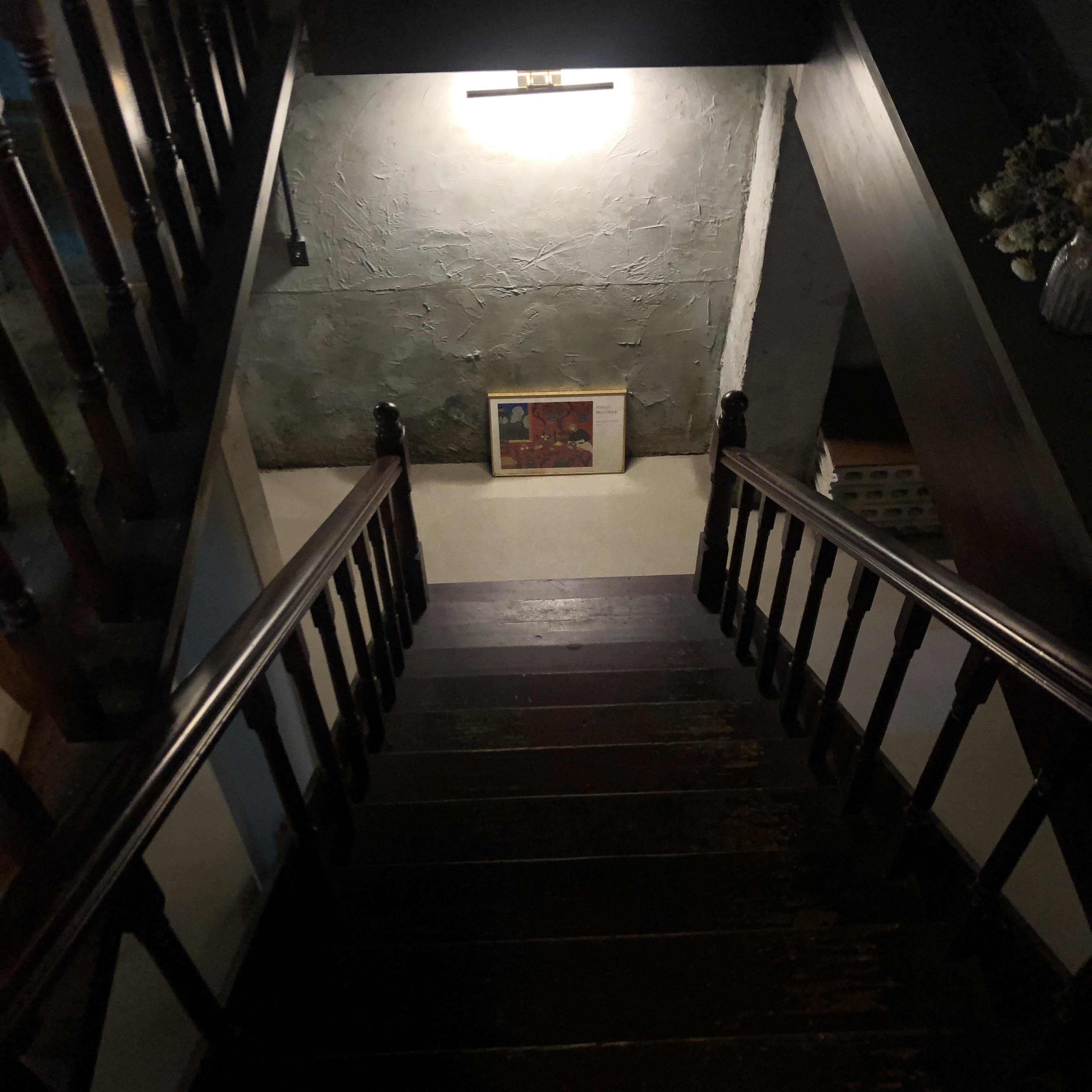 계단을 따라 내려가면 넓고 쾌적한 지하 공간이 있습니다. 조용히 대화 나누기 좋아 보였습니다.