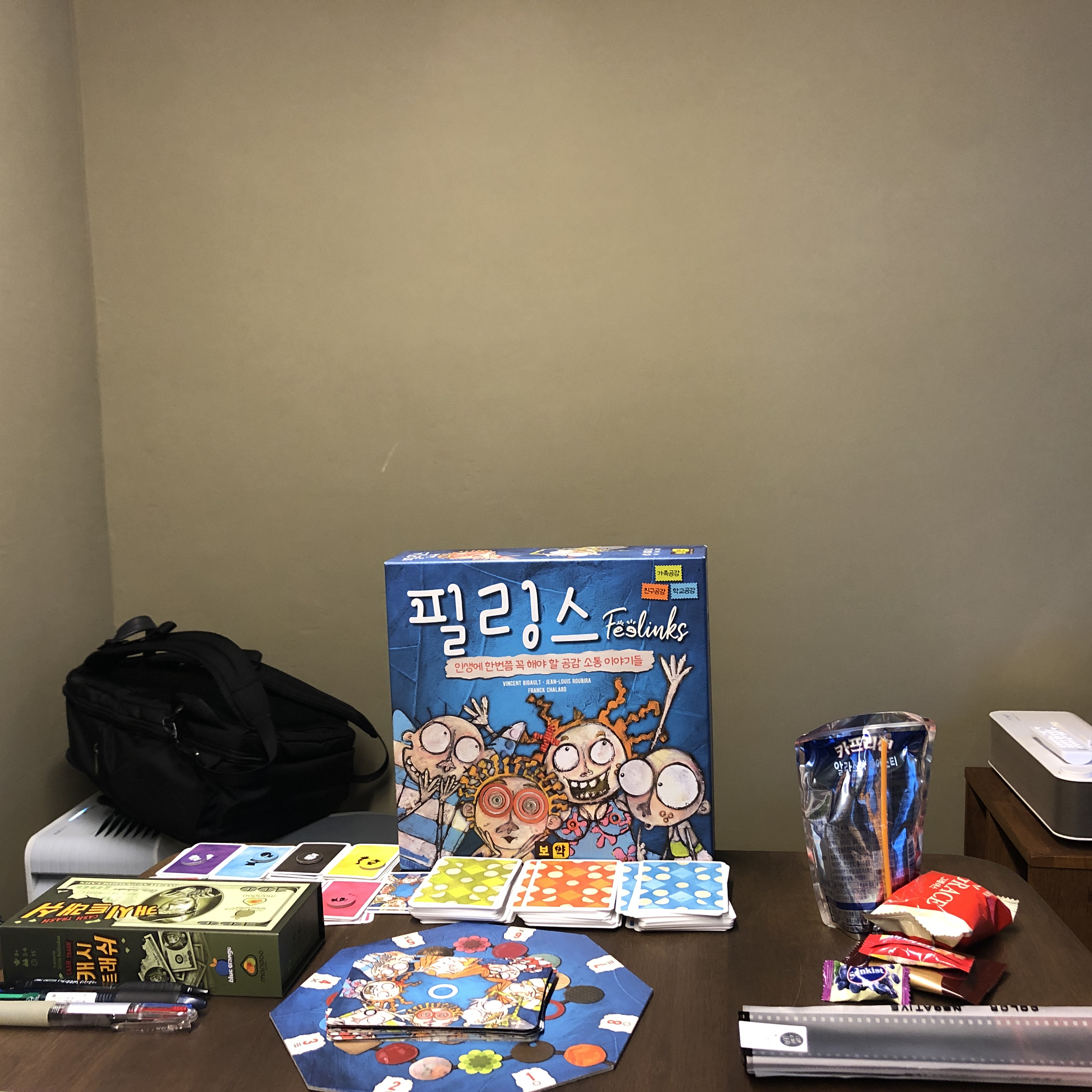 메인 게임으로는 '필링스'라는 보드게임을 했습니다. 각자의 감정을 공감 소통할 수 있어서 참 재미있는 게임이었습니다. 필링스 보드게임을 하면서 게스트분들과 금세 친해지게 되었습니다. 그리고 이 게임에서 공동 1등을 하게 되어서 상품으로 초콜릿을 득템 했습니다. 꺄르!!!