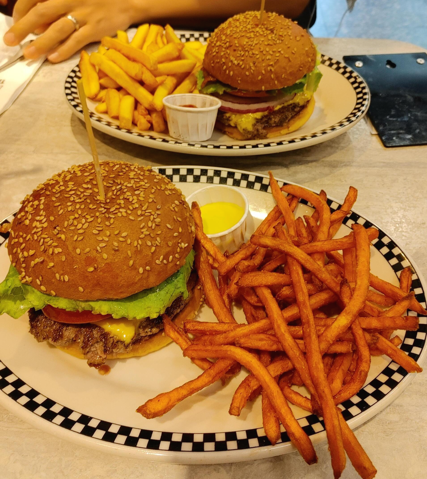 비주얼도 좋지만 맛도 정말 좋았다. 빵 자체도 맛있고 고기 패디 굽기도 적당하고 감칠맛도 좋았다. 야채도 신선했고 특제소스랑 조화로웠다. 고구마튀김은 완전 내 취향 저격이었다. 감자튀김은 우리가 아는 딱 그 맛이었고 케첩을 기본으로 준다. 고구마튀김은 머스터드 소스를 기본으로 준다.