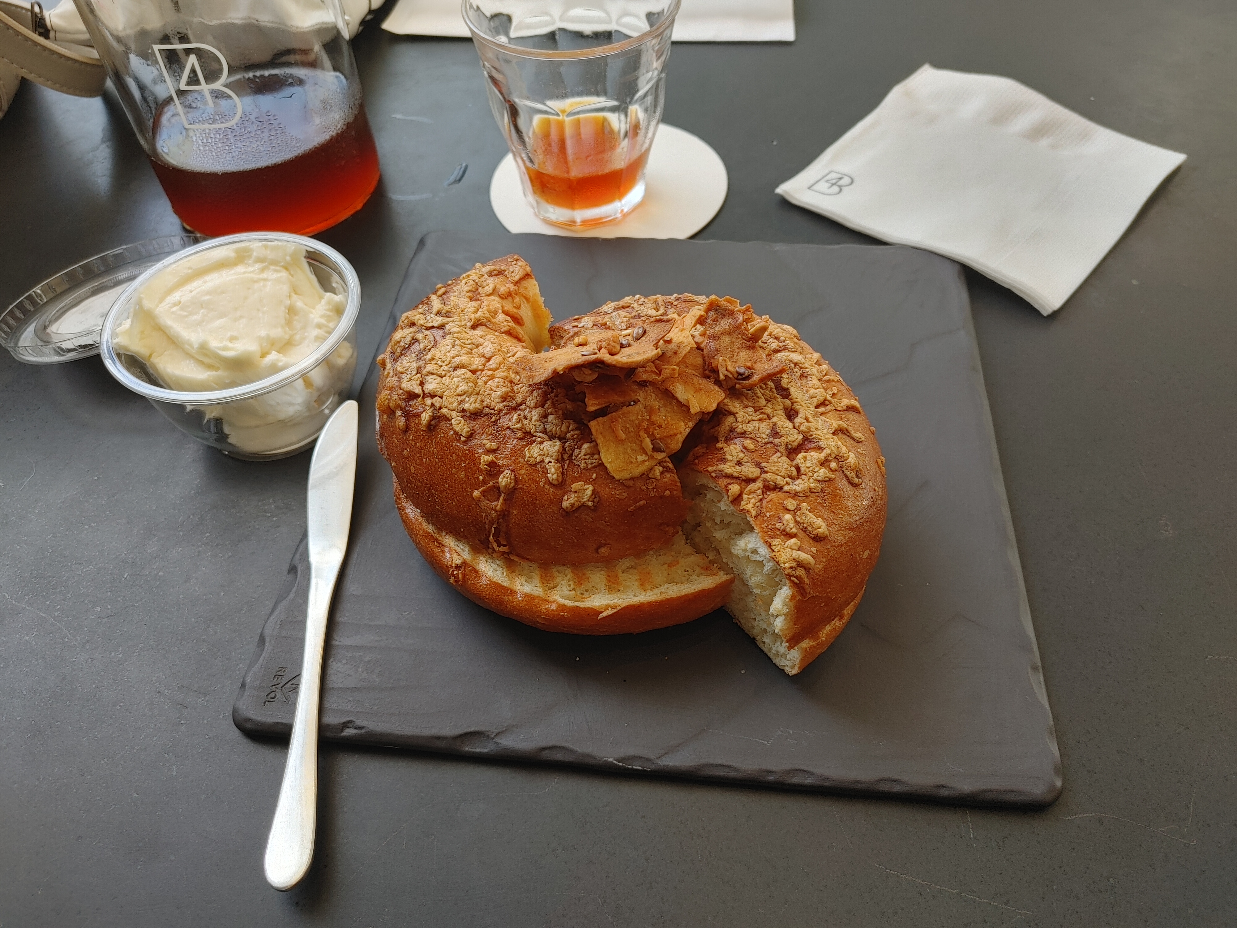 그리고 기대 이상으로 맛있었던 베이글! 포비는 베이글 맛집인 게 분명하다. 볼케이노 베이글과 크림치즈를 주문했는데 정말 맛있었다. 사진만 봐도 군침 뚝뚝!!! 볼케이노 베이글은 멕시칸 쉬레드 치즈를 올려 짭짤하면서도 고소함을 느낄 수 있는 베이글이었다. 크림치즈 스프레드는 2,000원이라 다소 비싼 느낌이 들긴 했지만 베이글에 발라 먹으니 환상 조합이었다. 진짜 맛있었다. 완전 추천!!!