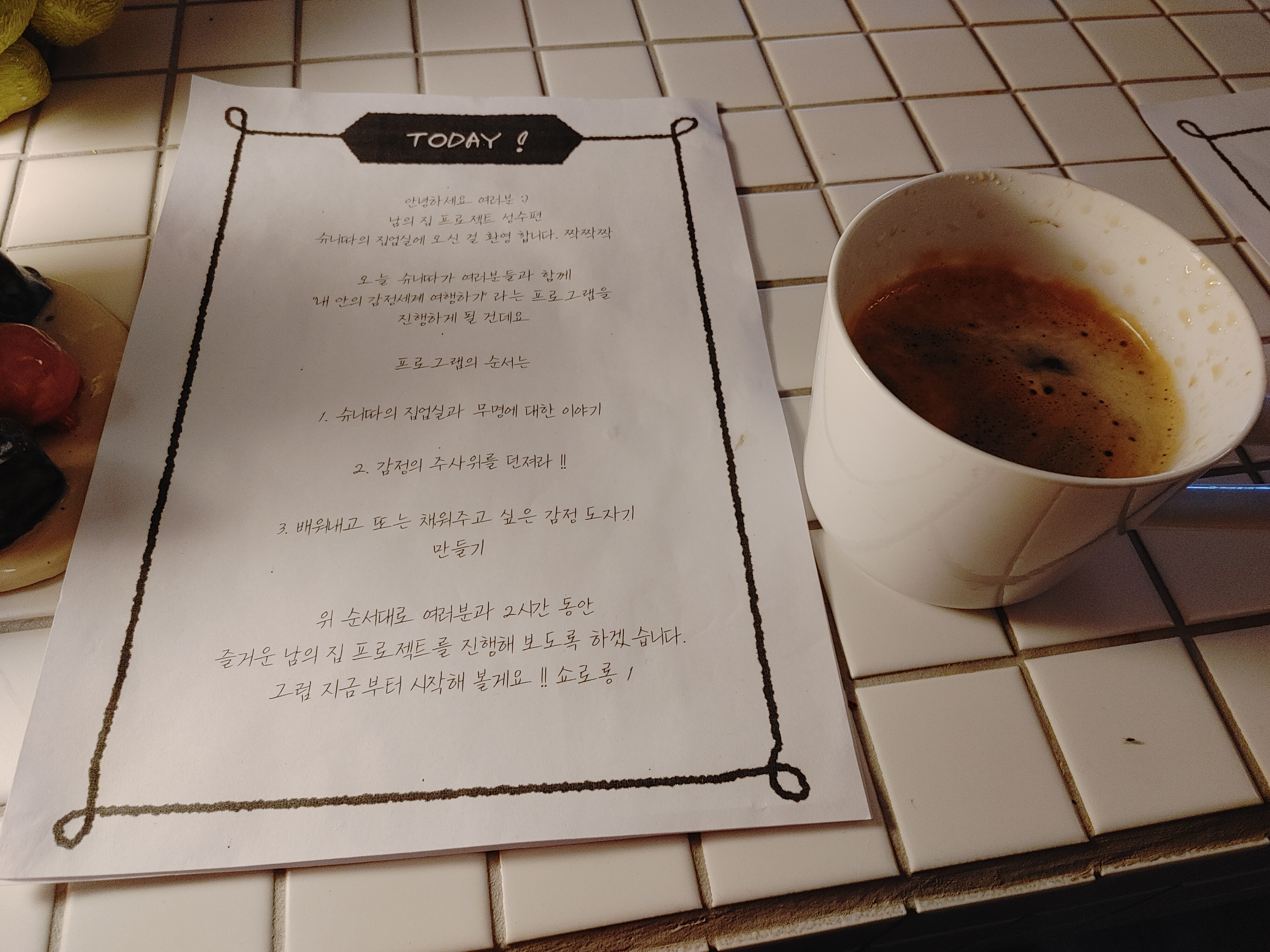오늘은 남의집 서포터즈 3기 마지막 활동이었습니다. 이번 남의집은 '내 안의 감정 세계 여행하기'라는 타이틀의 프로젝트였습니다.