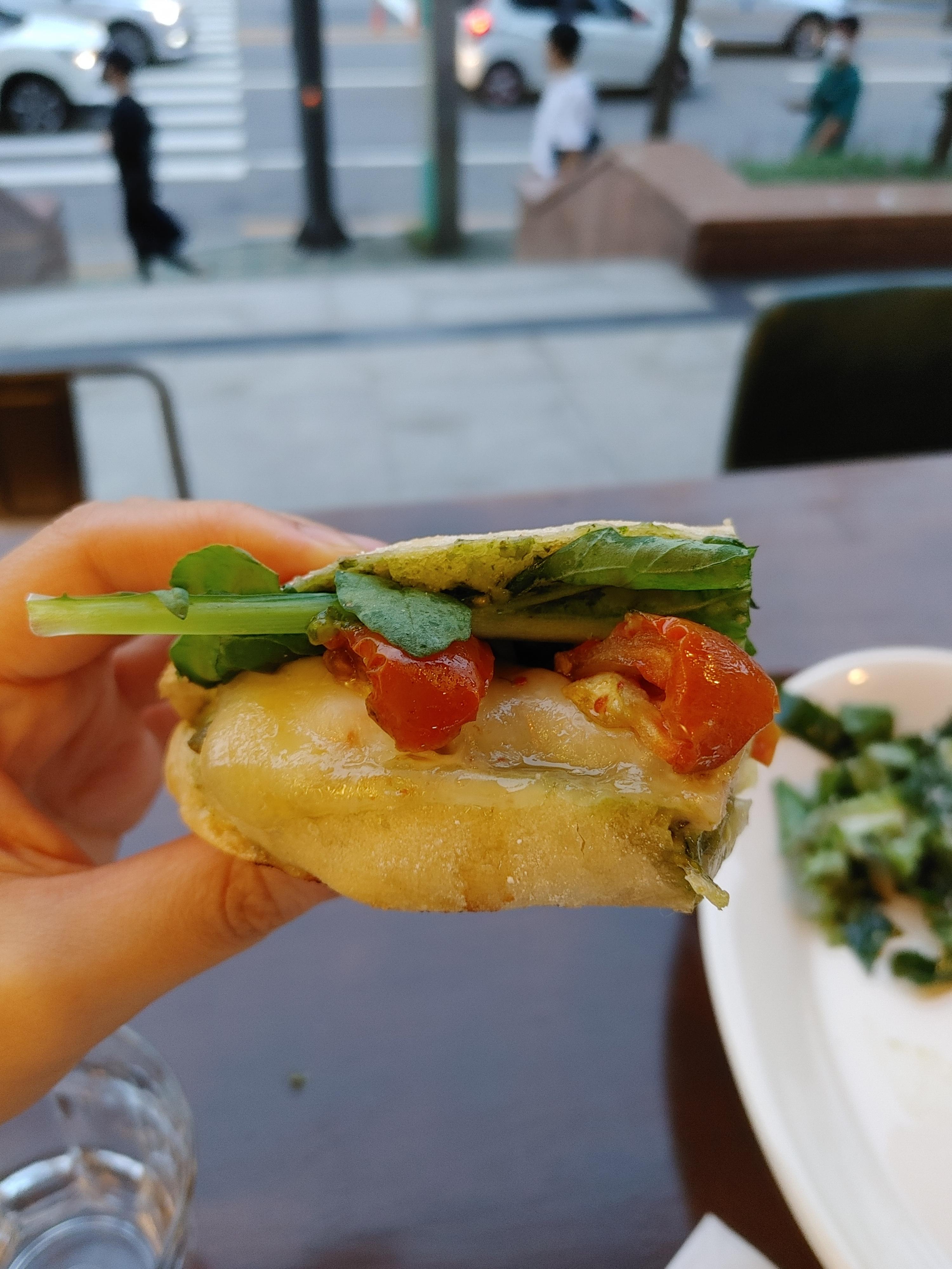 바질 페스토 치킨 샌드위치는 수비드 닭가슴살과 바질 페스토, 치즈와 토마토, 루꼴라 등 다양한 속재료로 채워져 있었다. 아주 먹음직스럽고 든든한 샌드위치였다. 바질 좋아하는 나로서는 진짜 취향 저격당한 메뉴였다. 빵도 사워도우로 건강하면서도 식감이 좋고 맛있었다.
