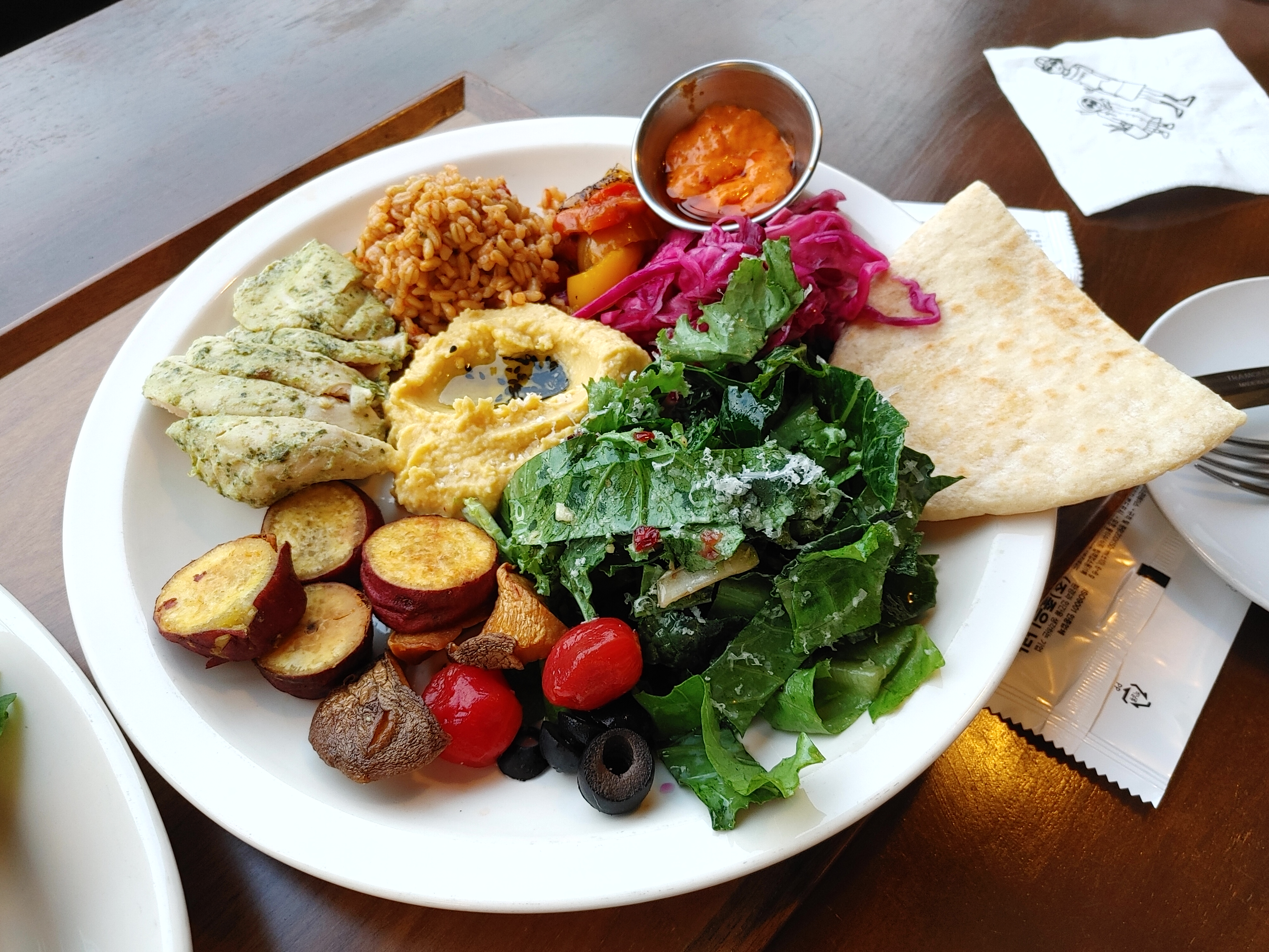 하리사 치킨 샐러드 플래터는 하리사 수비드 닭가슴살과 치폴레 마요네즈, 토마토 현미밥, 구운 채소, 적채 절임, 구운 고구마, 구운 방울토마토, 견과류, 올리브, 신선한 채소와 빵 등으로 구성되어 있었다. 구성이 매우 알차고 하나하나 너무 맛있었다. 특히 가운데 있는 노란색 음식은 병아리 콩을 갈아 만든 후무스라는 것인데 엄청 부드럽고 이국적인 맛이 나면서도 맛있었다.