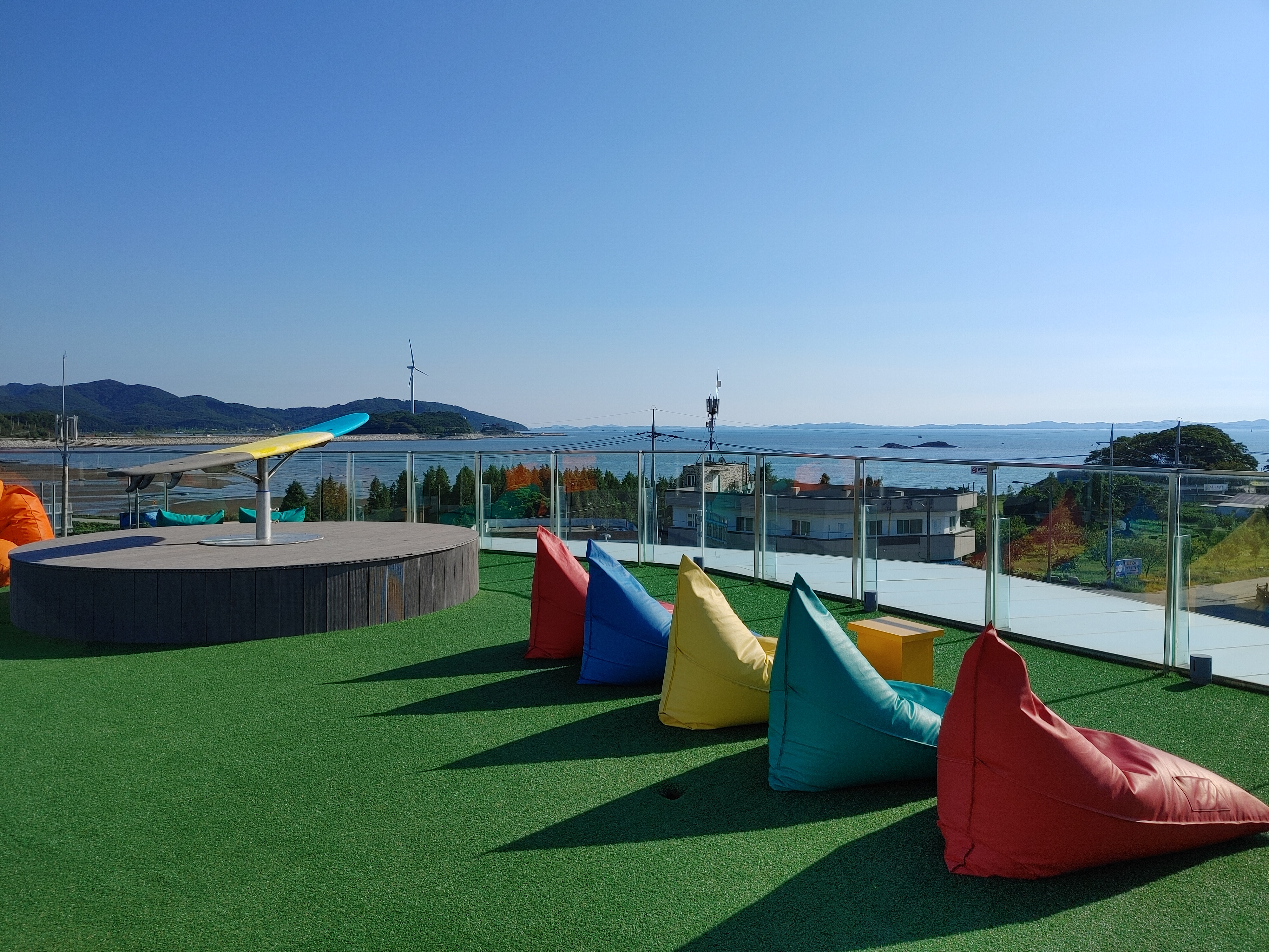 옥상에서 내려다본 마당도 무척 예뻤다. 파라솔도 알록달록 예쁘고, 바다 전망 의자도 알록달록 너무 예쁨!!!