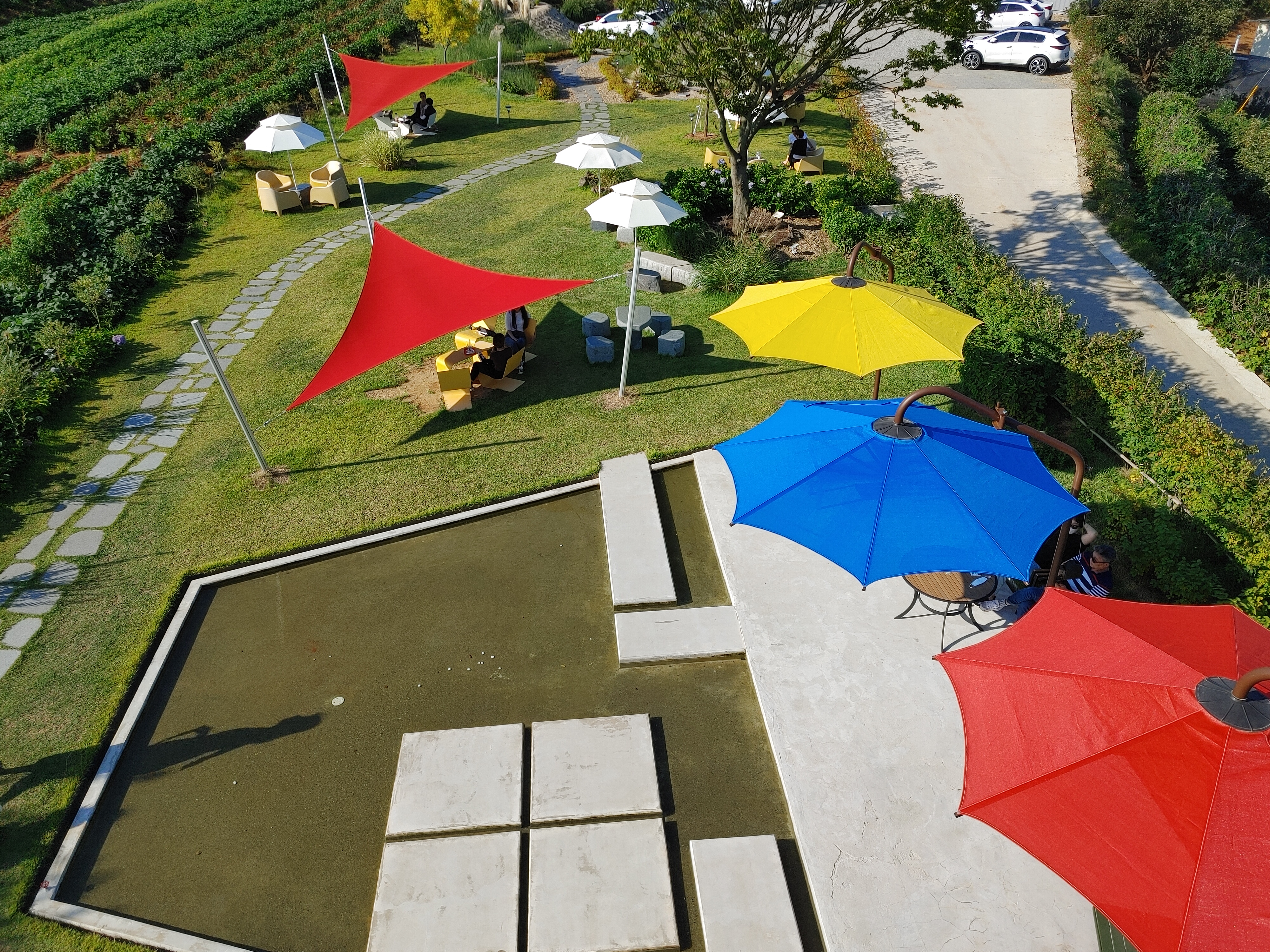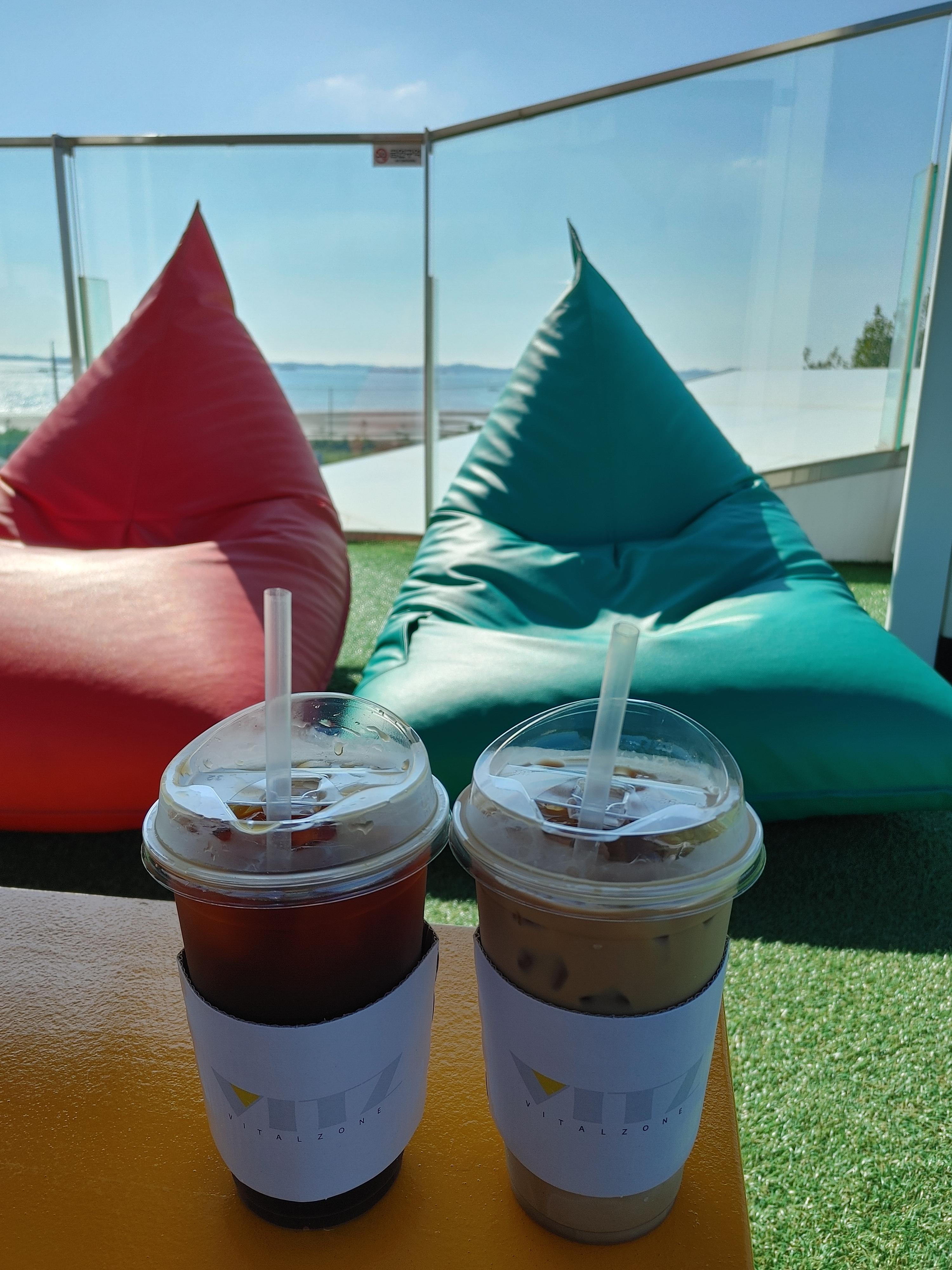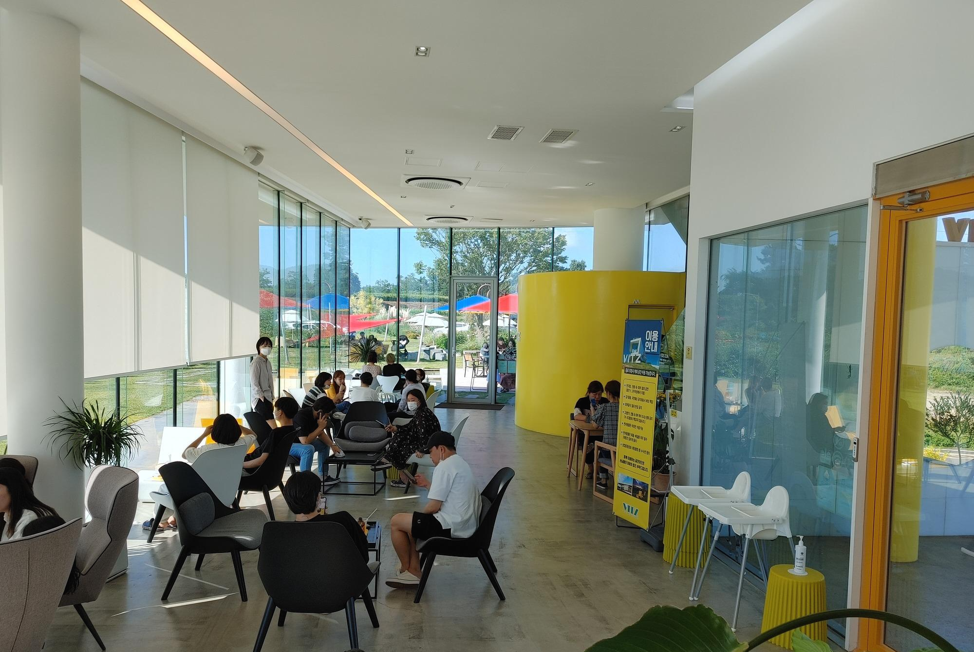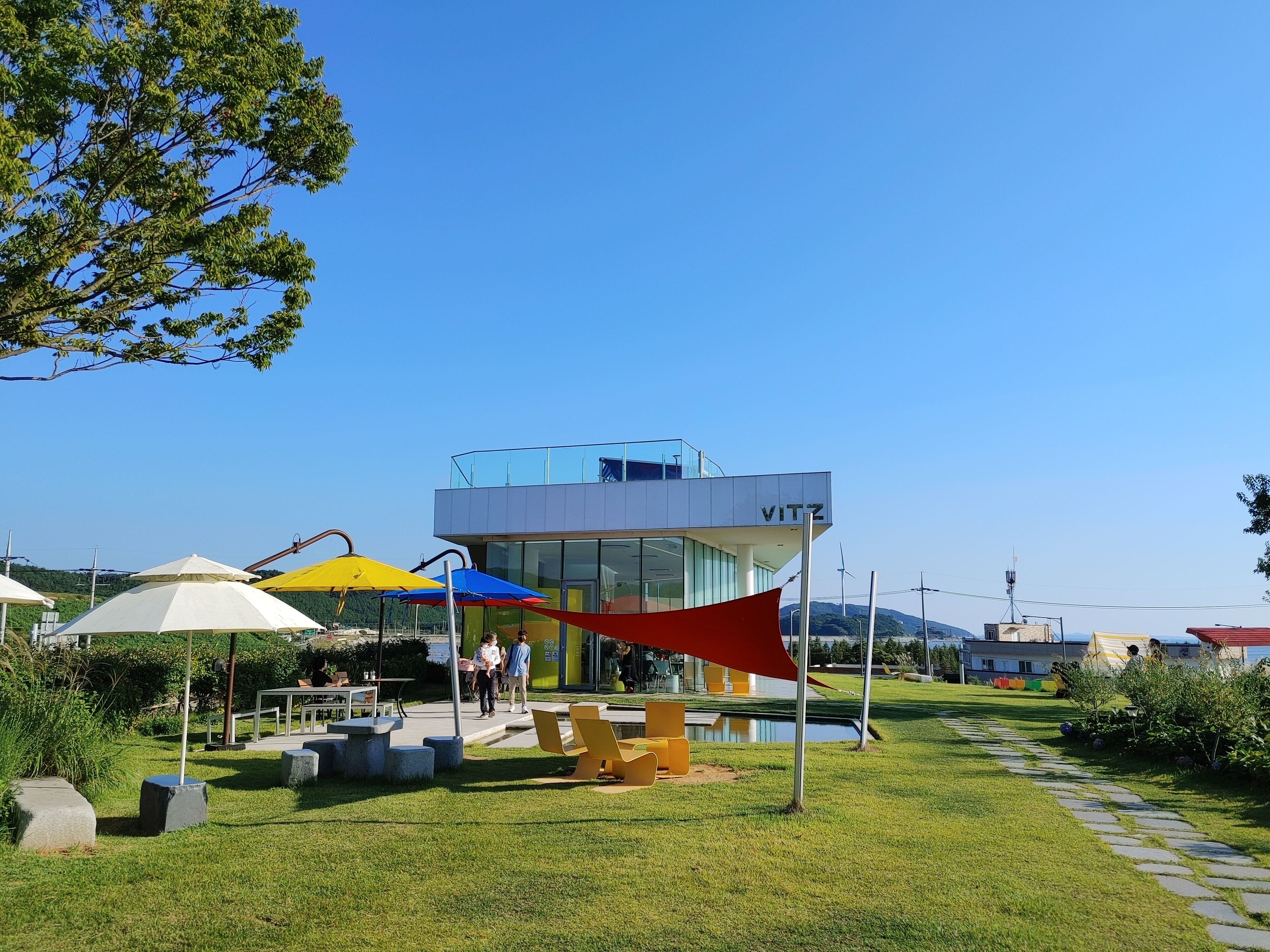 건물은 흰색이고 통유리였다. 건물 안에서 오션뷰 감상할 수 있지만 한낮의 햇살이 너무 따가워서 블라인드 쳐져 있었음. 날이 아주 좋은 날 방문했더니 초록초록한 잔디, 파란 하늘, 푸른 바다까지 아주 그냥 모든 게 완벽했다. 조경 및 야외 테이블도 잘 되어 있어서 선선해진 가을날 밖에서 여유 만끽하기 딱 좋았다. 뜨거운 햇살 피할 수 있는 파라솔도 있고 인생 샷 건질 수 있는 포토존도 있었음.