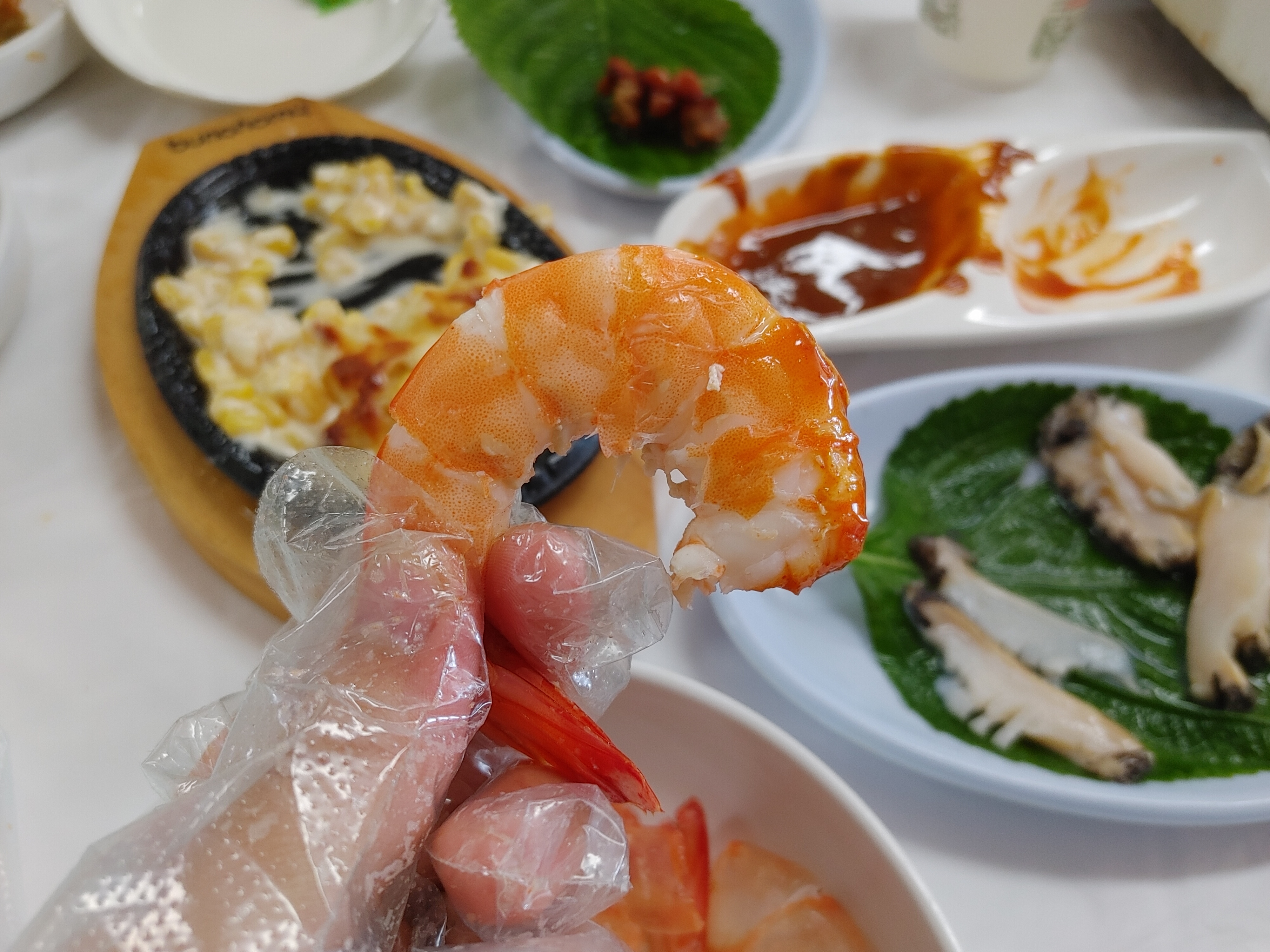그리고 목장갑 + 비닐장갑을 끼고 본격적으로 대하 사냥을 시작했다. 난 대하 껍질 벗기기에 꽤 재능이 있는 듯. 맛은 두말할 것도 없이 최고였다. 너무너무 맛있었다!!! 살이 어찌나 통통한지 입안이 꽉 찼다.