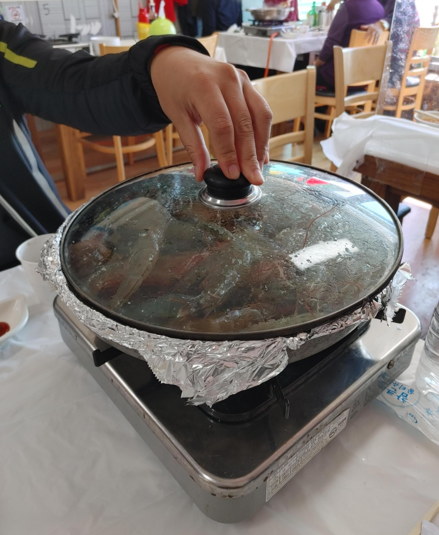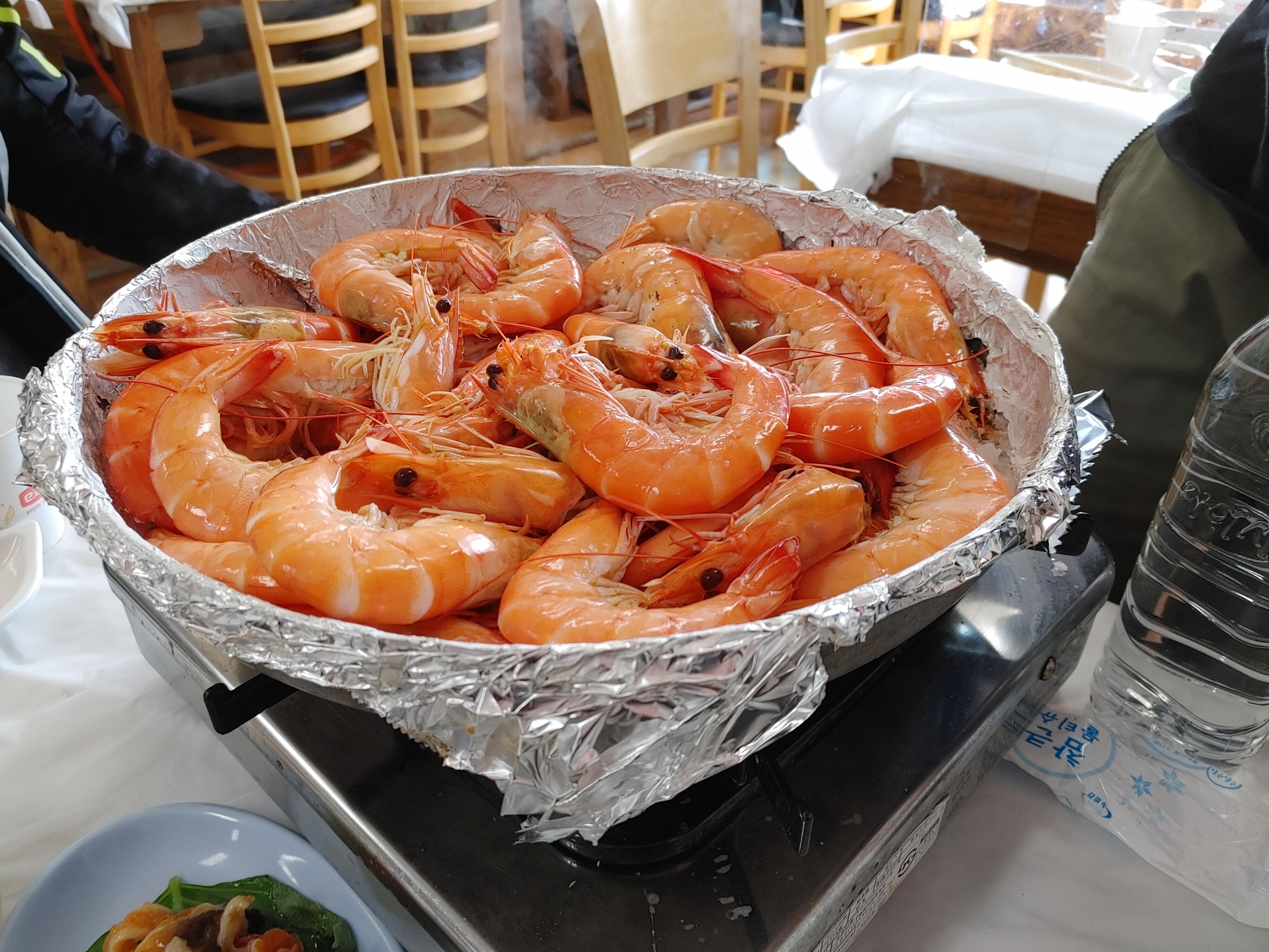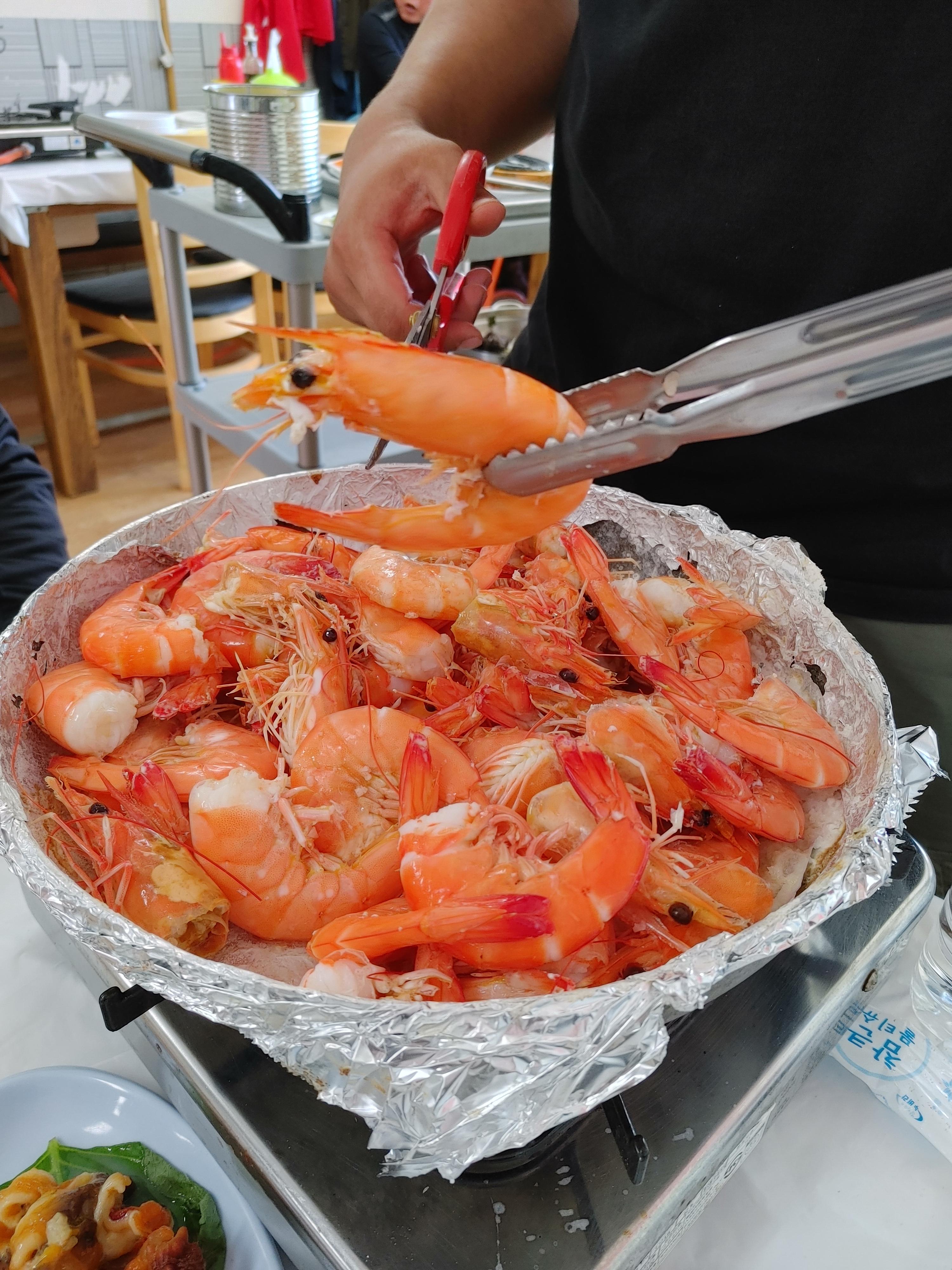 수족관에서 신나게 헤엄치고 있던 대하들은 소금구이 팬에 올려졌다.