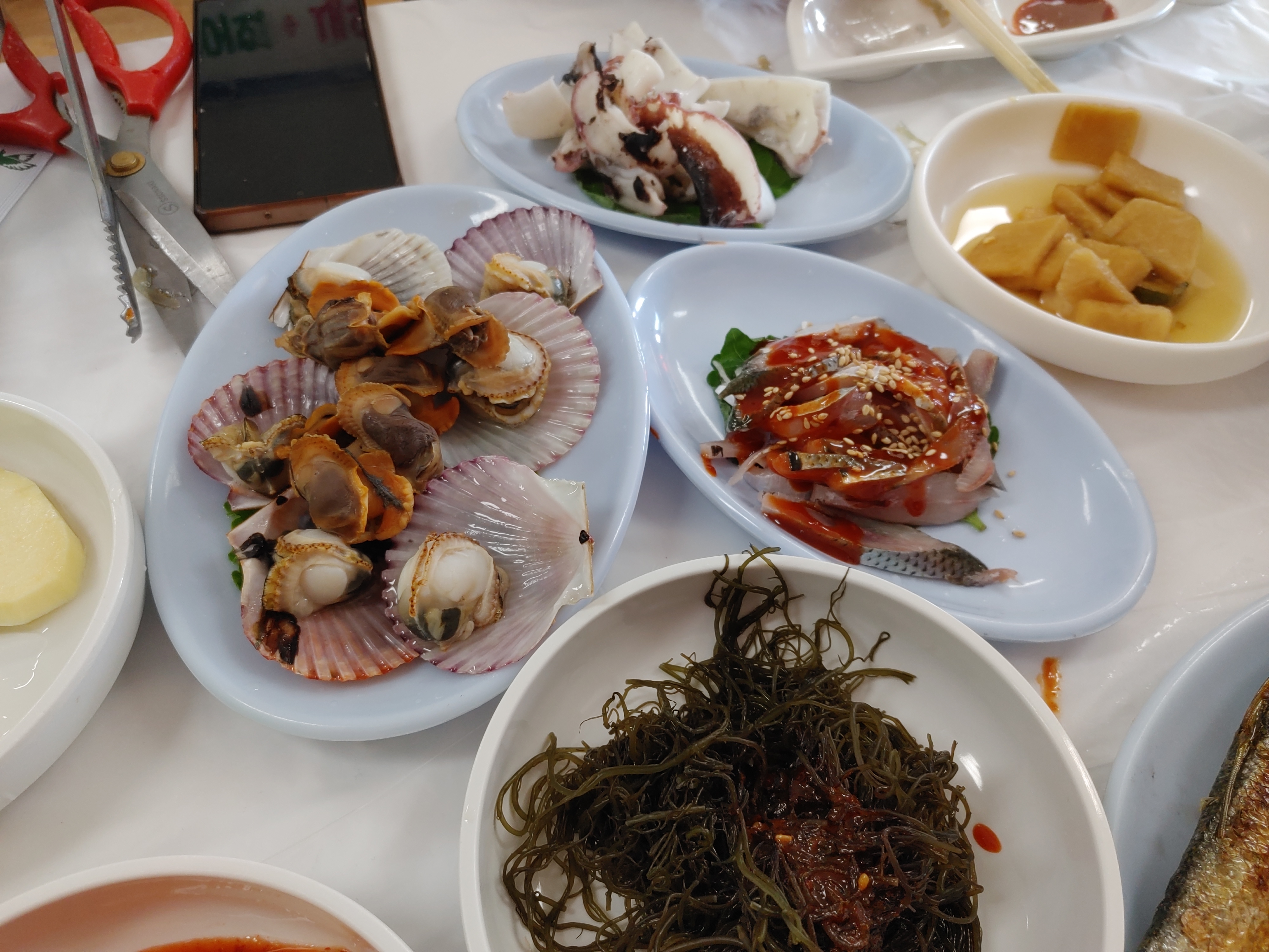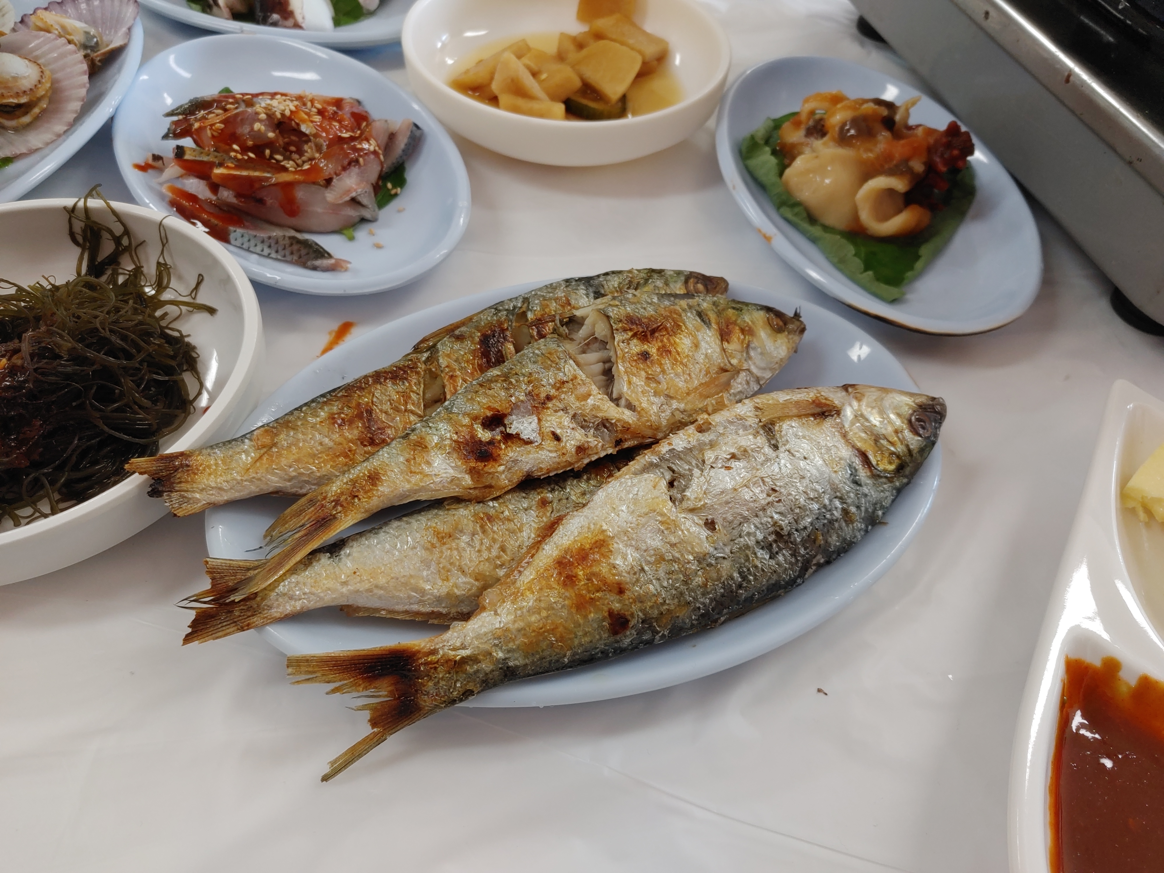같이 나온 반찬들을 살펴보면 섞박지, 조개찜, 전어구이, 전어회, 생고구마, 오징어 숙회, 무 장아찌, 콘치즈, 멍게, 톳이 나왔다.
