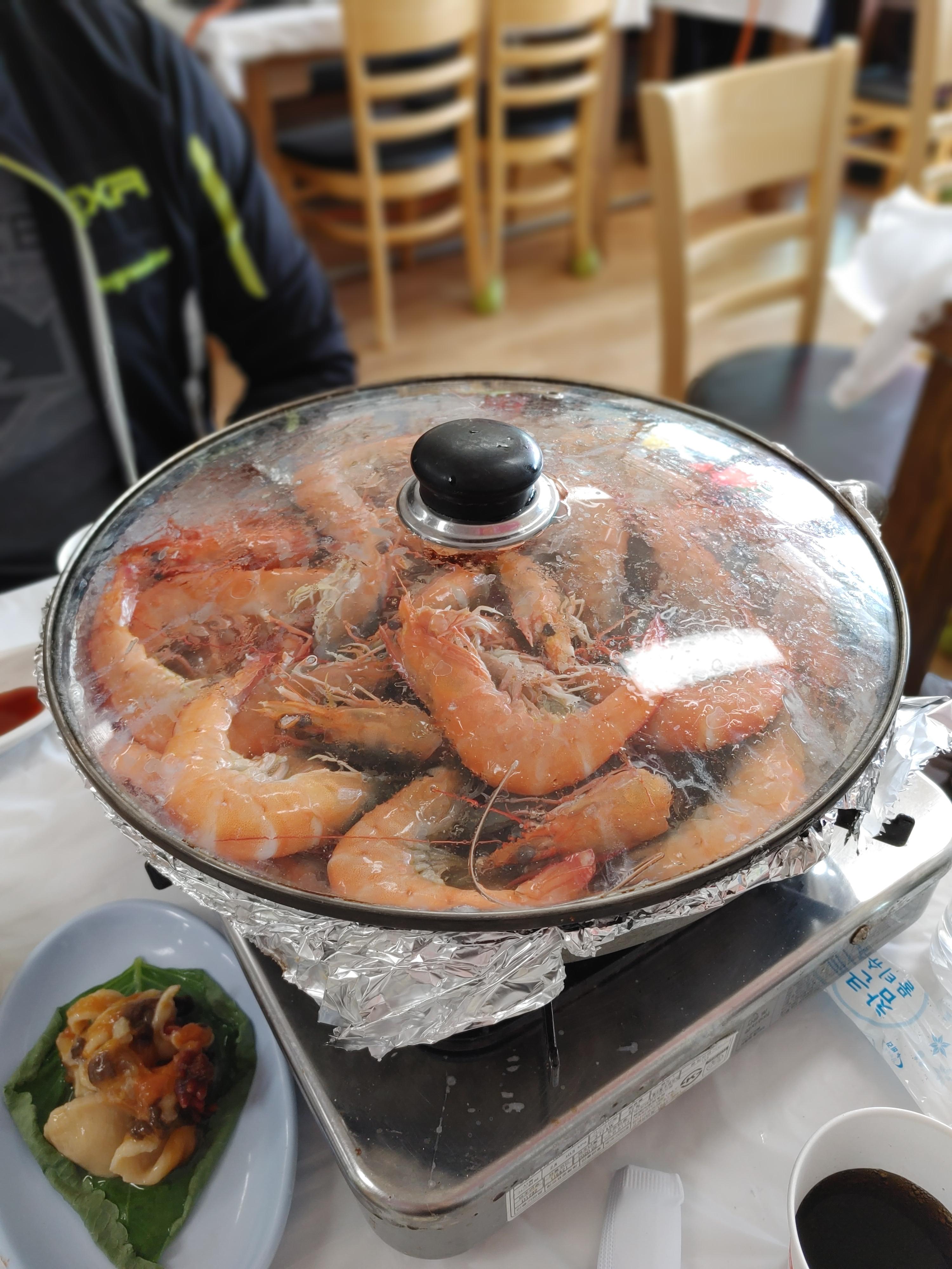 살아있는 대하들이 어찌나 싱싱한지 팔딱거리고 난리도 아니었다. 대하가 익는 사이 생대하도 몇 개 까먹었다.