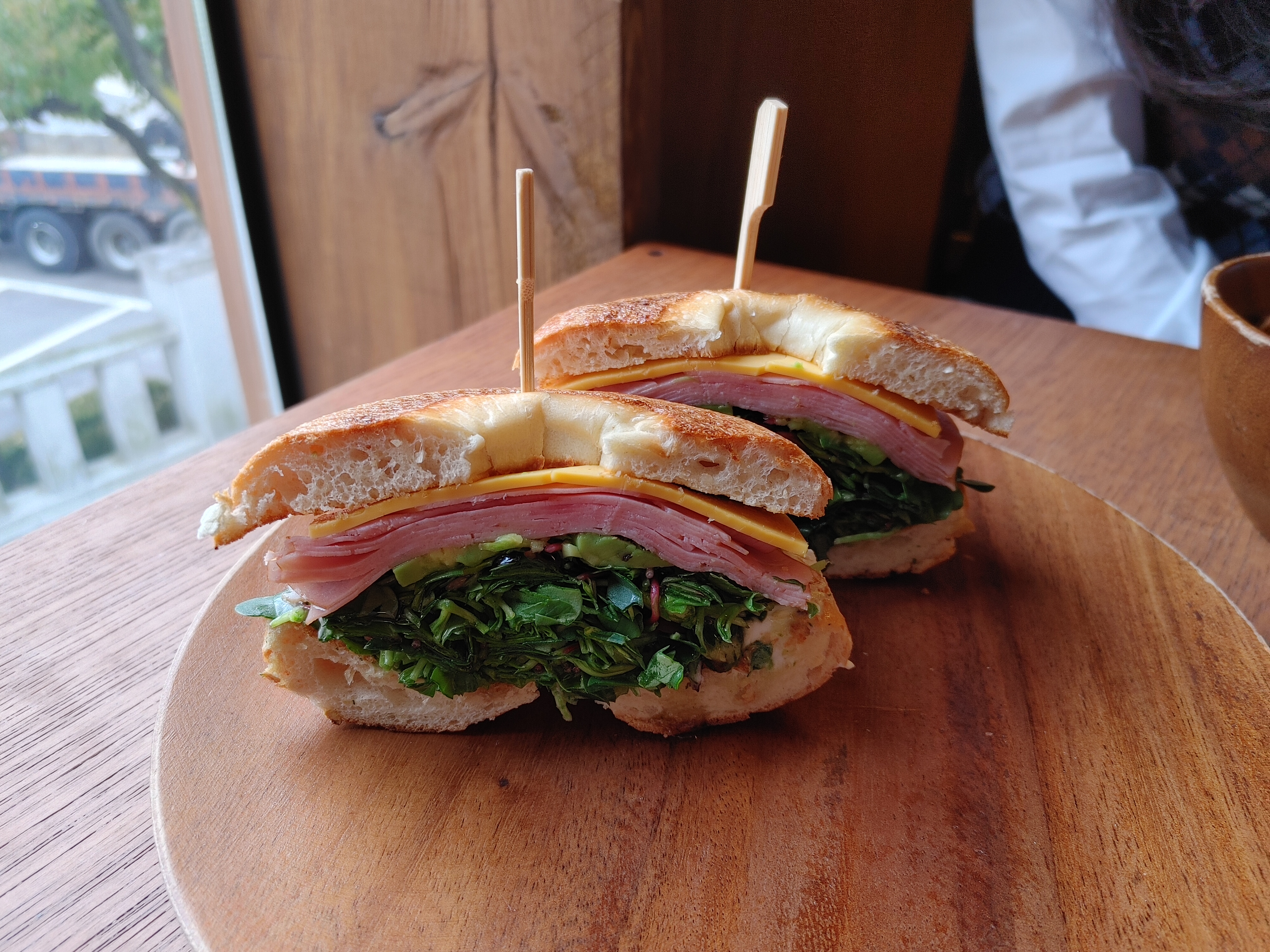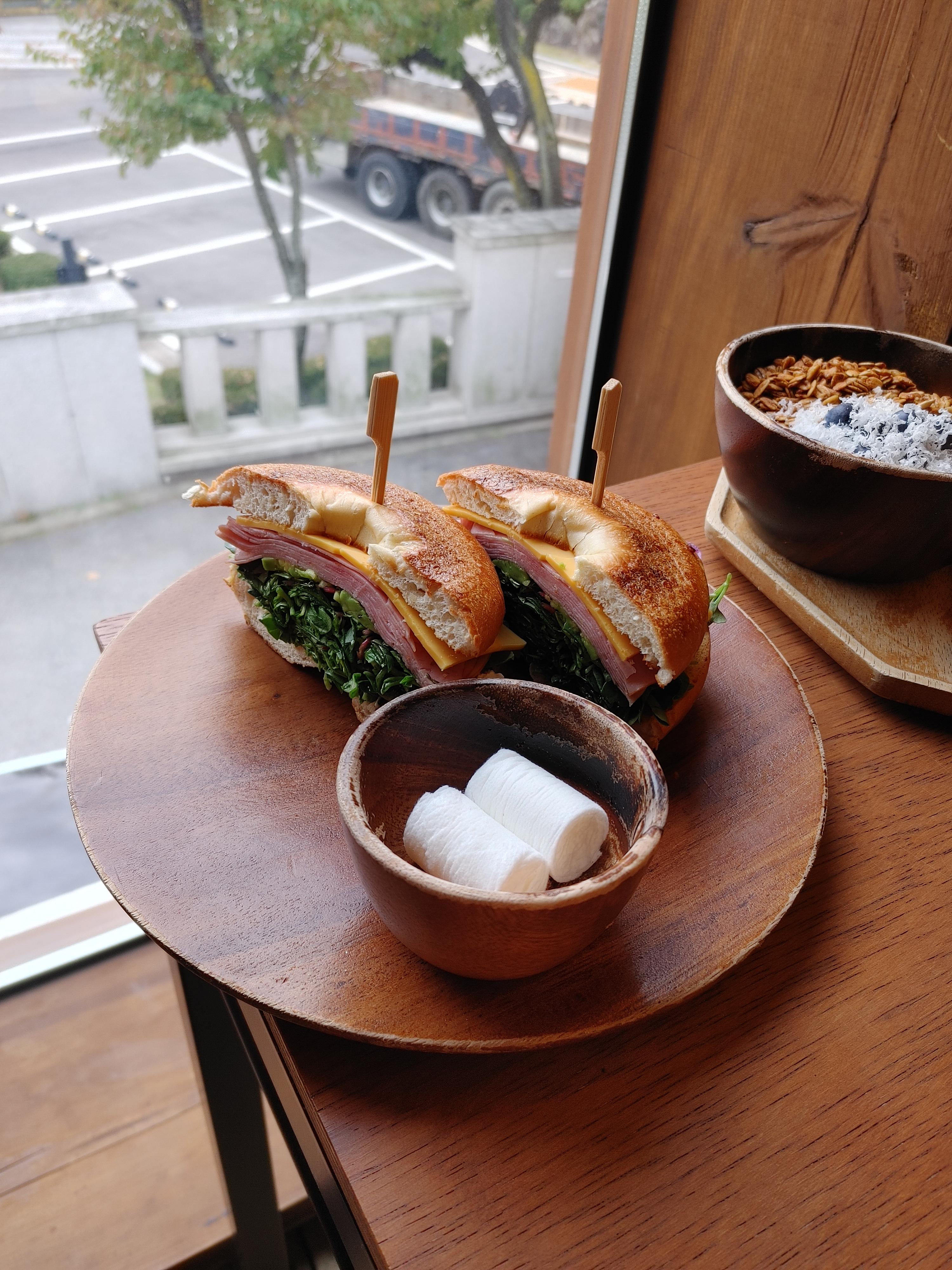 일행이랑 나눠먹은 아보카도, 햄, 치즈가 들어간 그릭 베이글 샌드위치. 가격은 비쌌지만 신선하고 건강하면서도 훌륭한 맛이었다. 굿굿!!!!