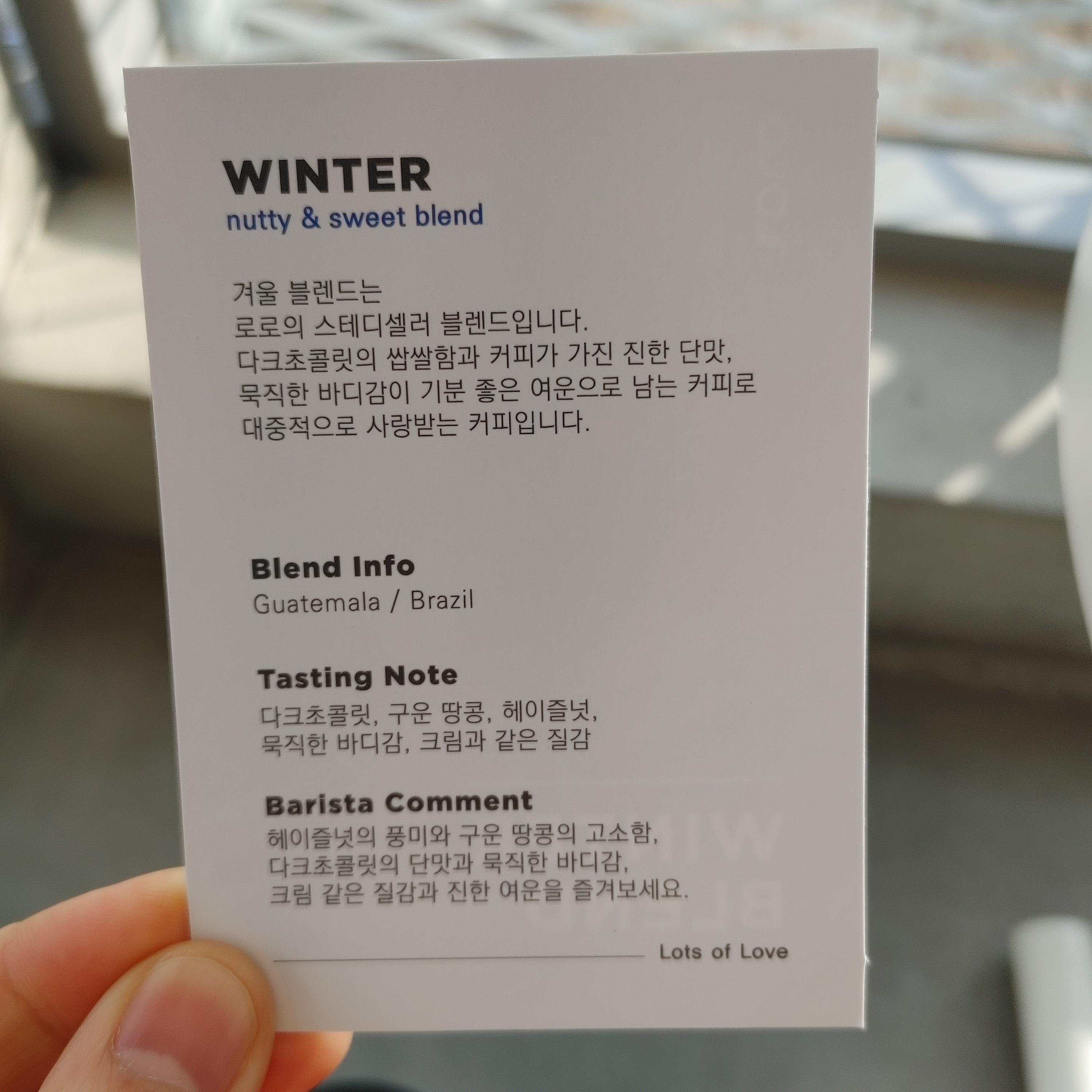 카페에서 자체 블렌딩을 하는 모양이었다. 쟁반에 원두에 대한 설명이 있었다. 겨울 블렌드라는데 견과의 고소함과 다크초콜릿의 묵직한 바디감과 단맛이 어우러진 커피라고 한다. 먹어보니 커피가 정말 맛있었다. 굿굿!!!