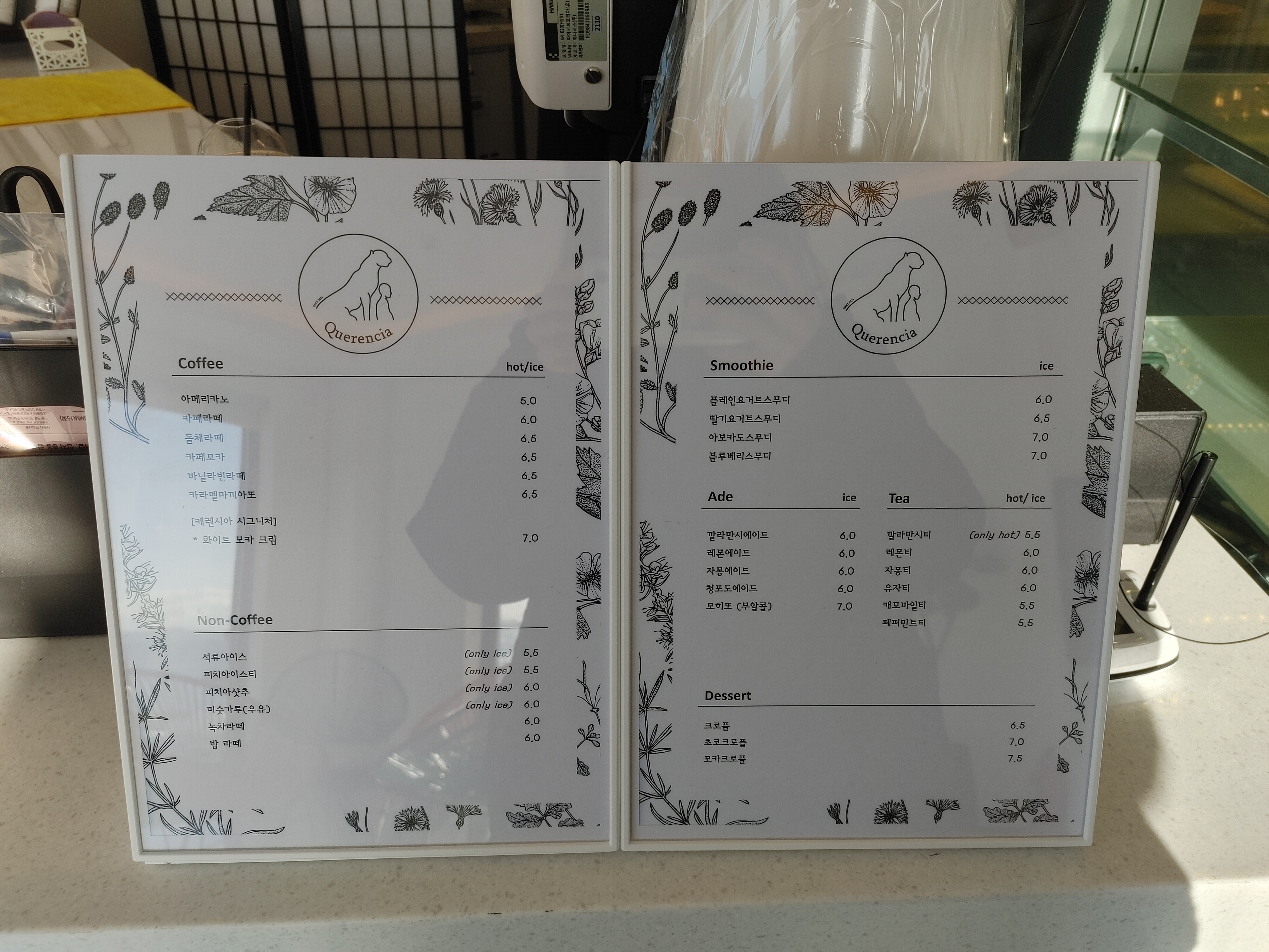 케렌시아의 메뉴판은 깔끔했다. 음료는 커피, 에이드, 스무디, 티, 라떼 종류가 있었고 디저트는 조각 케이크와 크로플 종류가 있었다.