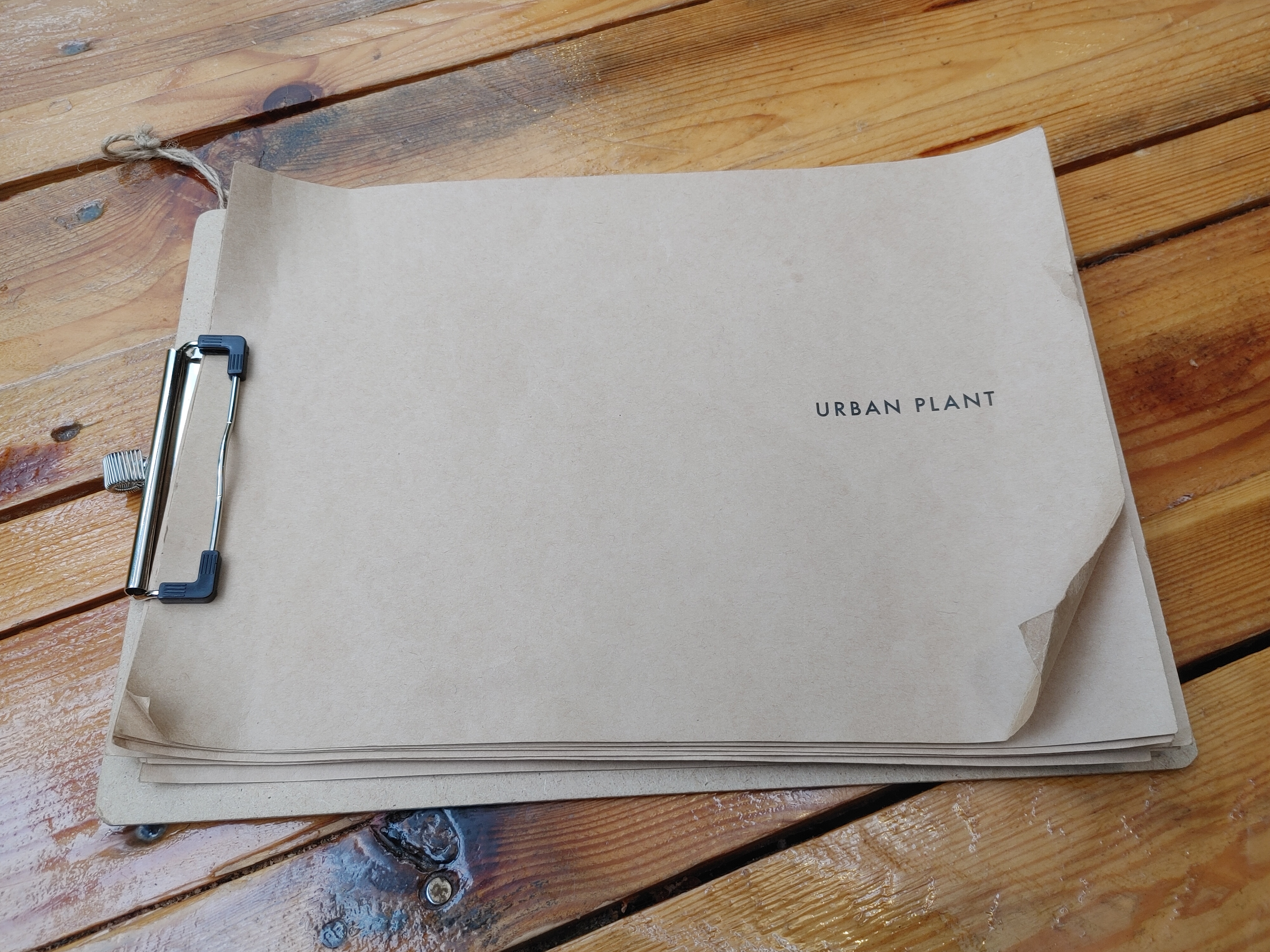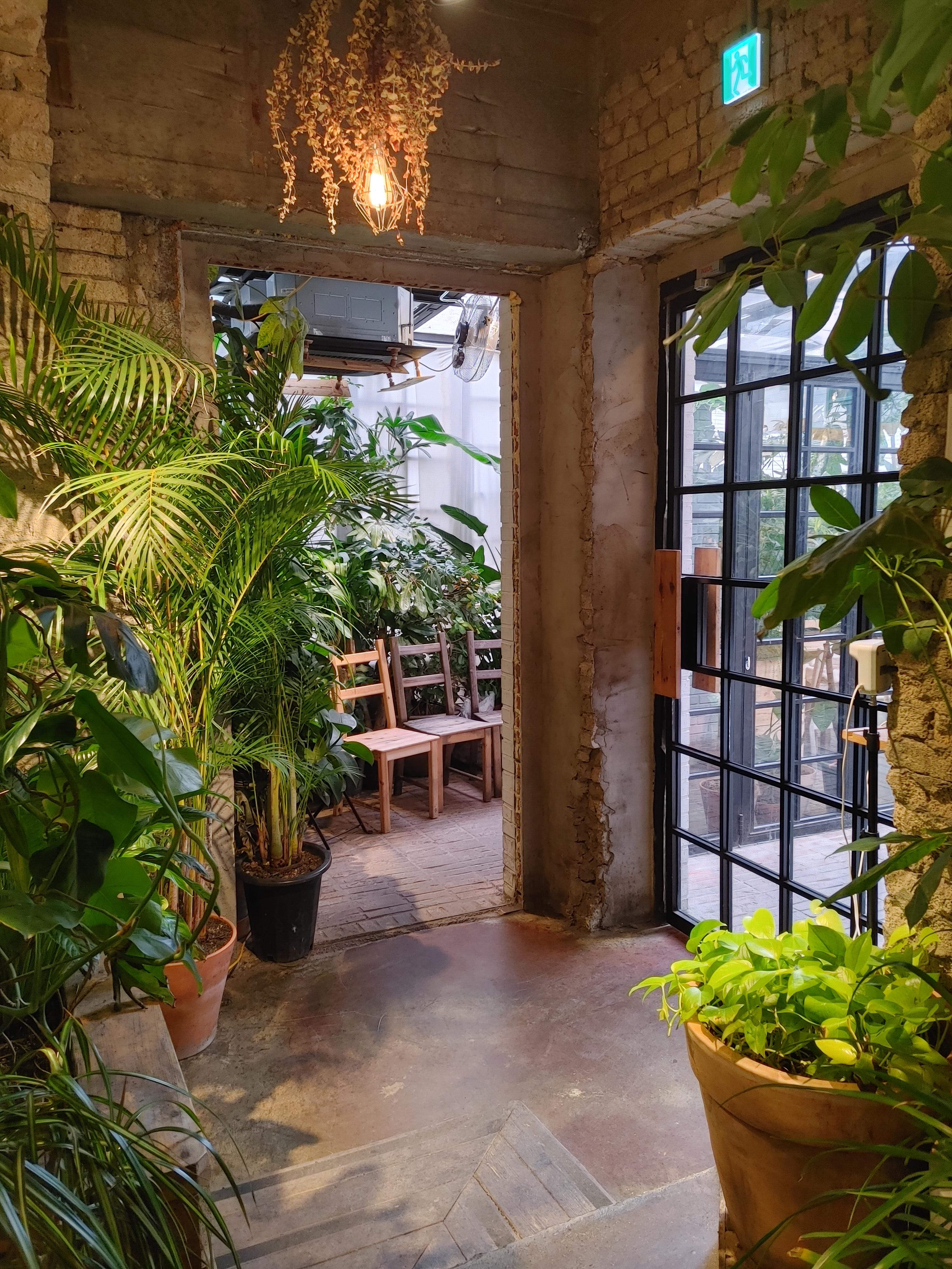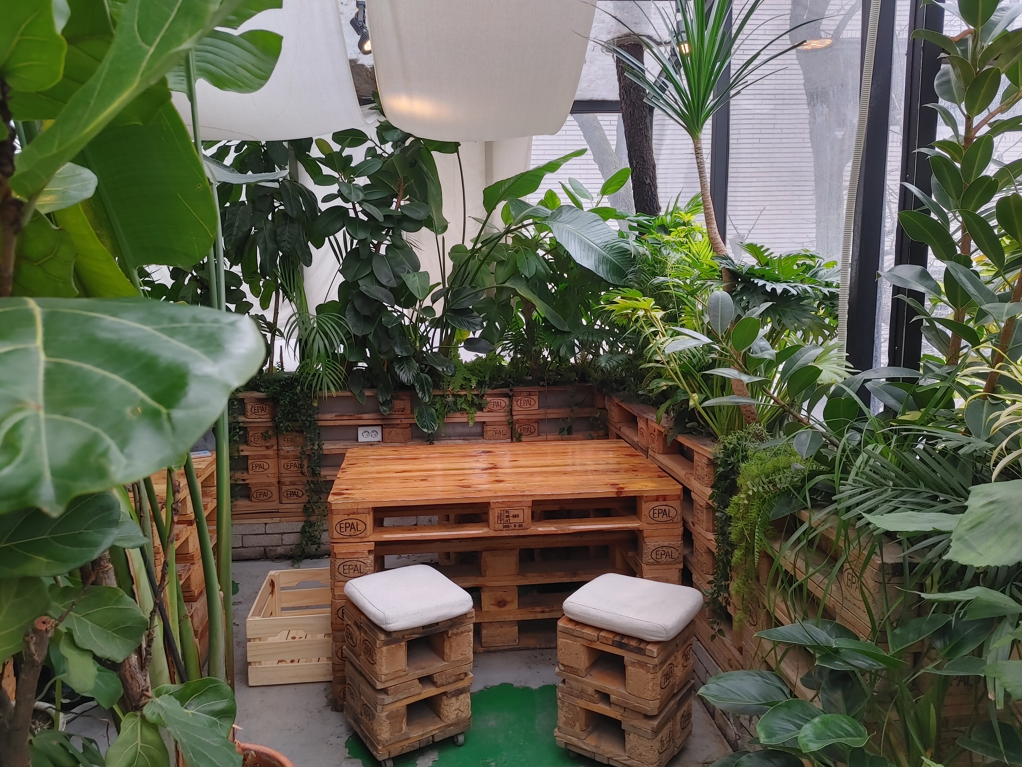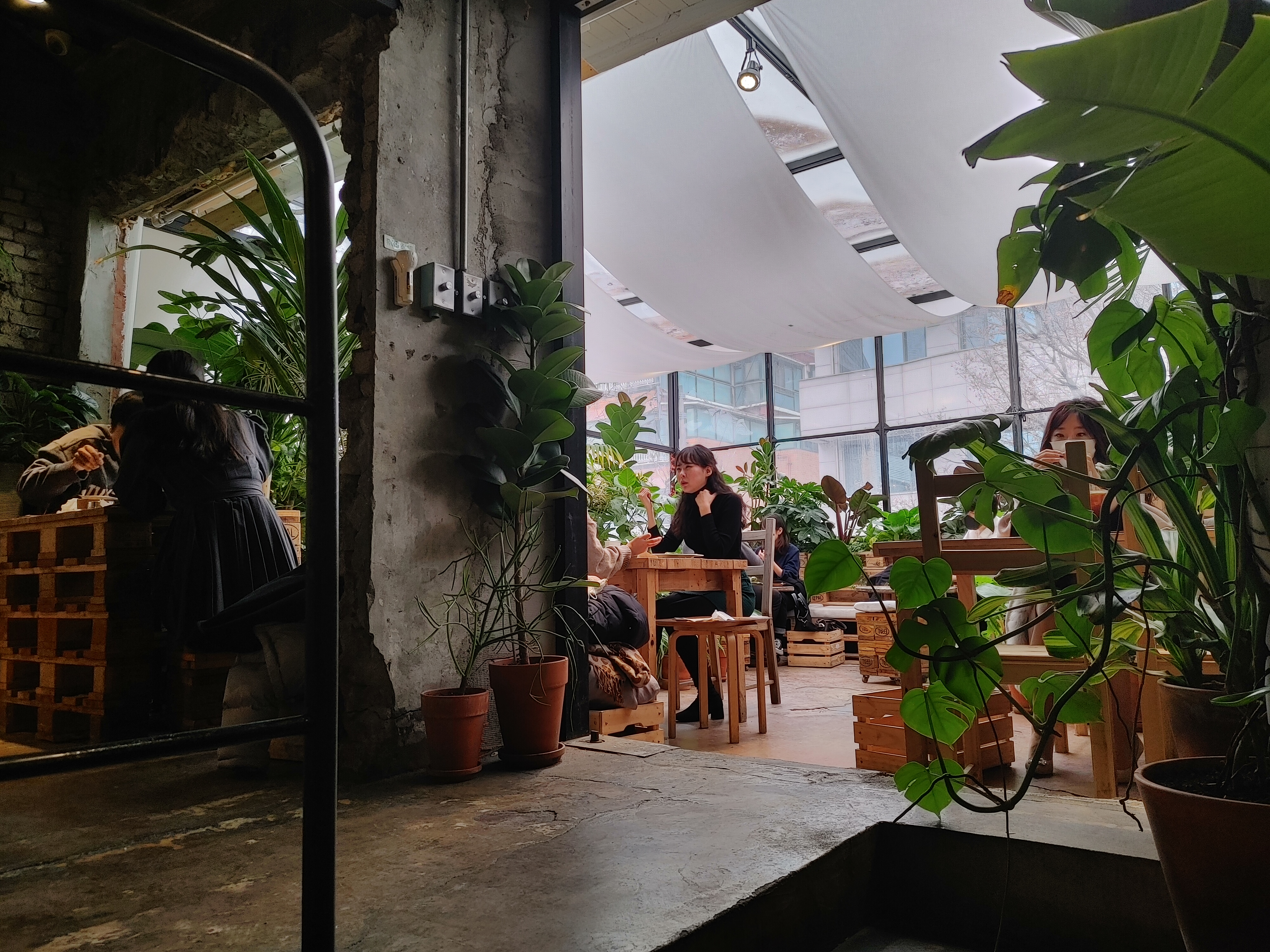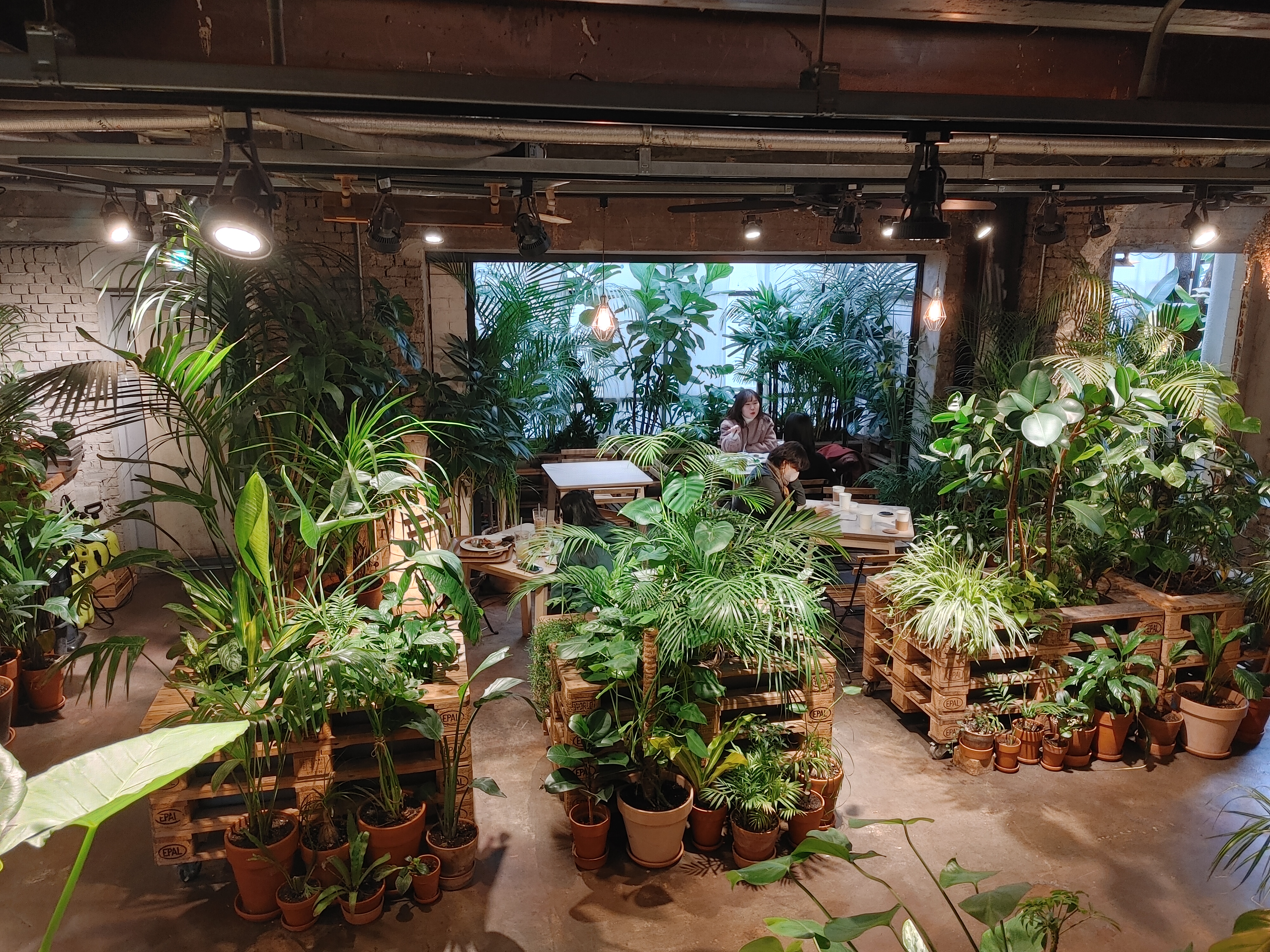 우리가 앉았던 자리! 구석 자리라 프라이빗한 느낌이 들었다. 일행이 2명인데 4인석 안내 받아서 공간이 넉넉했다. 테이블은 나무 팔레트를 쌓아둔 느낌이었는데 식물들과 참 잘 어울렸다. 테이블 옆에 옷과 짐을 둘 수 있는 박스가 마련되어 있어서 좋았다.