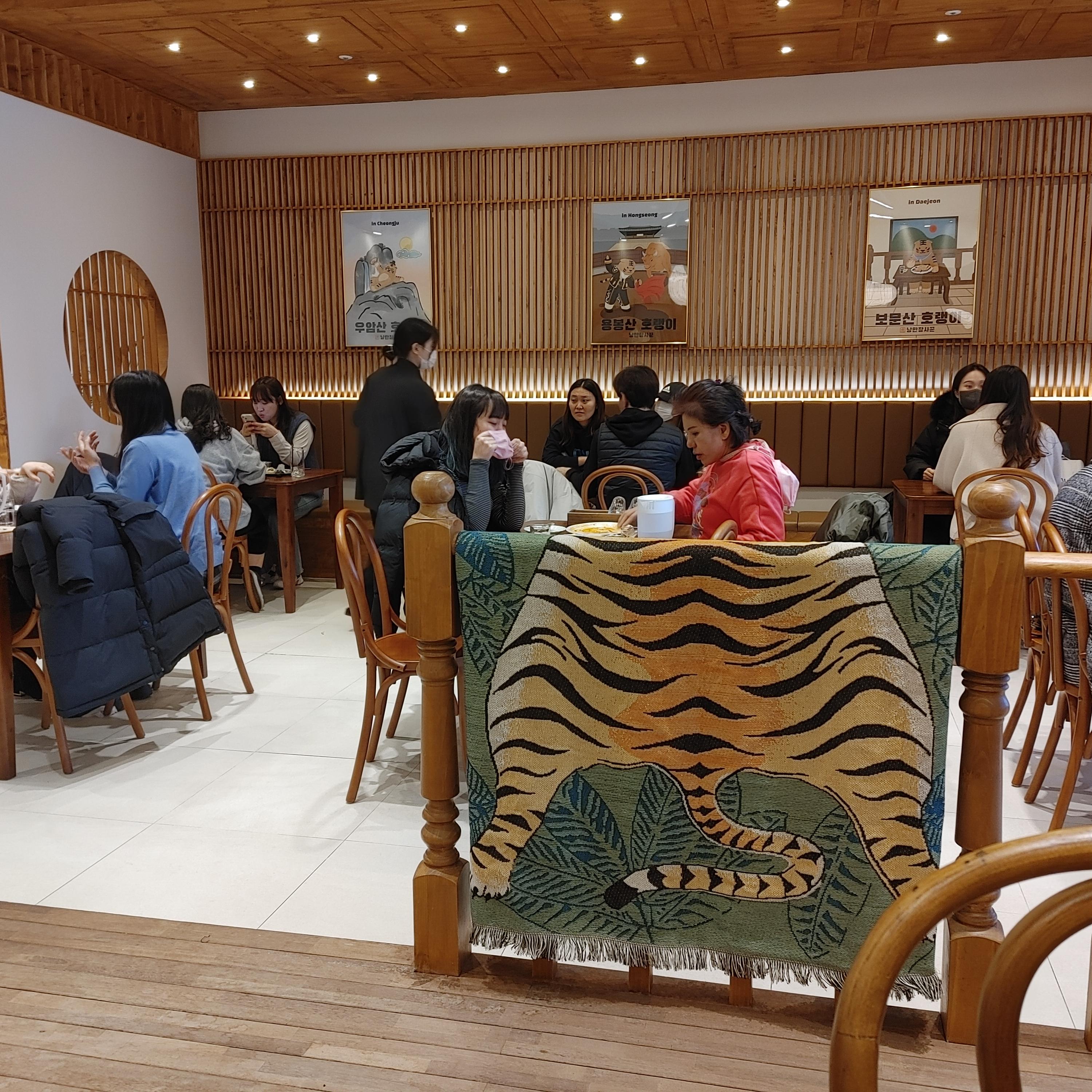 우리는 마루(?) 위 테이블로 안내 받았다. 꽤 마음에 드는 자리였다. 호랑이 뒷태 카페트가 시선을 사로잡았다. ㅋㅋㅋ 용봉산호랭이는 체인점이라고 한다. 지역마다 유명한 산 이름을 따서 가게 이름을 짓는다고 한다. #내포파스타맛집