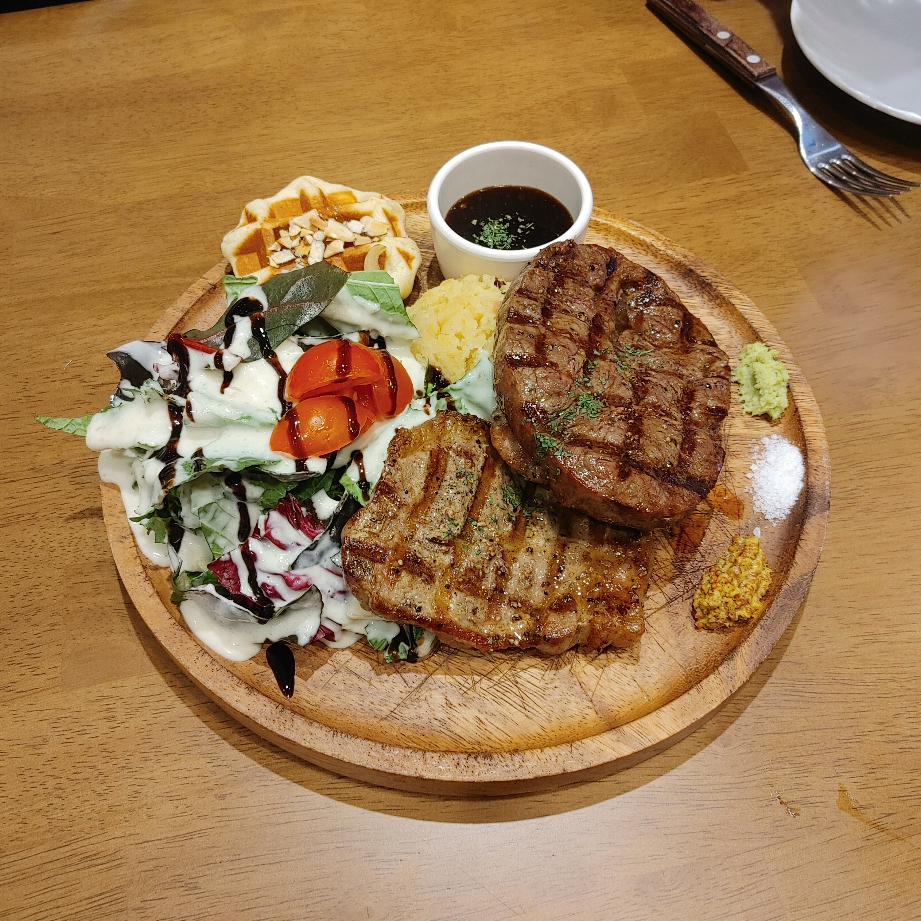 호돌이스테이크 18,000원. 두툼한 부챗살 스테이크 2덩이와 샐러드, 와플, 감자가 푸짐하게 플레이팅 되어 나왔다. 고기도 맛있게 잘 구워졌고 같이 나온 샐러드랑 궁합도 좋았다. 정말 맛있었던 호돌이 스테이크!