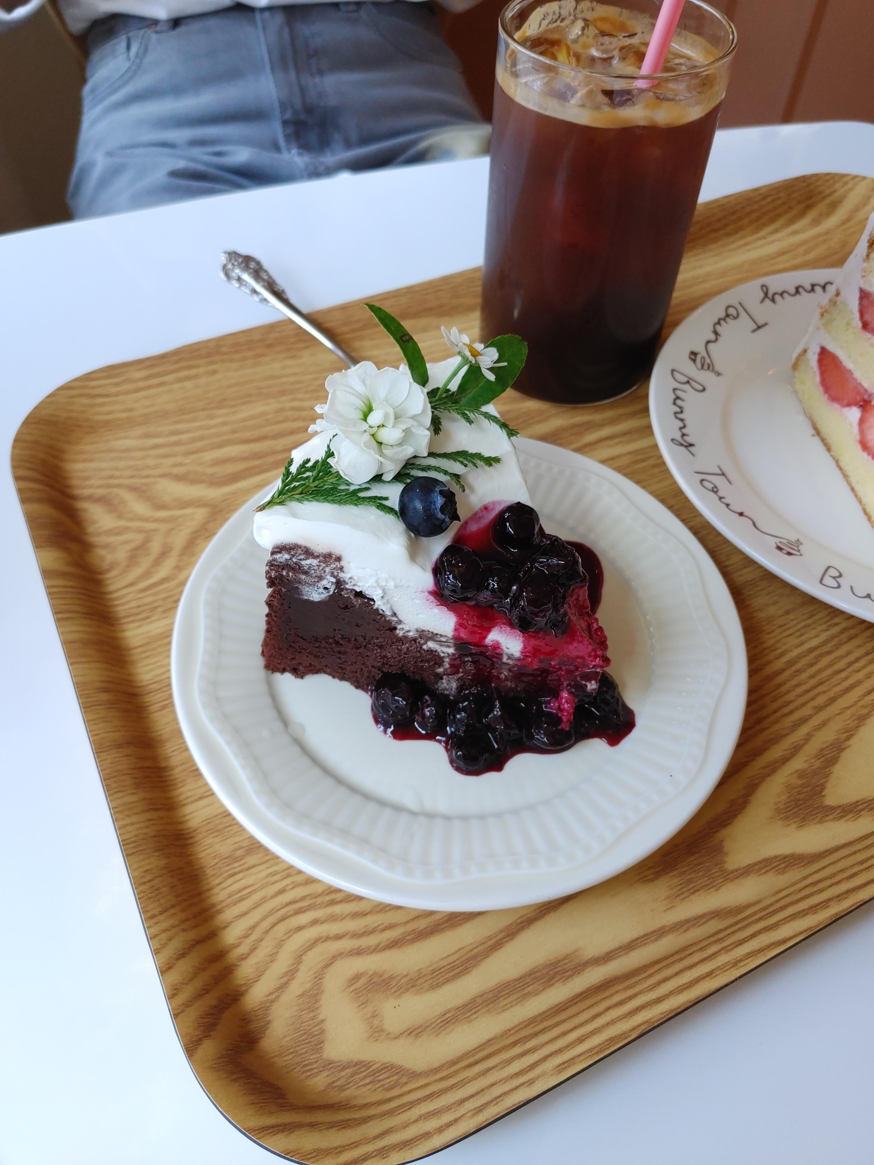 이 케이크는 갸또 블루베리 초코 케이크이다. 꾸덕꾸덕한 브라우니 식감의 초코 시트에 생크림과 블루베리가 얹어져 있다. 위에 생화로 데코까지 되어 있는데 비주얼부터 맛까지 매우 완벽한 케이크였다.