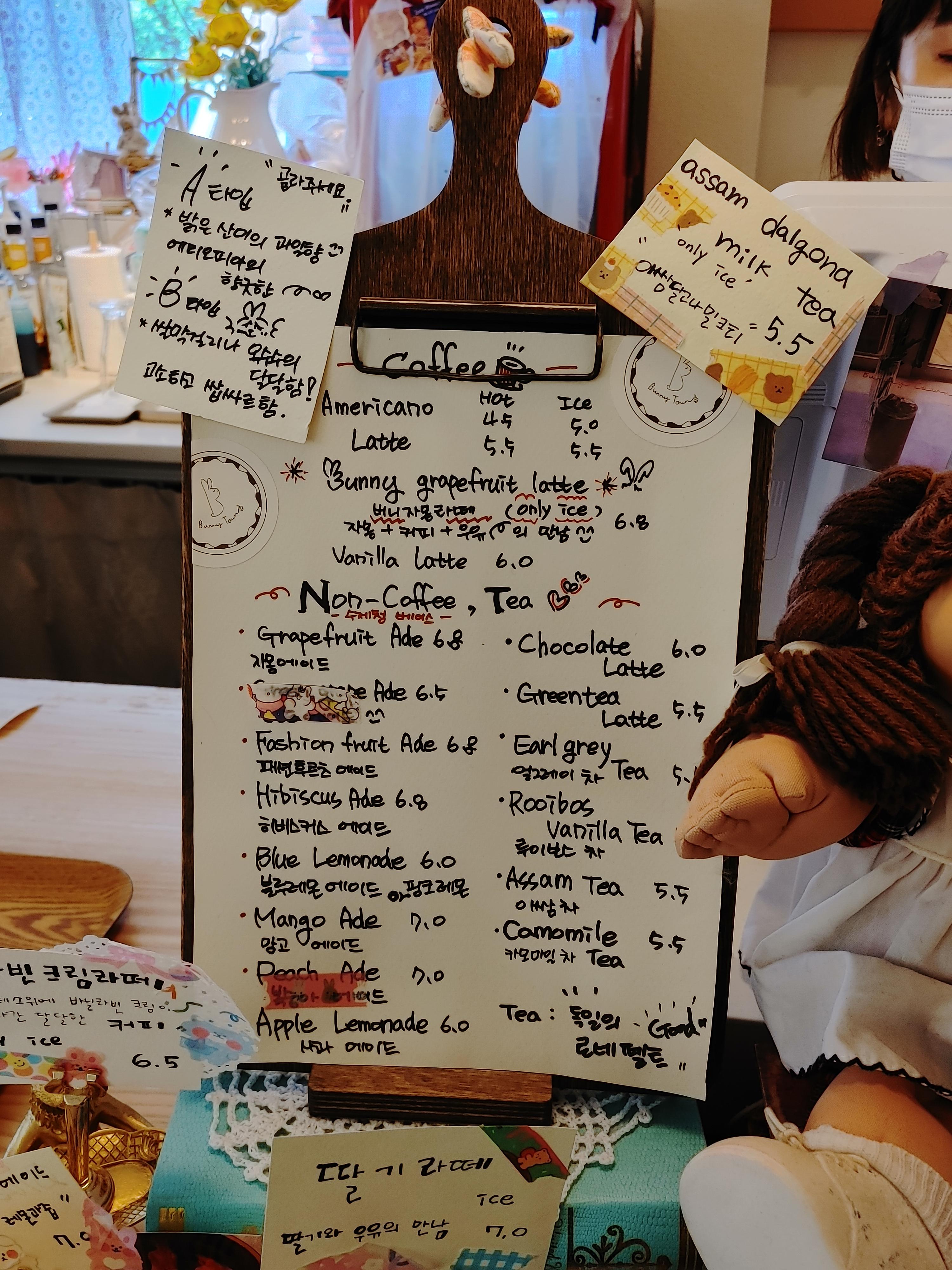 버니타운 음료 메뉴판. 커피, 에이드, 티, 라떼 등 종류가 많았다.