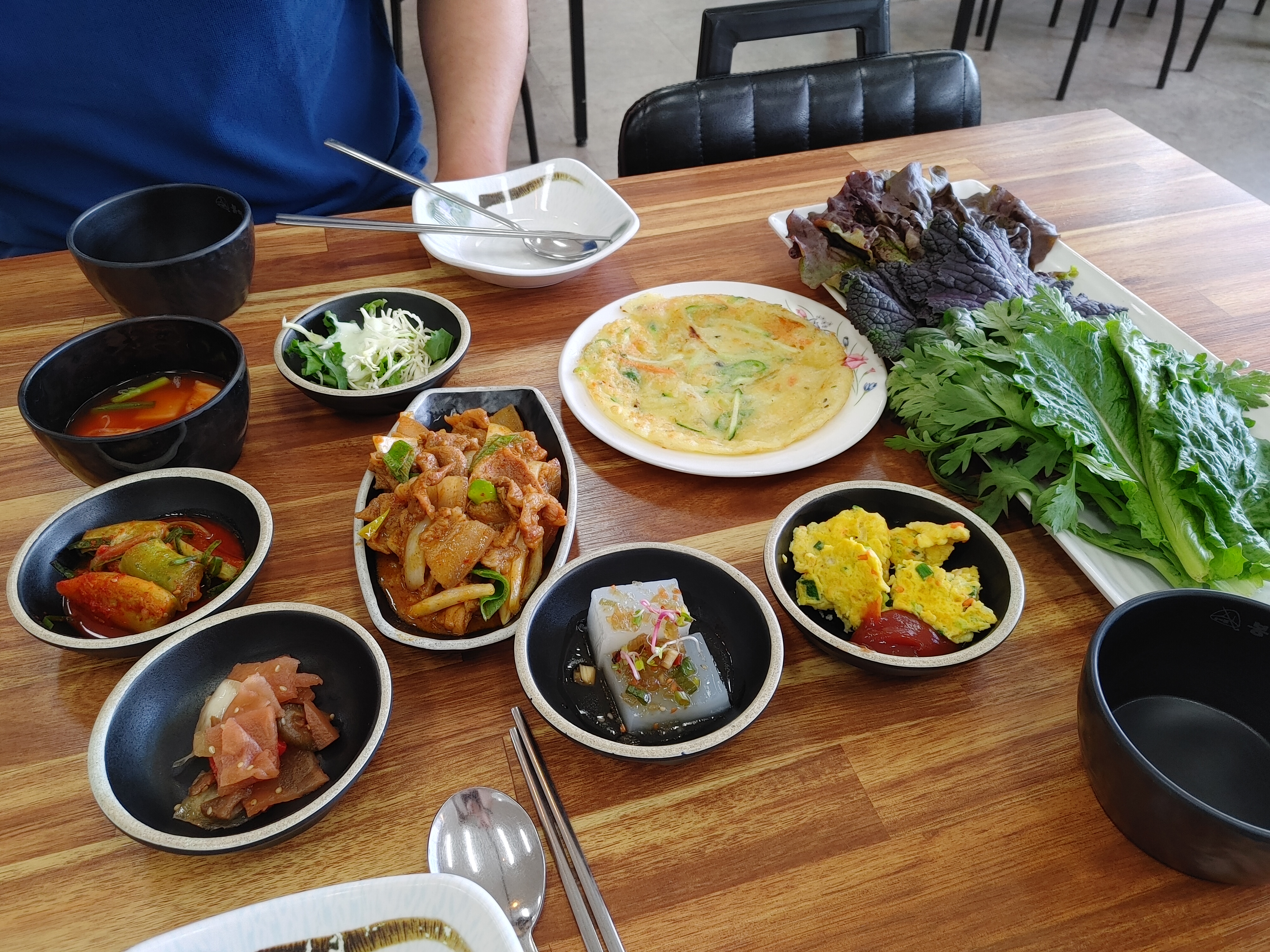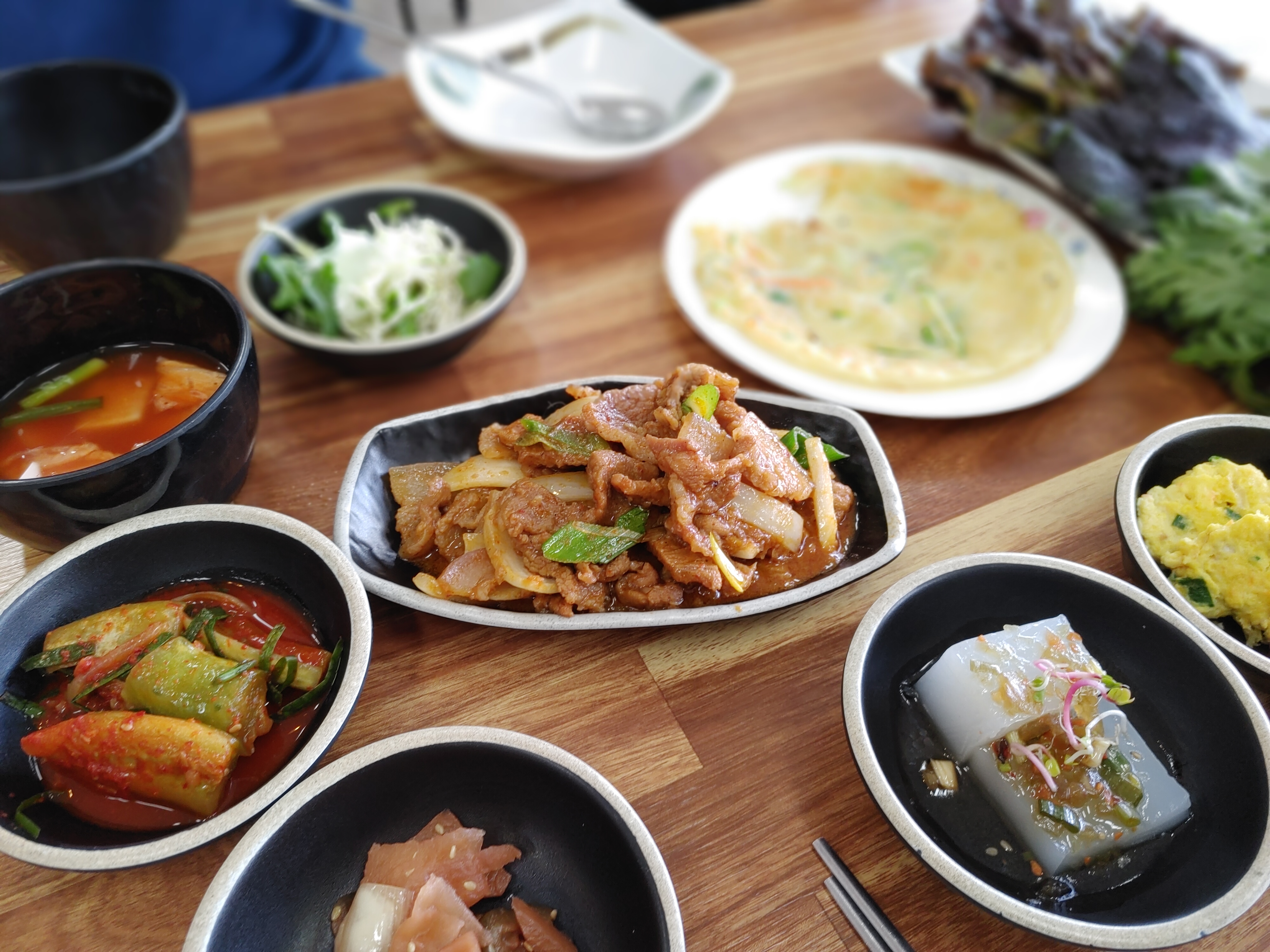 우리는 우렁쌈밥 2인분을 주문했다. 우렁쌈밥은 우렁쌈장 + 쌈채소 + 된장찌개 + 제육볶음 + 솥밥으로 구성되어 있다.