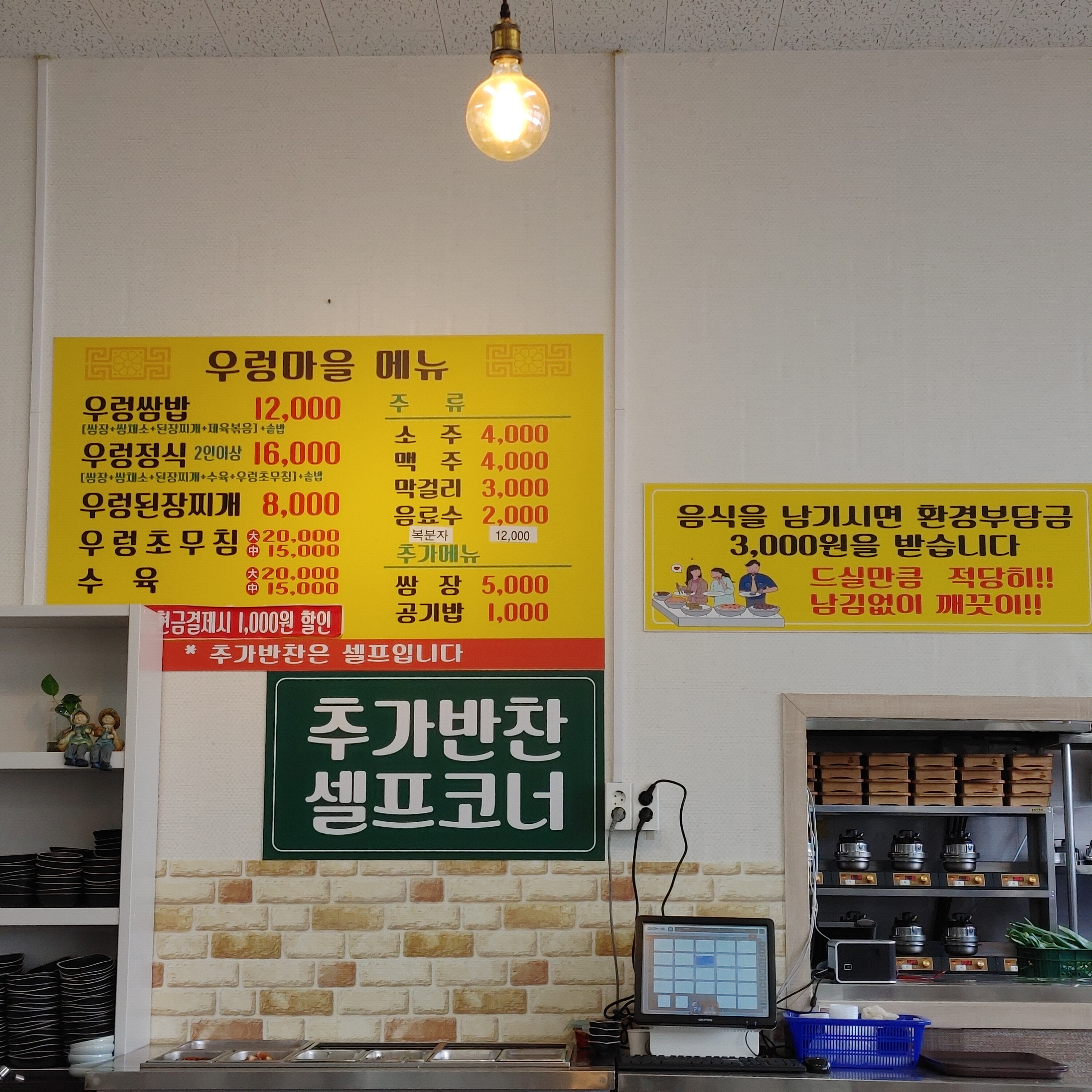 우렁마을 메뉴판은 간단했다. 우렁쌈밥과 우렁정식! 단품으로 우렁된장찌개랑 우렁 초무침, 수육도 파는데 다 정식 메뉴에 포함되어 있다.