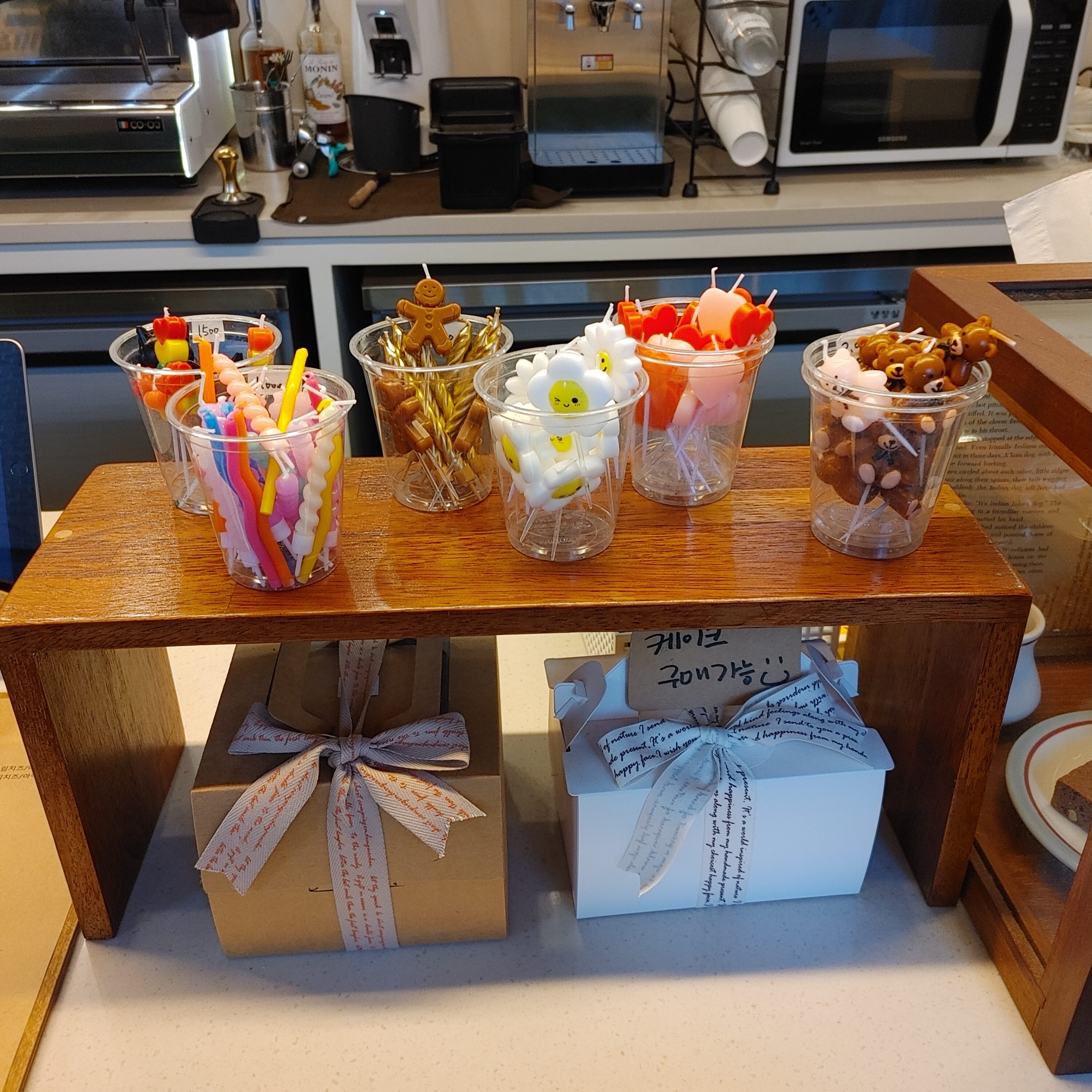 카운터에 귀염 뽀짝 초들이 있었다. 귀여운 곰 모양 초도 하나 샀다. 곰모양 초 가격은 3,000원이었고 미니 케이크(레터링 포함)는 32,000원이었다.