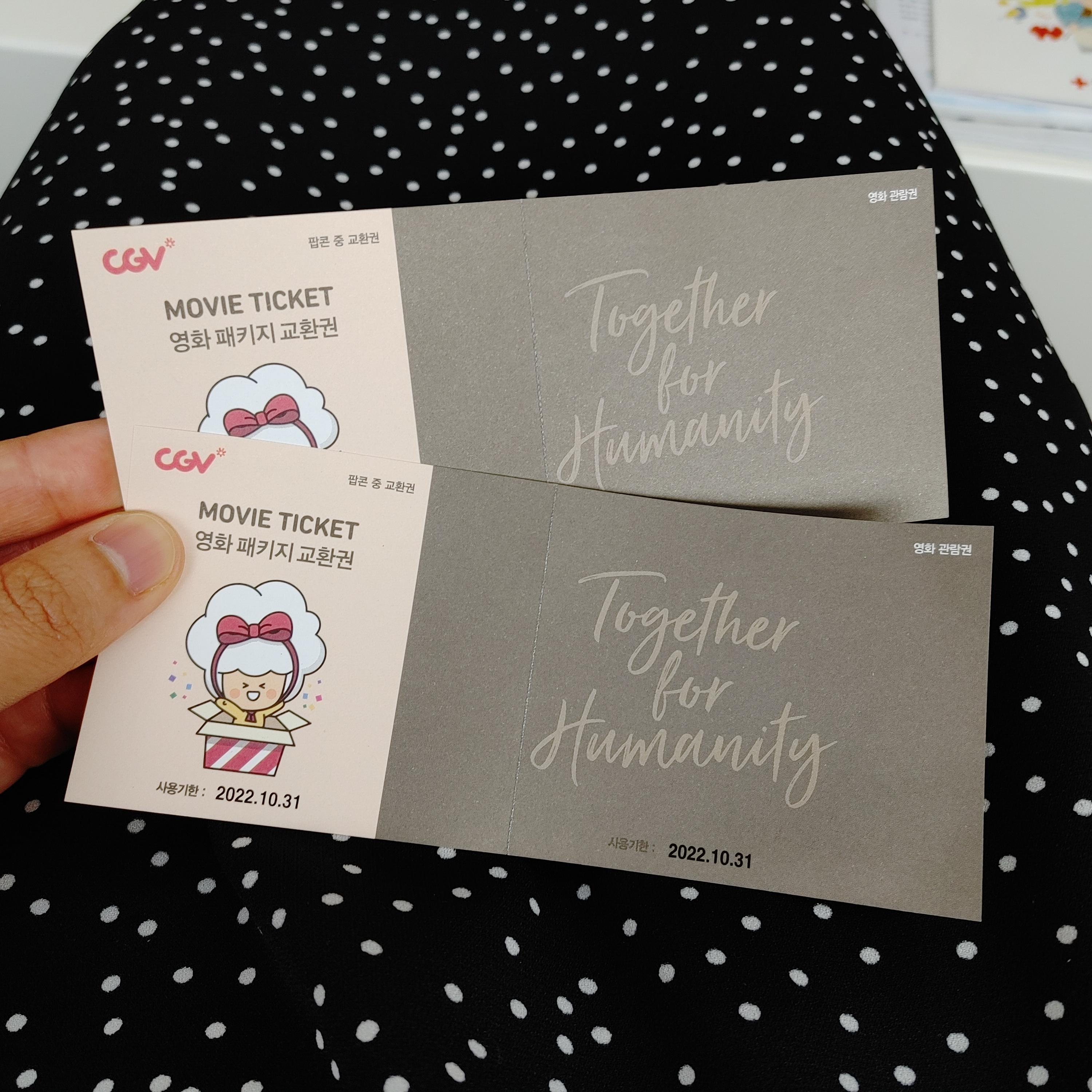 쉬면서 당 충전하고 기념품으로 받은 영화티켓도 찍어 보았다. 뿌듯하게 헌혈 끝!