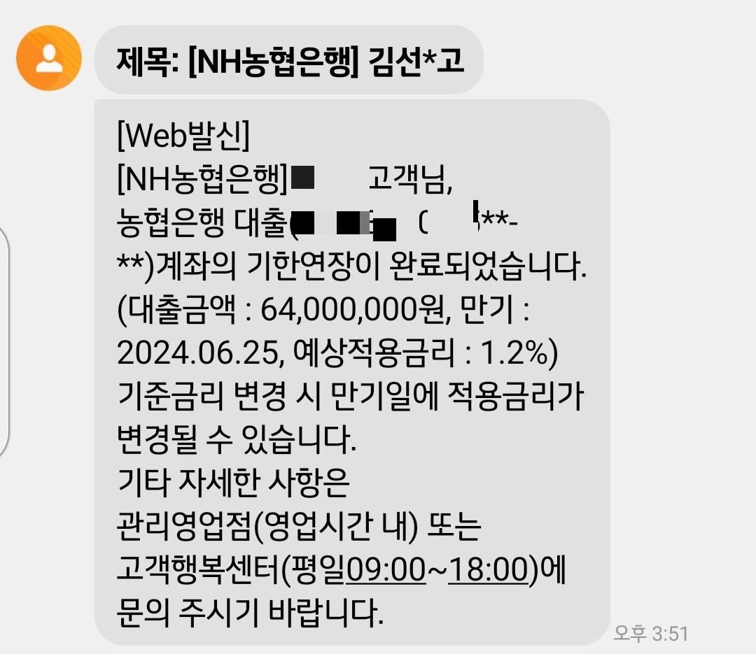 5월 27일 은행 방문했는데 이 기한연장 완료 문자는 6월 13일에 받았다. 승인까지 2주 정도 소요되는 듯하다.