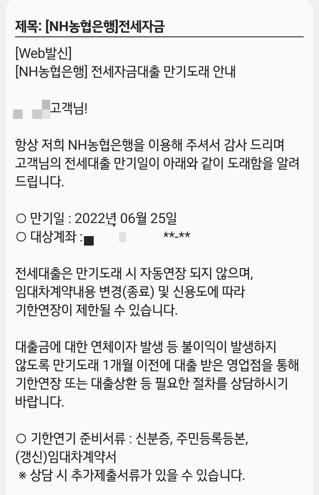 만기 전에 우편물, 문자로 대출 연장하라고 알려주는 점도 좋았다. 안 그랬으면 불안한 마음에 일찍 은행을 들락날락했을 텐데 만기 1달 이내부터 은행 오라고 되어 있어서 딱 한 달 전에 은행을 찾았다. 대출받았던 농협 은행에 방문해서 각종 동의서 작성하고 연장에 필요한 서류를 제출하는데 10분도 걸리지 않았다. 대기 손님도 없어서 상당히 빠른 일처리였다.