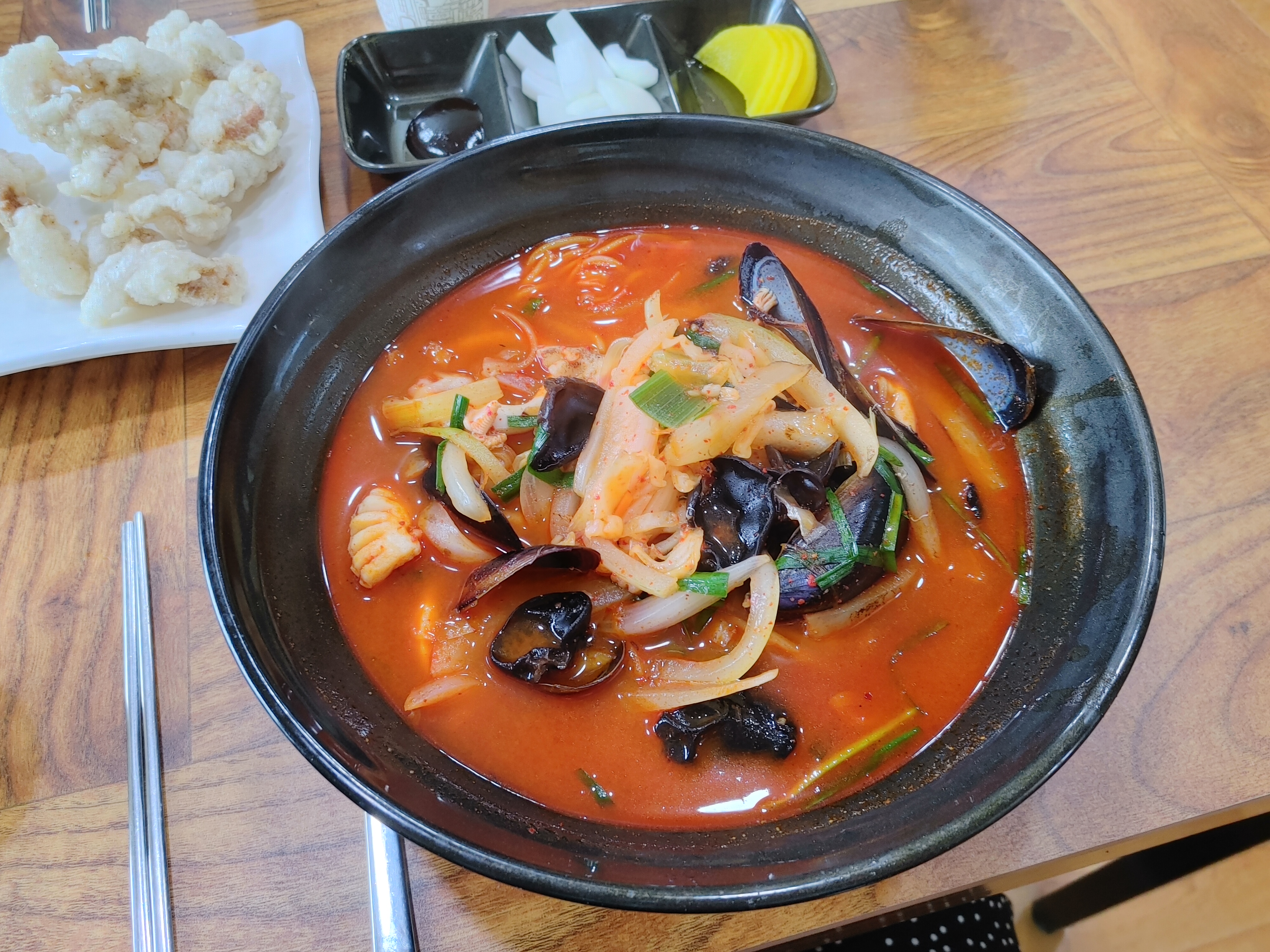 기본 짬뽕 8,000원. 오징어, 홍합, 버섯, 야채 등 재료가 잔뜩 들어가 있었다. 국물 진짜 끝내주게 맛있었다.