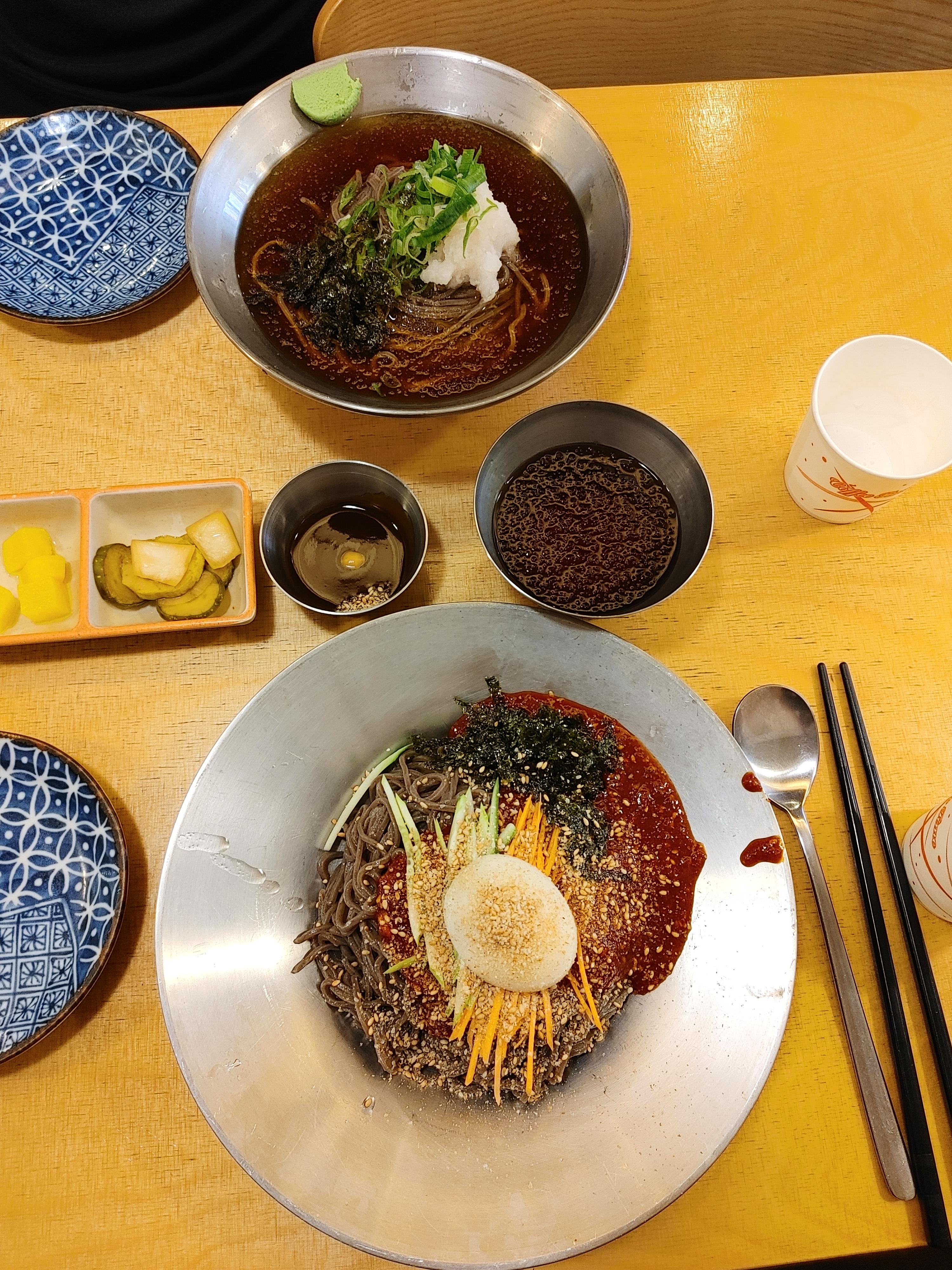 우리는 냉모밀, 비빔모밀, 돈카츠를 주문했다. 단무지와 피클이 기본 반찬으로 나온다.