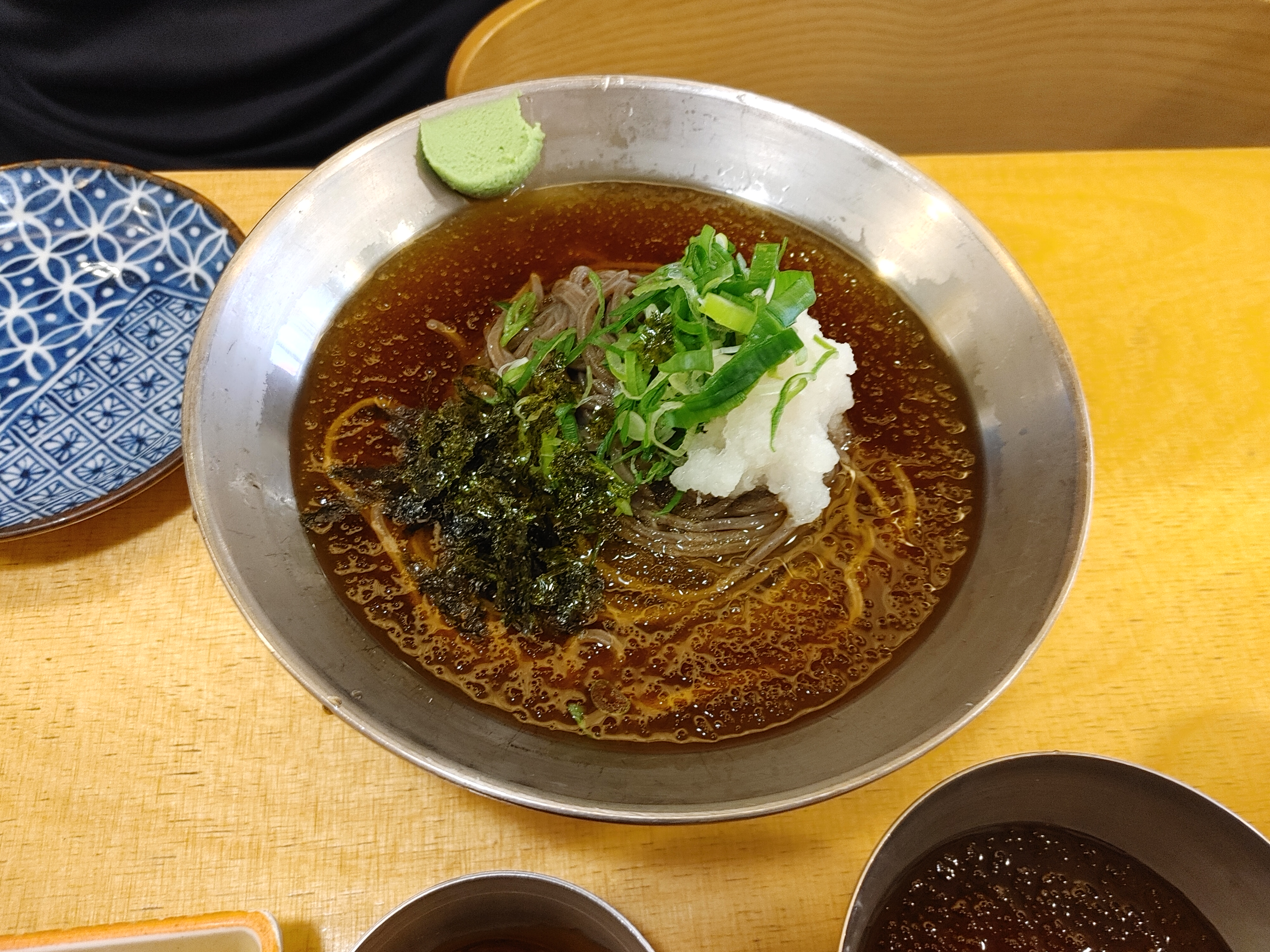 내가 주문한 냉모밀. 가격은 9,000원이다. 비주얼부터 합격!!! 살얼음 가득한 육수 진짜 굿굿!!! 무 간 것과 파, 김가루가 올라가 있고 안에 모밀면이 가득 들어있다. 와사비를 잘 풀어서 먹으면 완벽하다. #추천메뉴