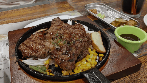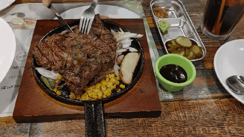 지글지글 뜨거운 무쇠 팬에 스테이크가 나왔다. 기본 미디엄 레어로 구워 나와서 취향에 따라 더 익혀 먹으면 된다.
