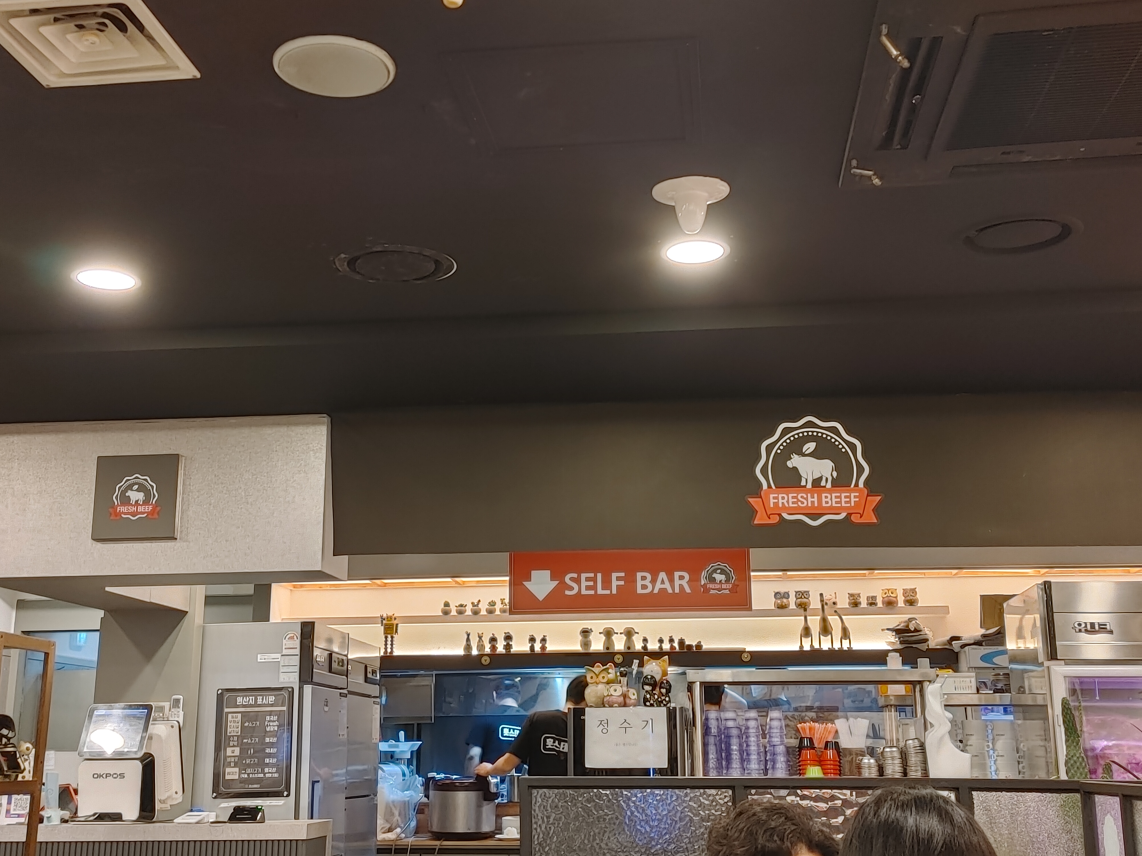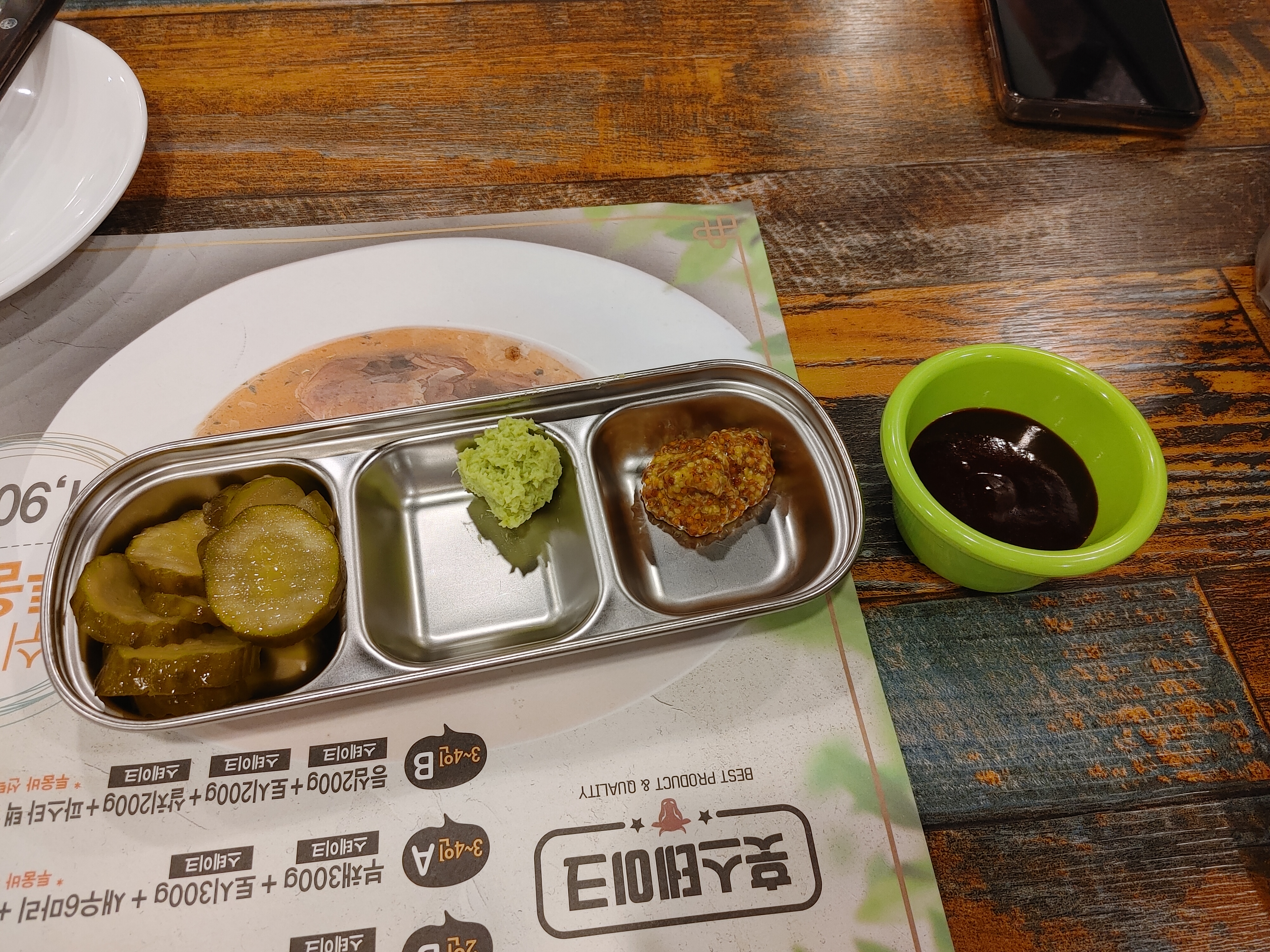 셀프바에서 물, 스테이크 소스, 홀그레인, 와사비, 피클을 가져왔다.