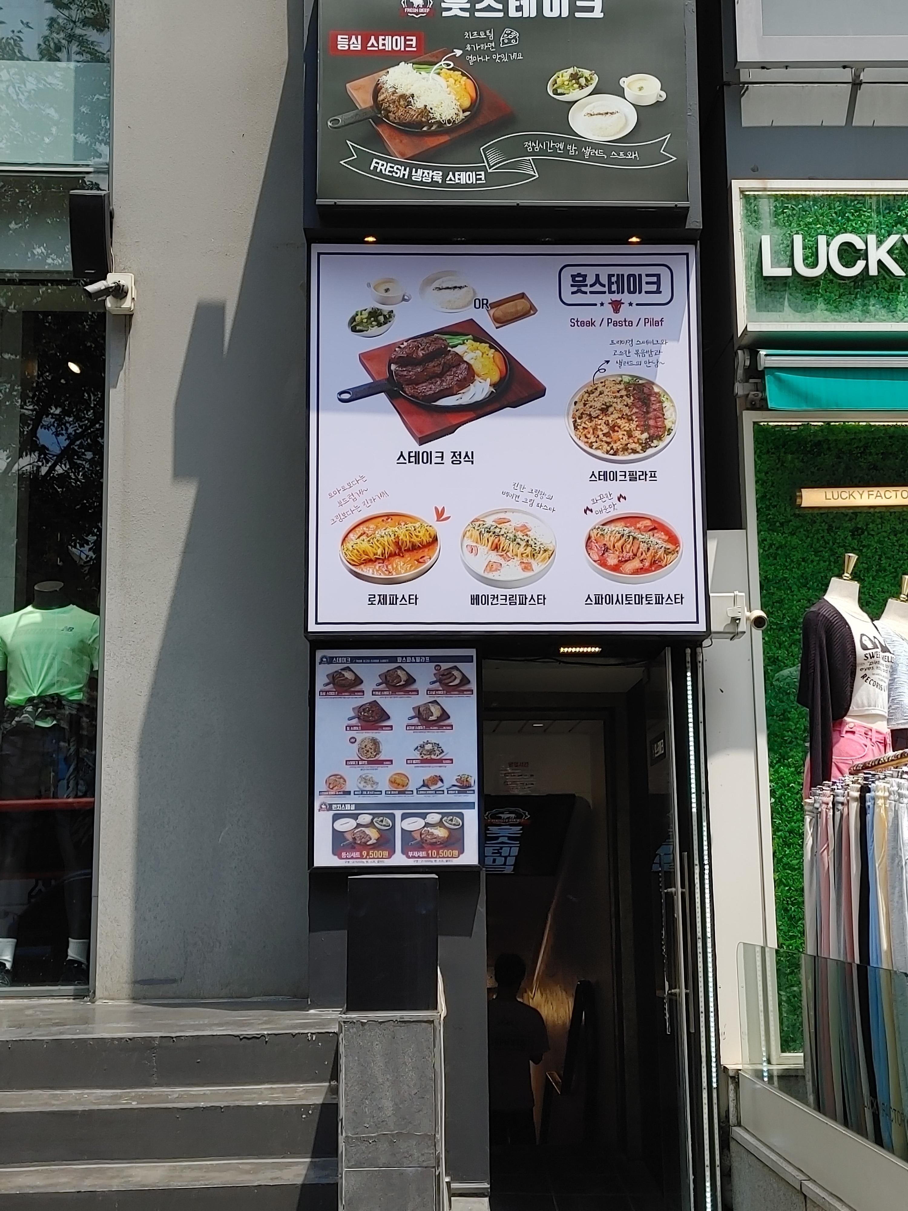 강남역에서 도보 3분 거리에 있는 '훗스테이크'. 좁은 계단을 내려가면 바로 매장이 있다.