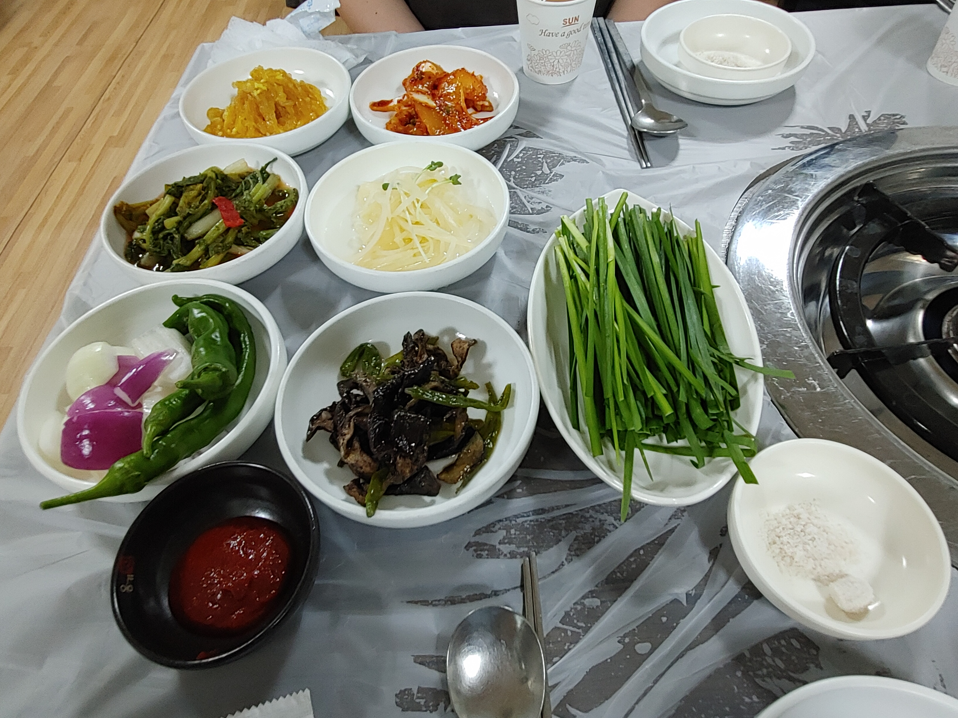 깔끔한 반찬들이 한상 가득이었다. 노각무침, 냉채, 버섯볶음, 열무김치, 부추, 오이고추, 생양파, 무김치 등이었다. 직접 재배해서 제공하는 식재료라고 하니 더 믿음이 갔다. 반찬이 다 정갈하고 맛있었다.
