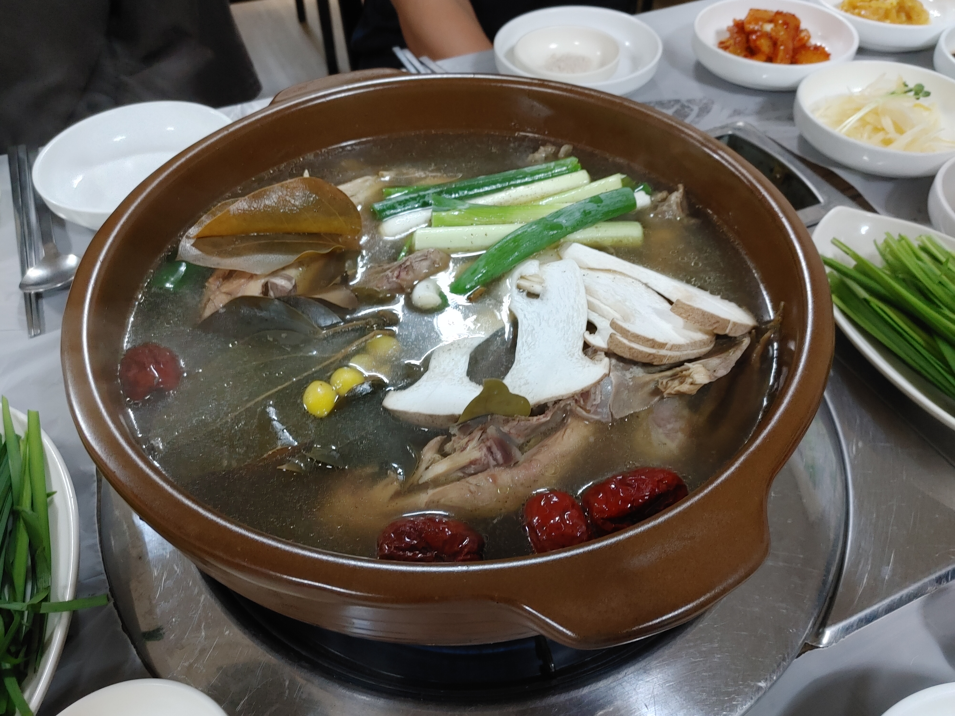 우리는 4인이었고 닭백숙 한 마리를 예약했다. 다 익은 상태였는데 버섯과 파가 숨이 죽도록 살짝 더 끓여서 바로 먹었다.