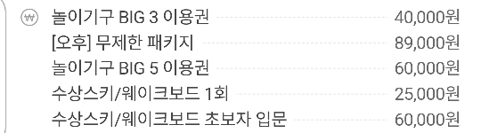 놀이기구는 1회 20,000원, 빅 3 이용권은 40,000원이었다. 그리고 수상스키는 1회 25,000원이었다.
