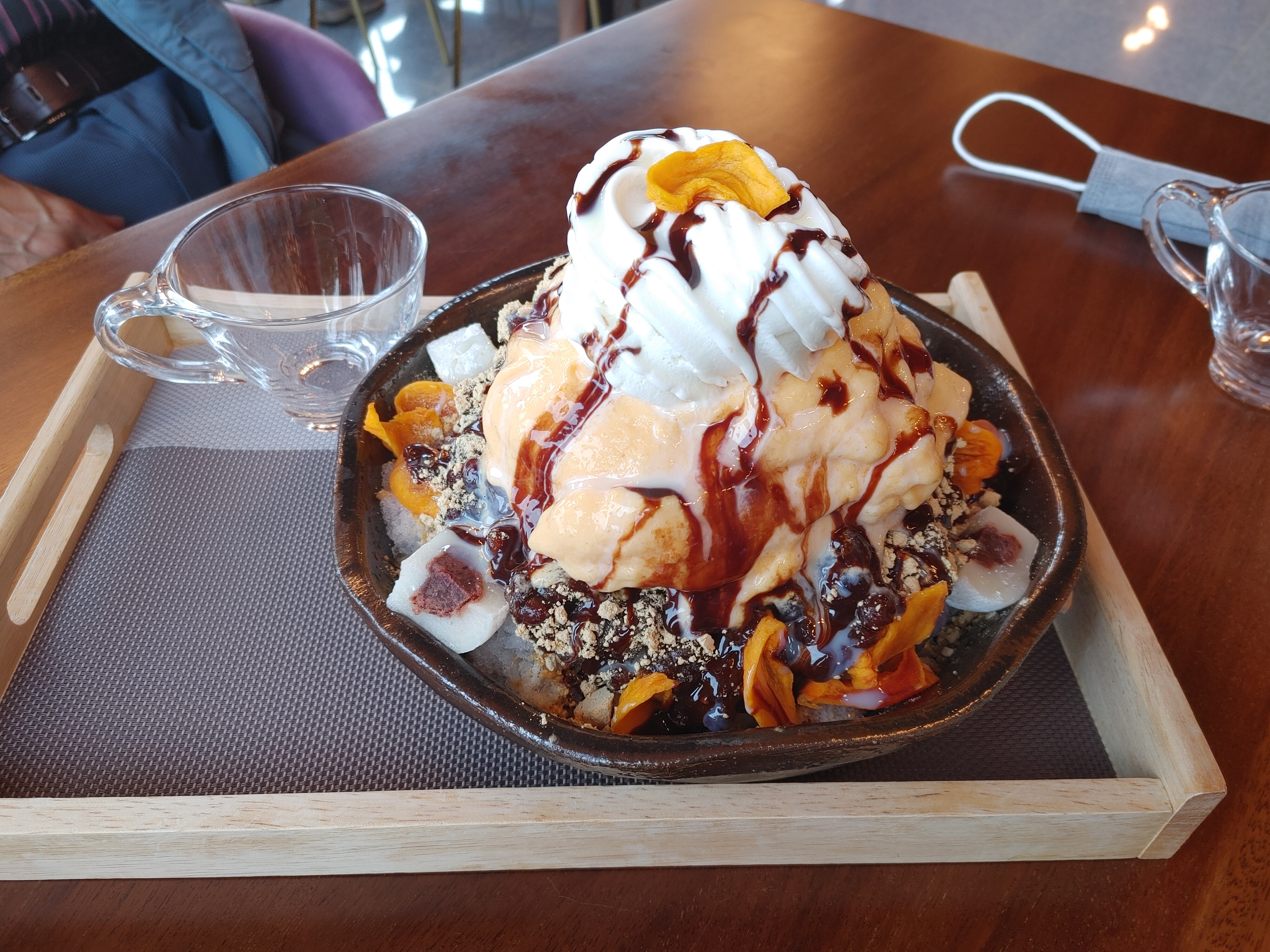 비주얼이 엄청났던 홍시 팥빙수. 속에 얼음은 일반 얼음(물)이 갈려져 있고 그 위에 팥과 감말랭이, 찹쌀떡과 감 퓌레에 아이스크림까지 탑을 쌓았다. 굉장히 특색 있고 맛있었다. 양도 많아서 4명이서 먹기에 충분했다. 추천♥
