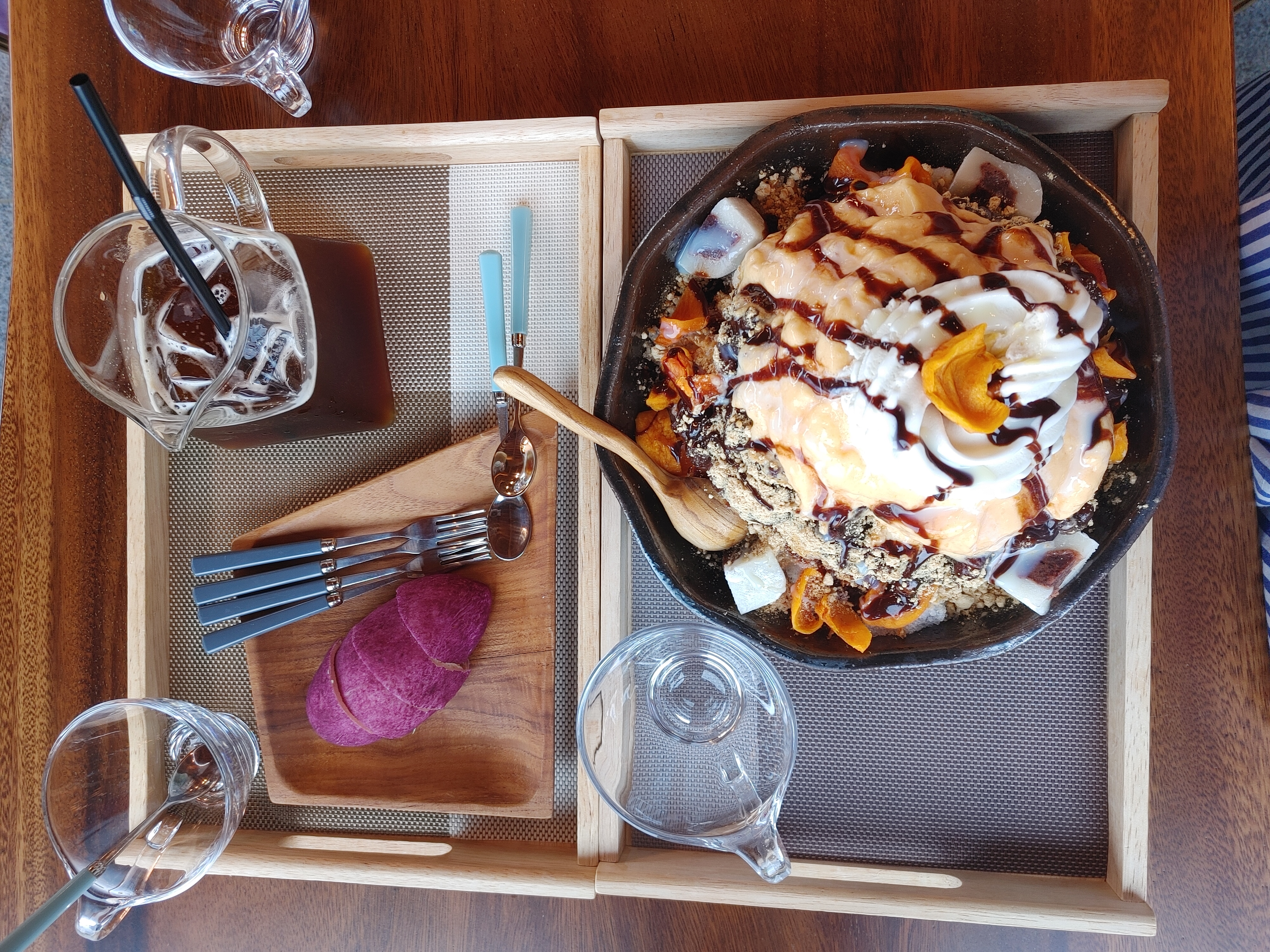 우리는 홍시 팥빙수, 유기농 죽염 커피, 고구마빵을 주문했다.