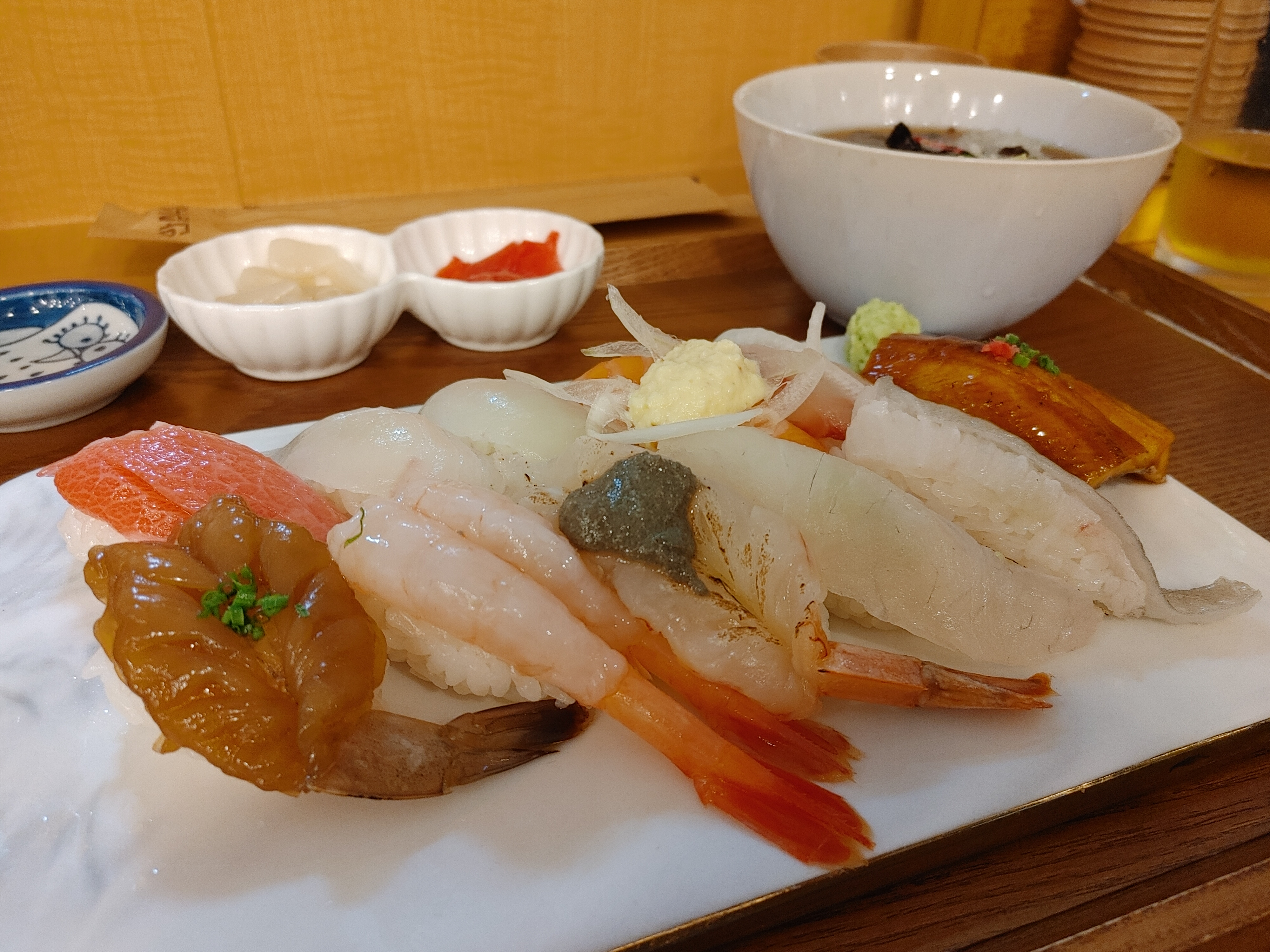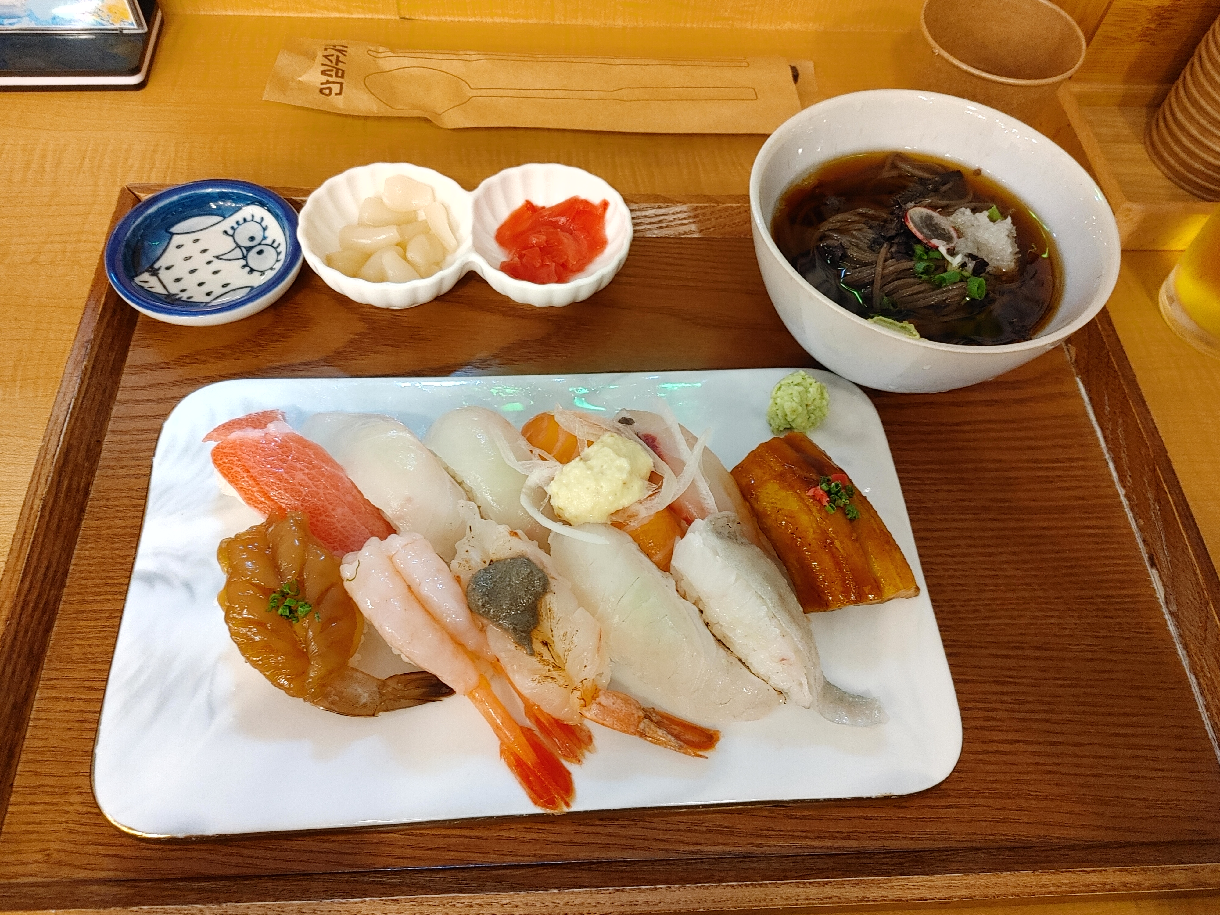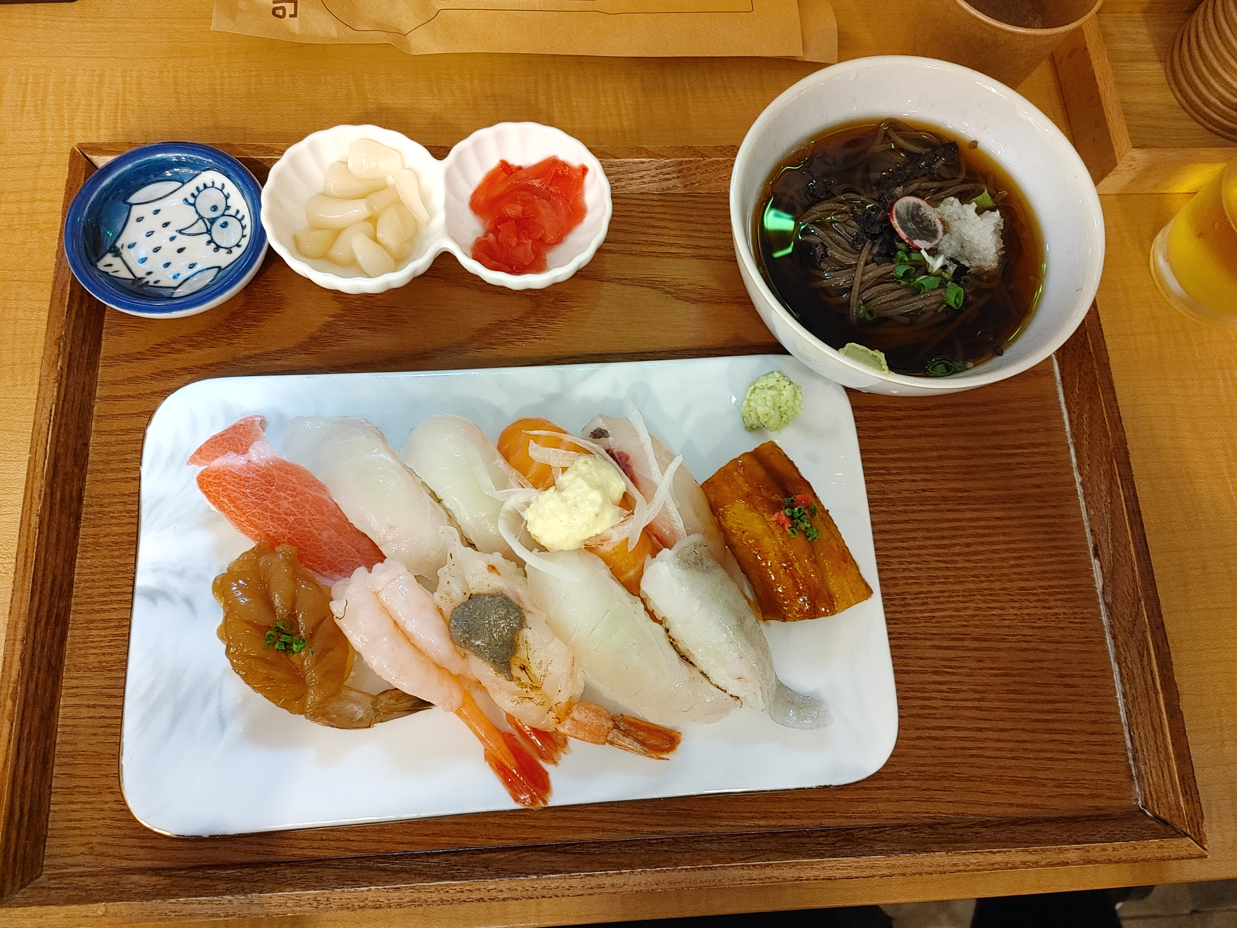 홍제동 특초밥은 연어, 도로, 참돔, 장어, 광어, 엔가와, 새우 등으로 구성되어 있다. 그리고 미니 우동과 미니 모밀 중 선택할 수 있는데 우린 모밀으로 주문했다.