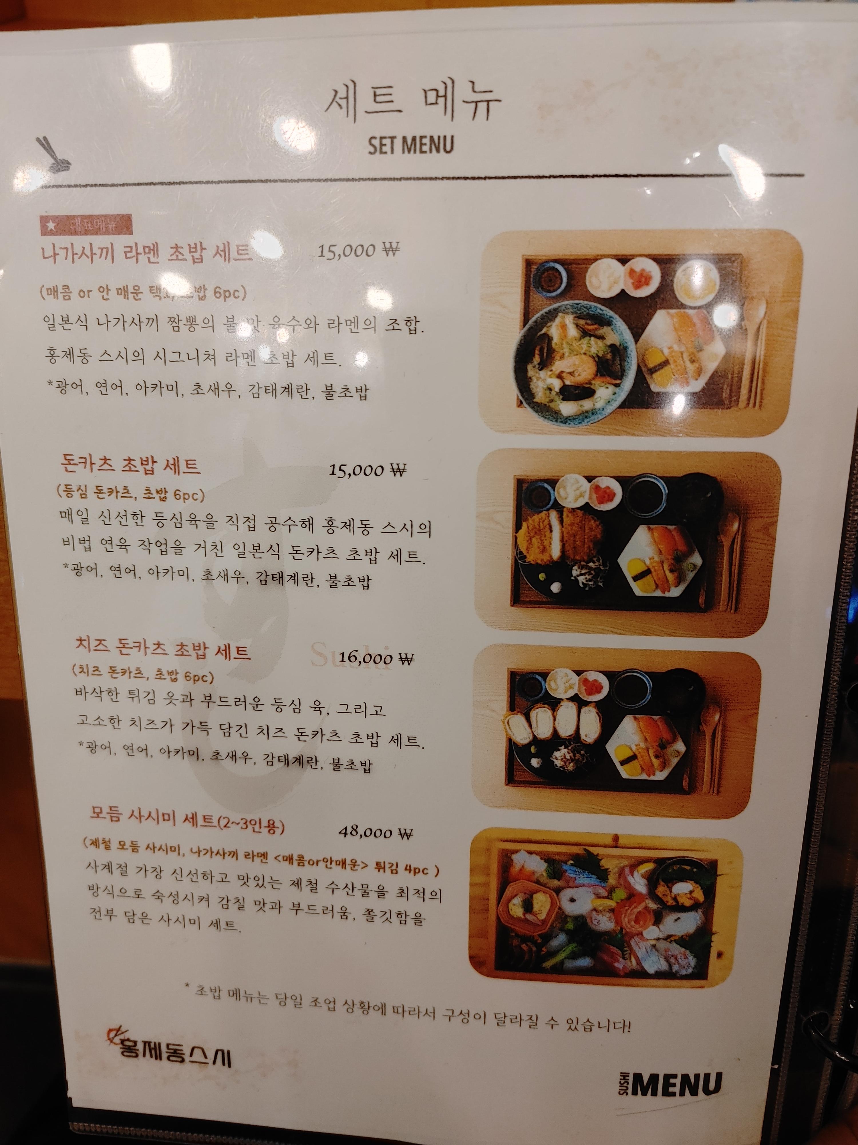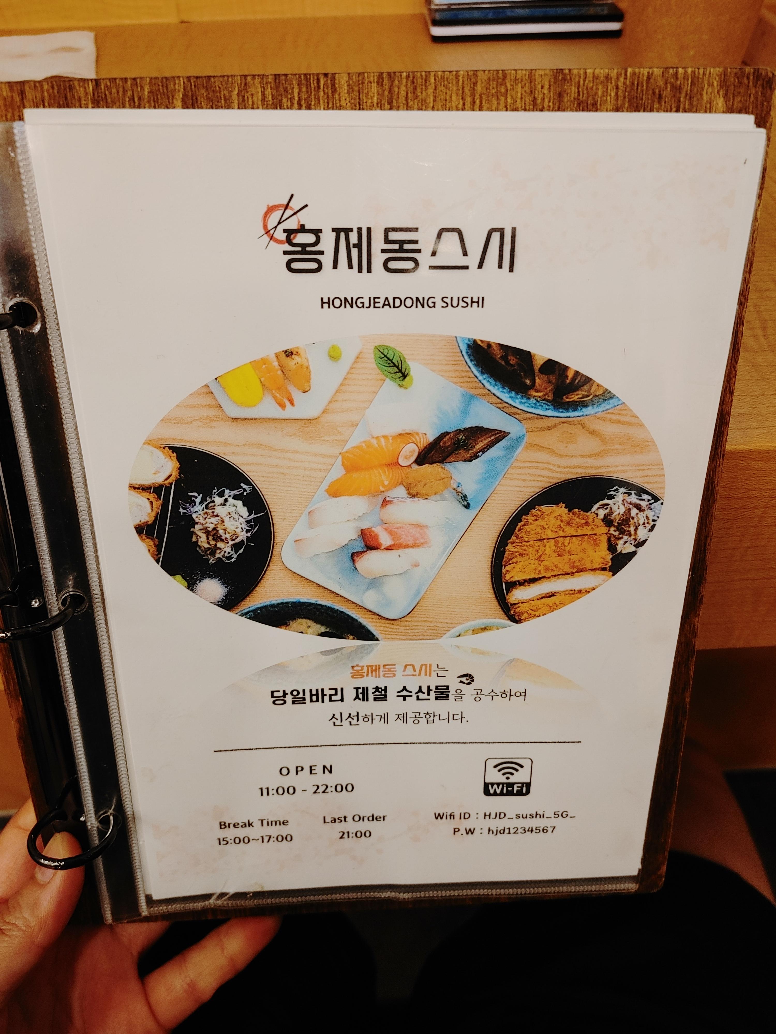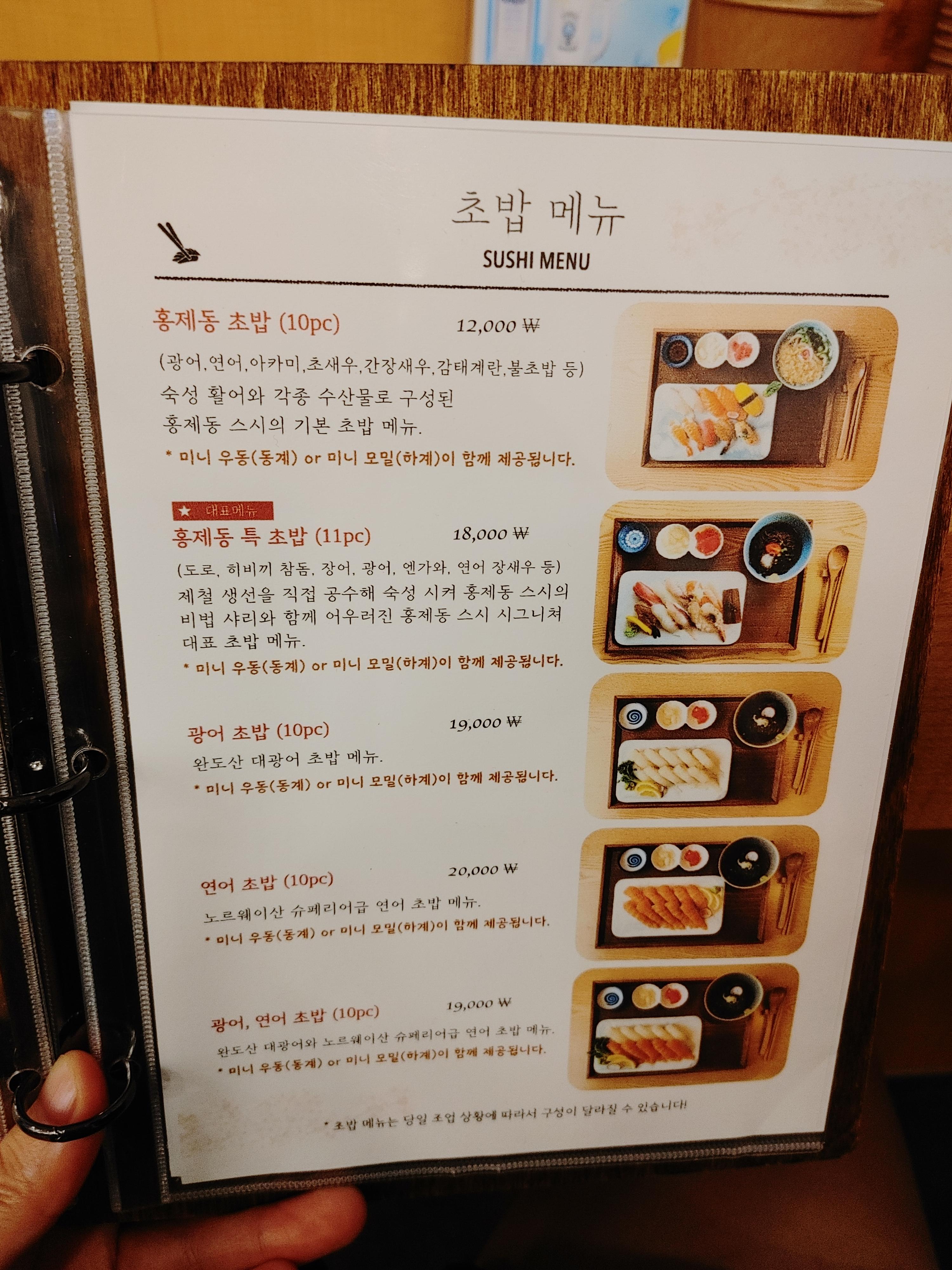 '홍제동스시'는 초밥 전문점이다. 싱싱하고 다양한 초밥을 제공하는 곳. 초밥뿐만 아니라 사시미, 우동, 라멘, 돈까츠도 판매한다. 가격은 메뉴판을 참고하시길.