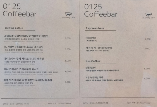 0125 커피바 메뉴판. 메뉴가 엄청 간소했다. 드립 커피와 에스프레소 커피, 밀크티와 녹차라테뿐이었다.