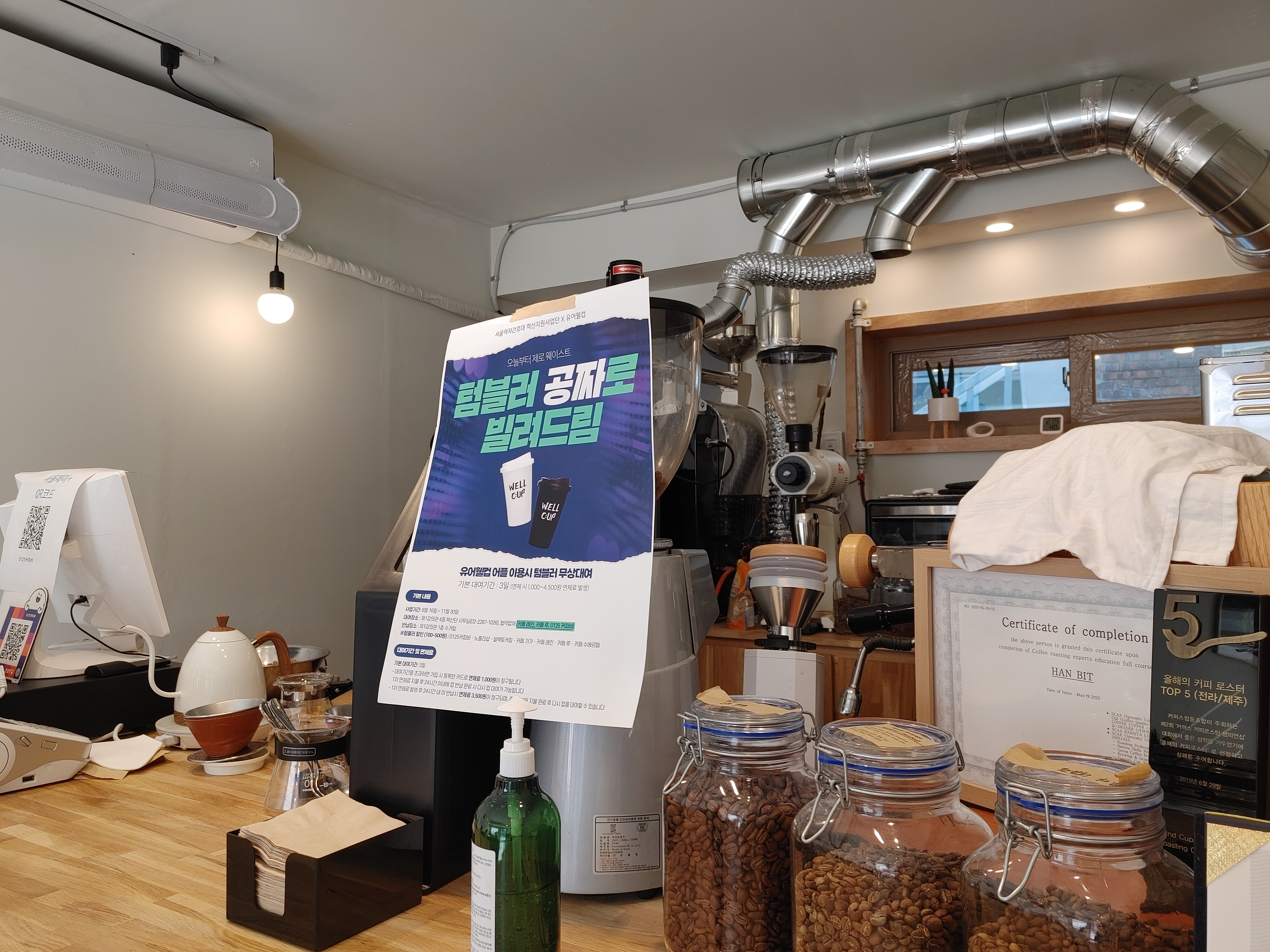 작은 공간이지만 매장에서 직접 원두를 볶으시는 거 같았다. 많은 상장들도 보였는데 사장님의 커피에 대한 애정이 듬뿍 느껴졌다.