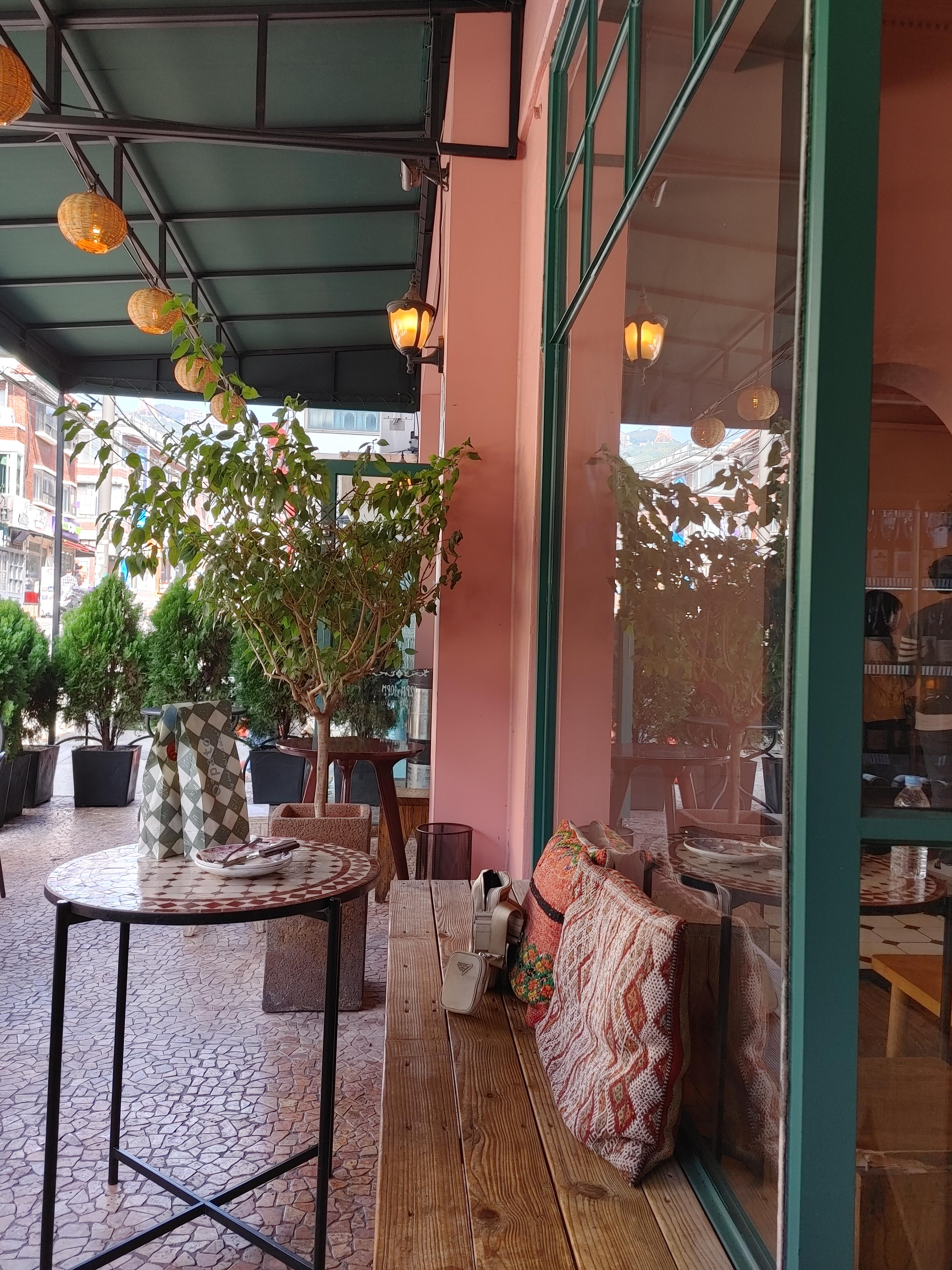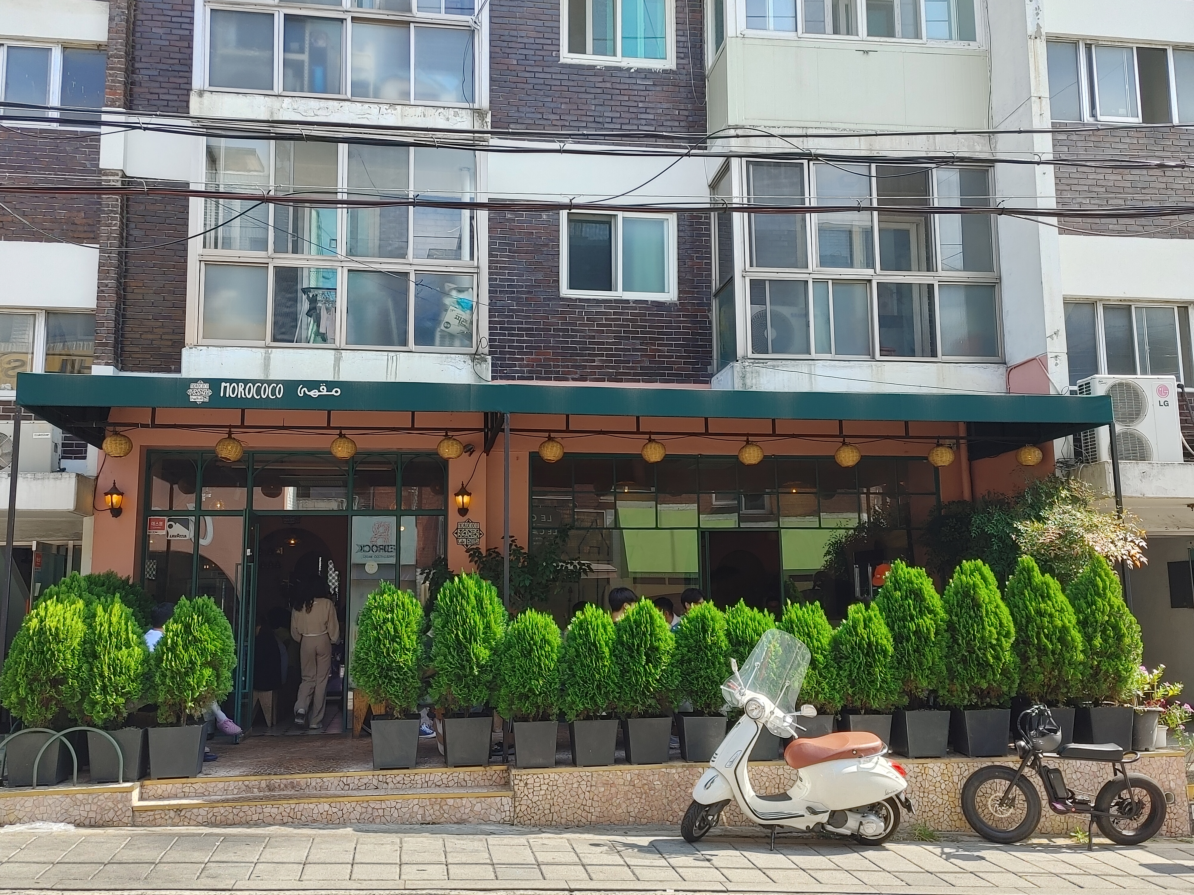 모로코코 식당 외부 모습! 귀여운 나무들이 화분에 담겨있다. 이게 울타리라고 볼 수 있는데 나무 안쪽으로 테라스 자리도 있었다. 날씨가 좋아 테라스 자리로 찜콩!
