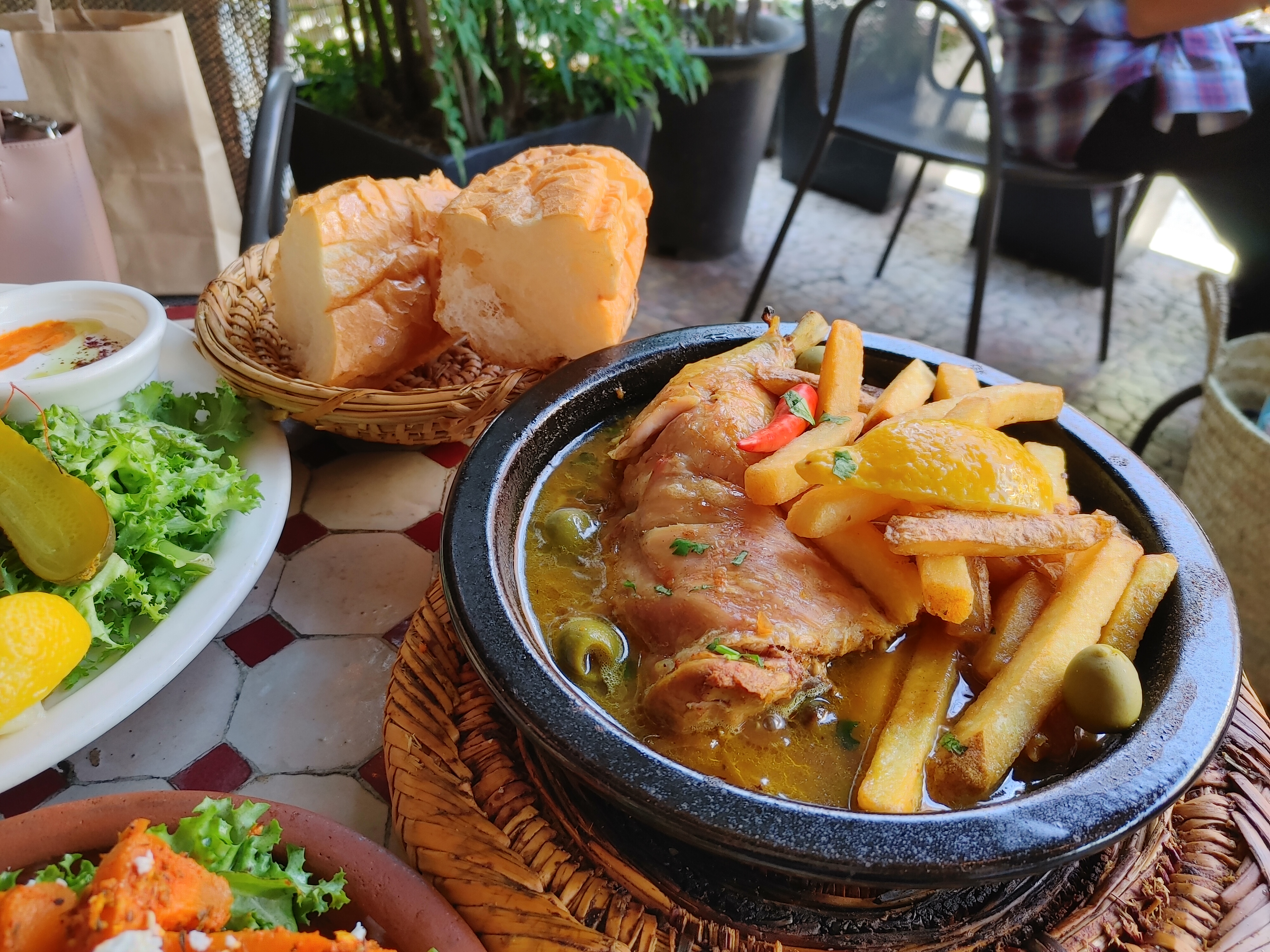 이 메뉴는 레몬 치킨 타진이다. 가격은 14,000원. 빵도 같이 준다. 푹 삶은 닭고기가 상당히 부드러웠다. 소스는 찜닭 맛과 약간 느낌이 비슷한데 스타일은 백숙과 비슷하달까? 감자튀김도 잔뜩 올라갔다. 빵도 부드럽고 맛있었다.