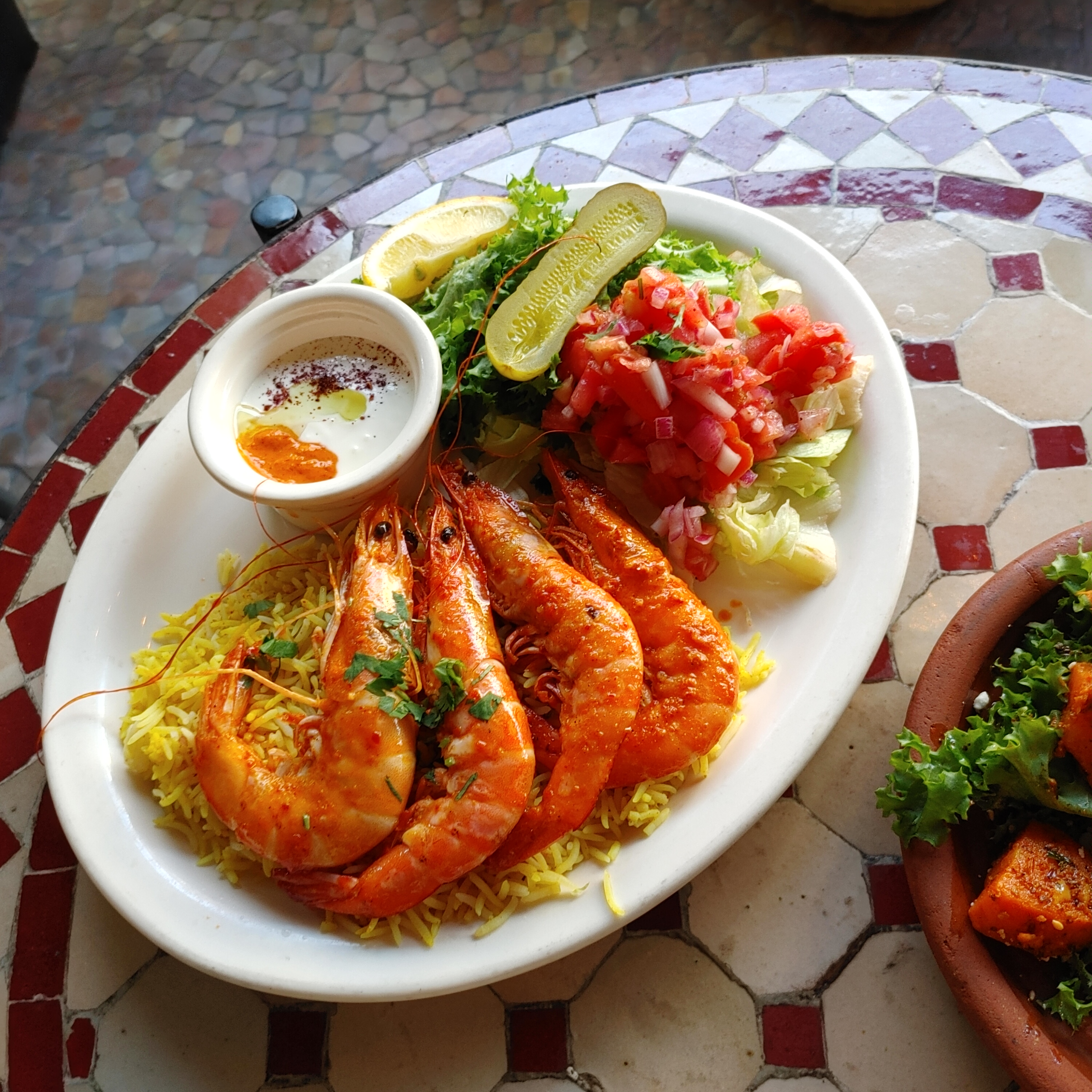 이 메뉴는 모로코 오버 라이스인데 새우 토핑으로 골랐다. 가격은 12,000원. 비주얼도 좋고 맛도 좋았던 메뉴이다. 새우가 크고 통통했고 소스도 무척 맛있었다. 샐러드도 싱싱하고 맛있었다. 쌀 식삼은 특이했지만 맛은 괜찮았고 고수가 조금씩 올라간다.